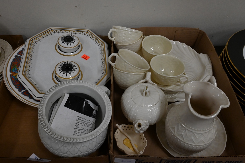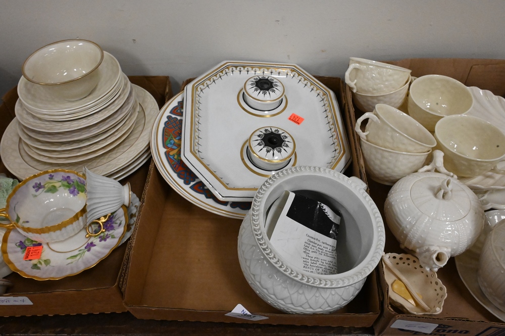 Group of Miscellaneous China and Porcelain, to include Belleek shell dish, plates, cups, saucers, table lamp, etc. Provenance: Collections of Norma Reilly, New Jersey.