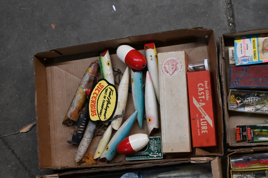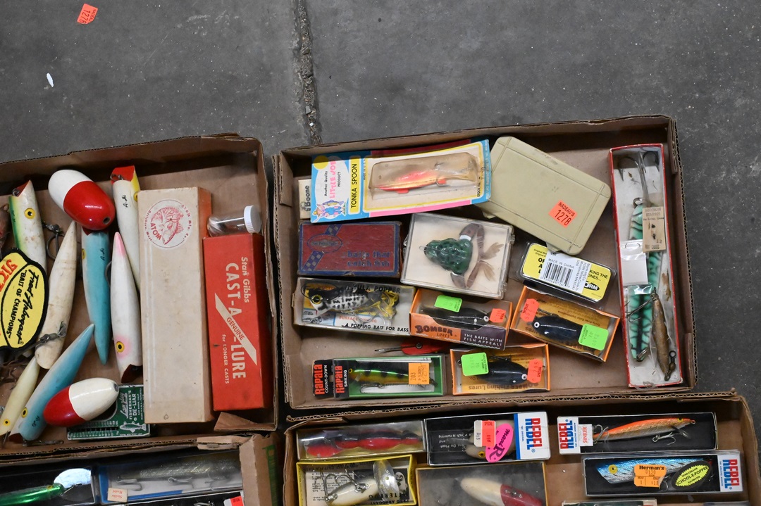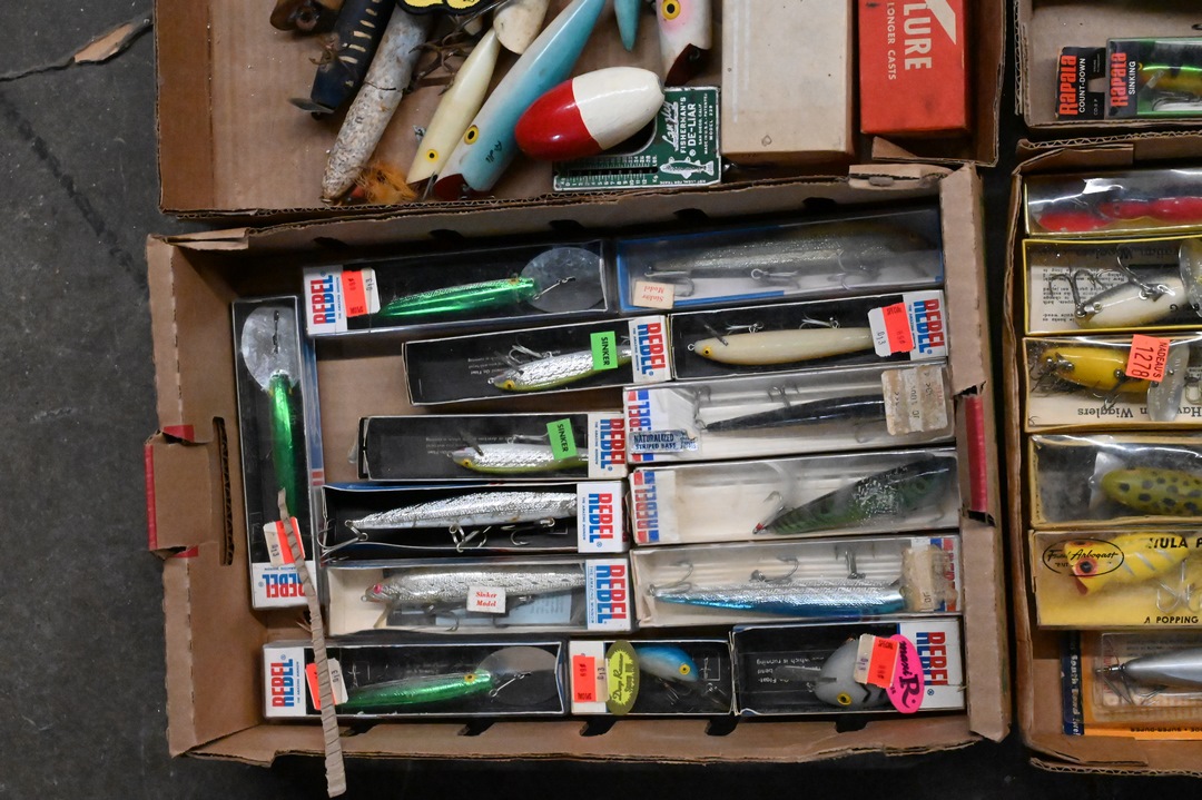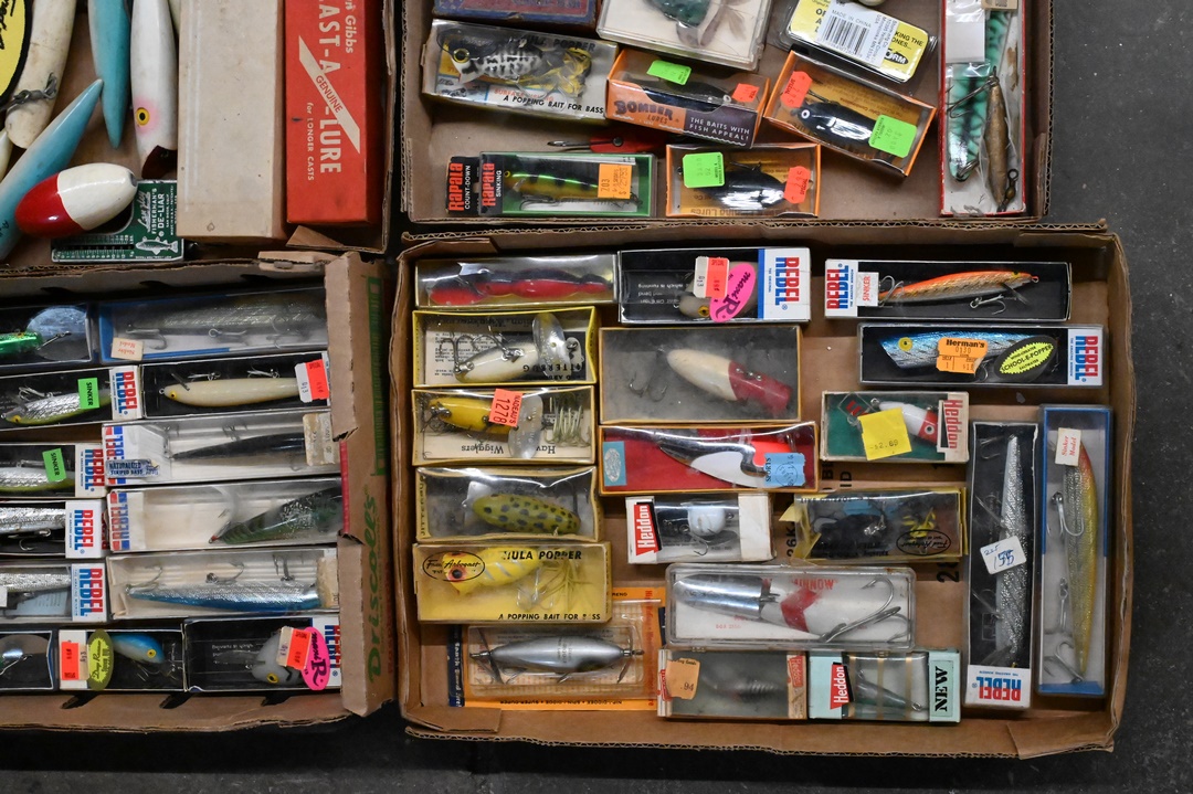Group of Mostly Boxed Fishing Lures, brands include Rebel, Stan Gibbs, Heddon, Bomber, along with others. Provenance: Estate of Peter Tillou, Litchfield, Connecticut.