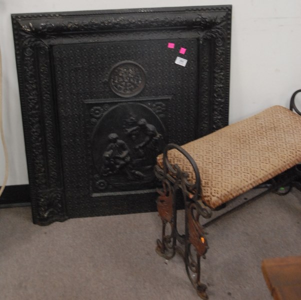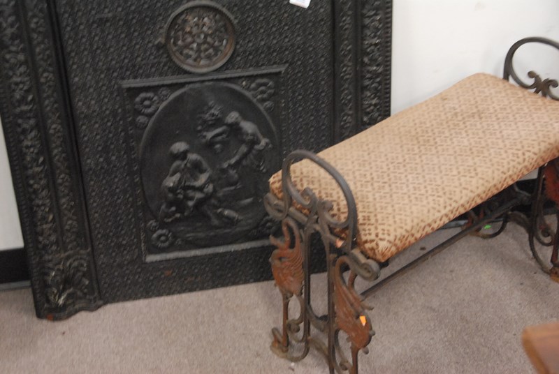 Iron bench and Iron fireplace cover. ht. 33in. wd. 30in.