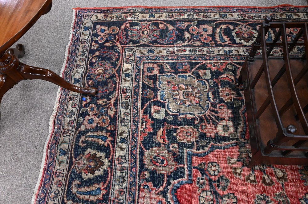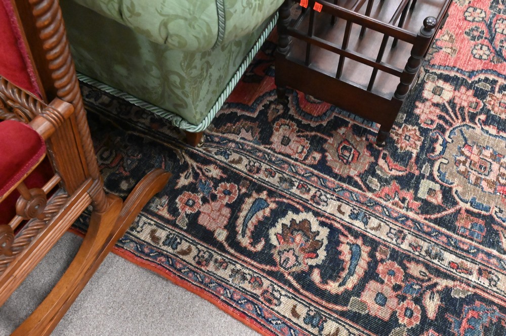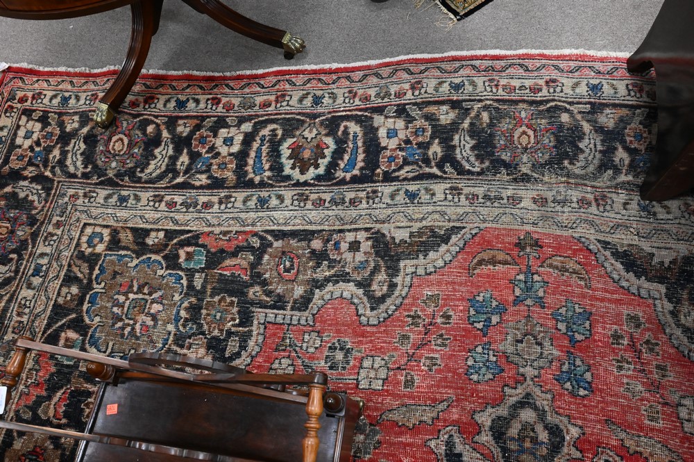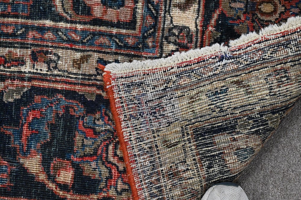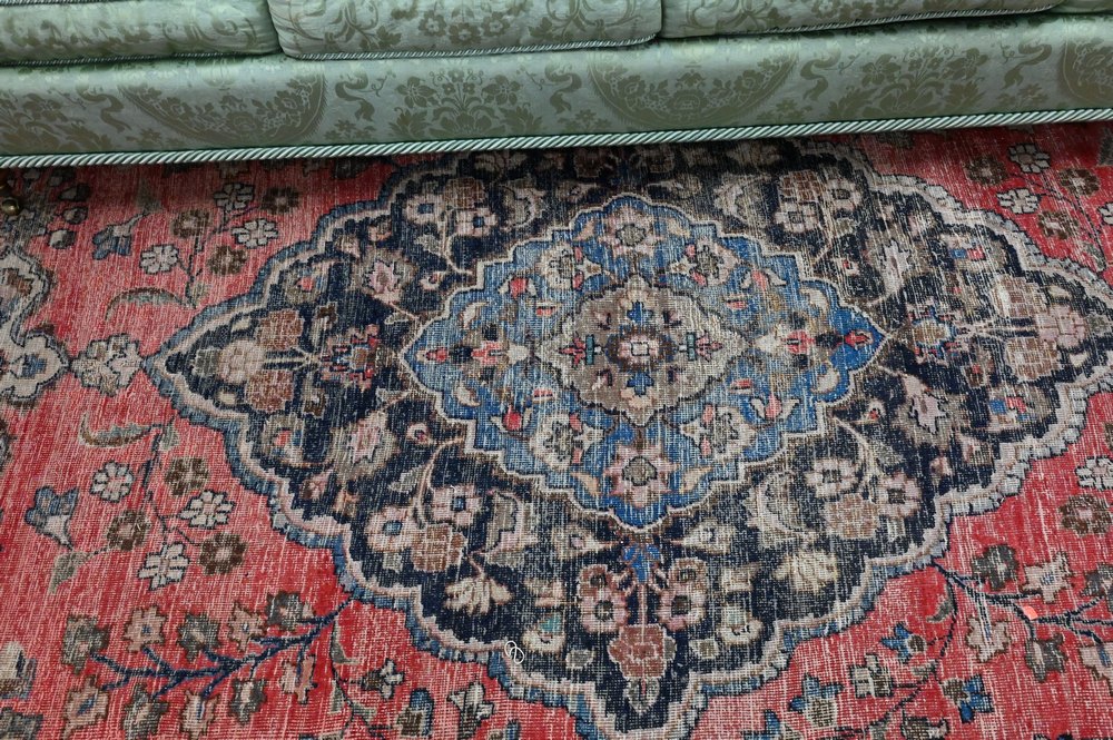 Oriental Carpet, worn, 10′ 7″ x 16′ 9″.
