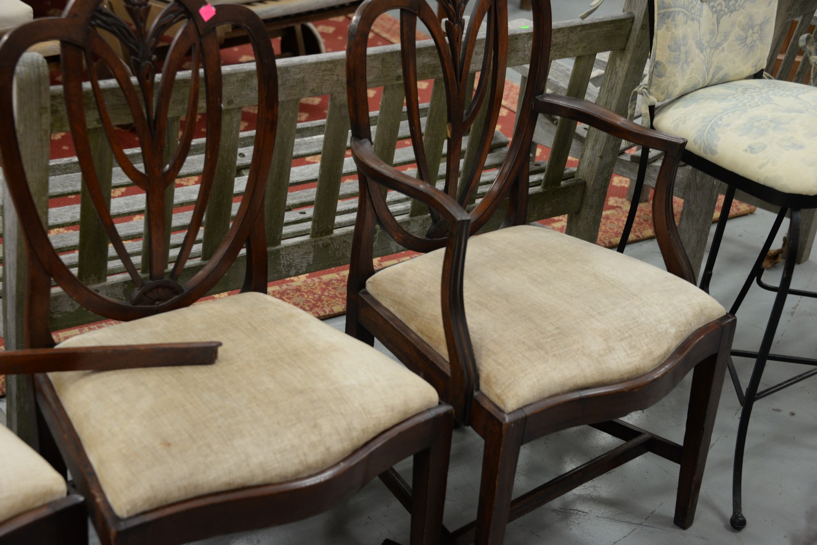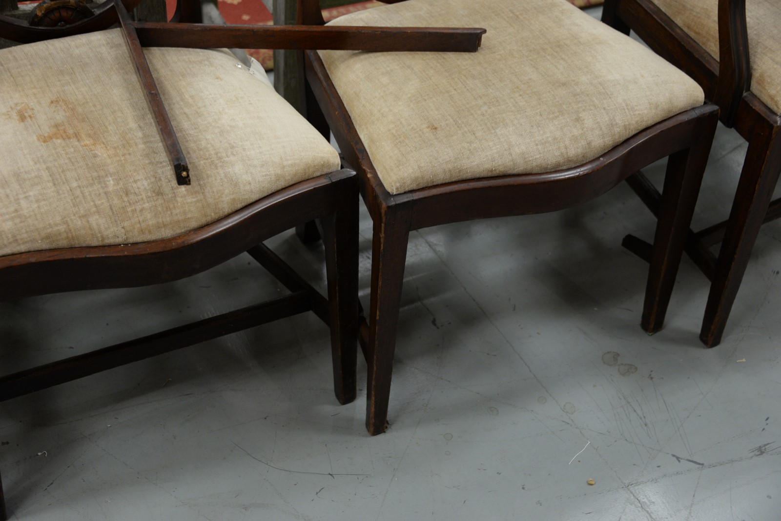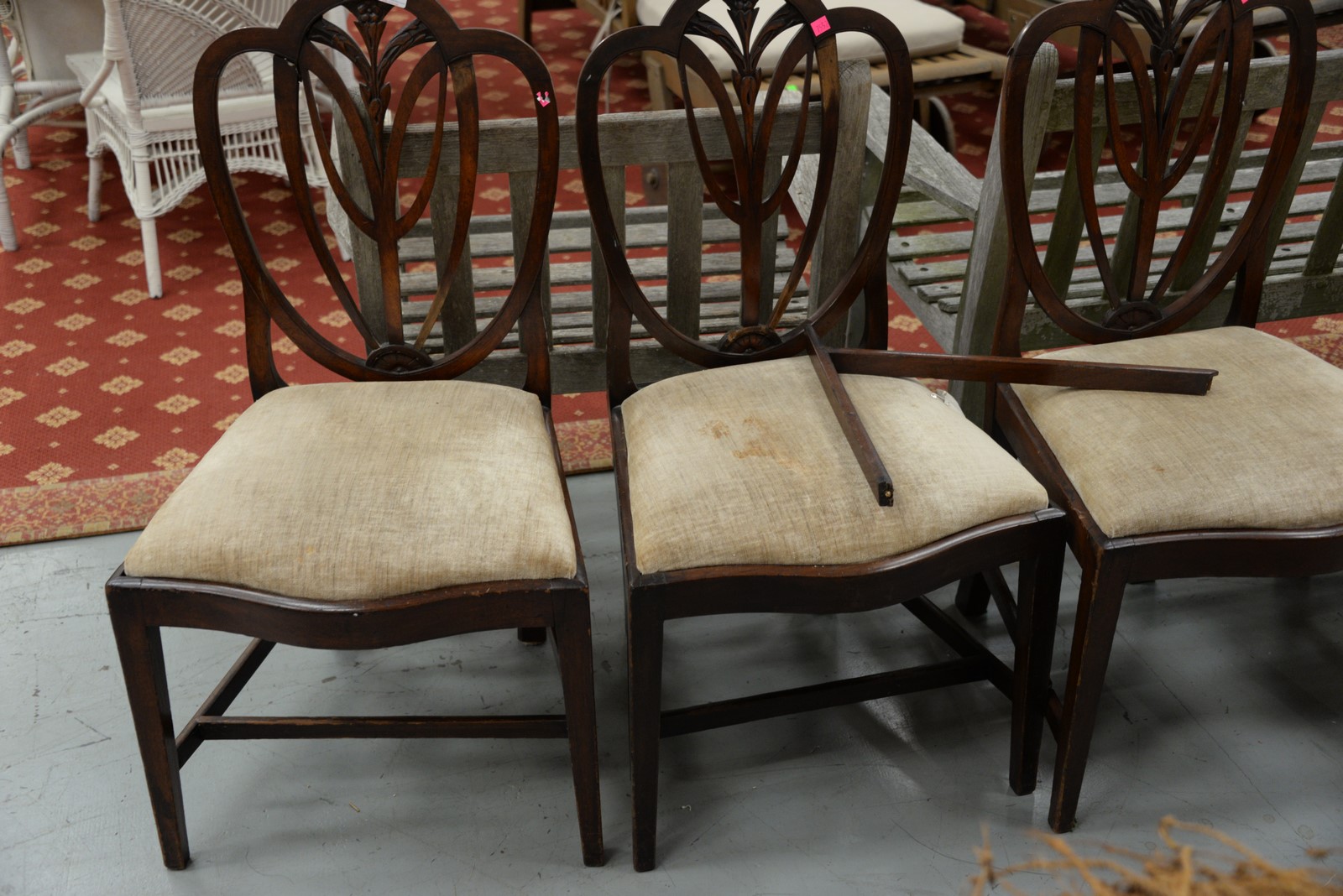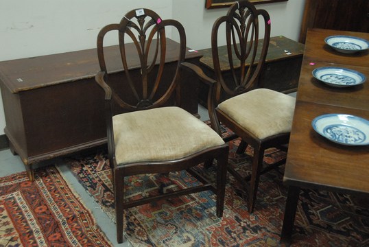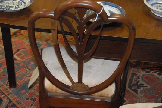 Set of four Federal mahogany chairs, one arm and three side, each with heart shaped backs with fleur-de-lis center with shaped slip seats on square tapered legs with stretchers, circa 1790-1810 imperfections. seat ht. 17 in.