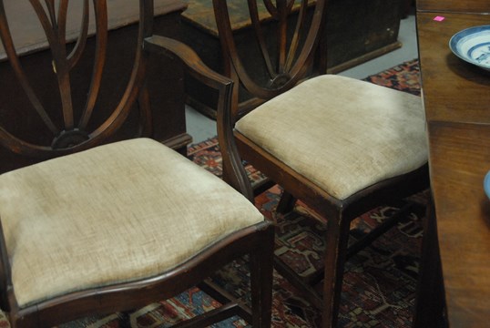 Lot 393: Set of four Federal mahogany chairs, one arm and three side, each with heart shaped backs with fleur-de-lis center with shaped slip…