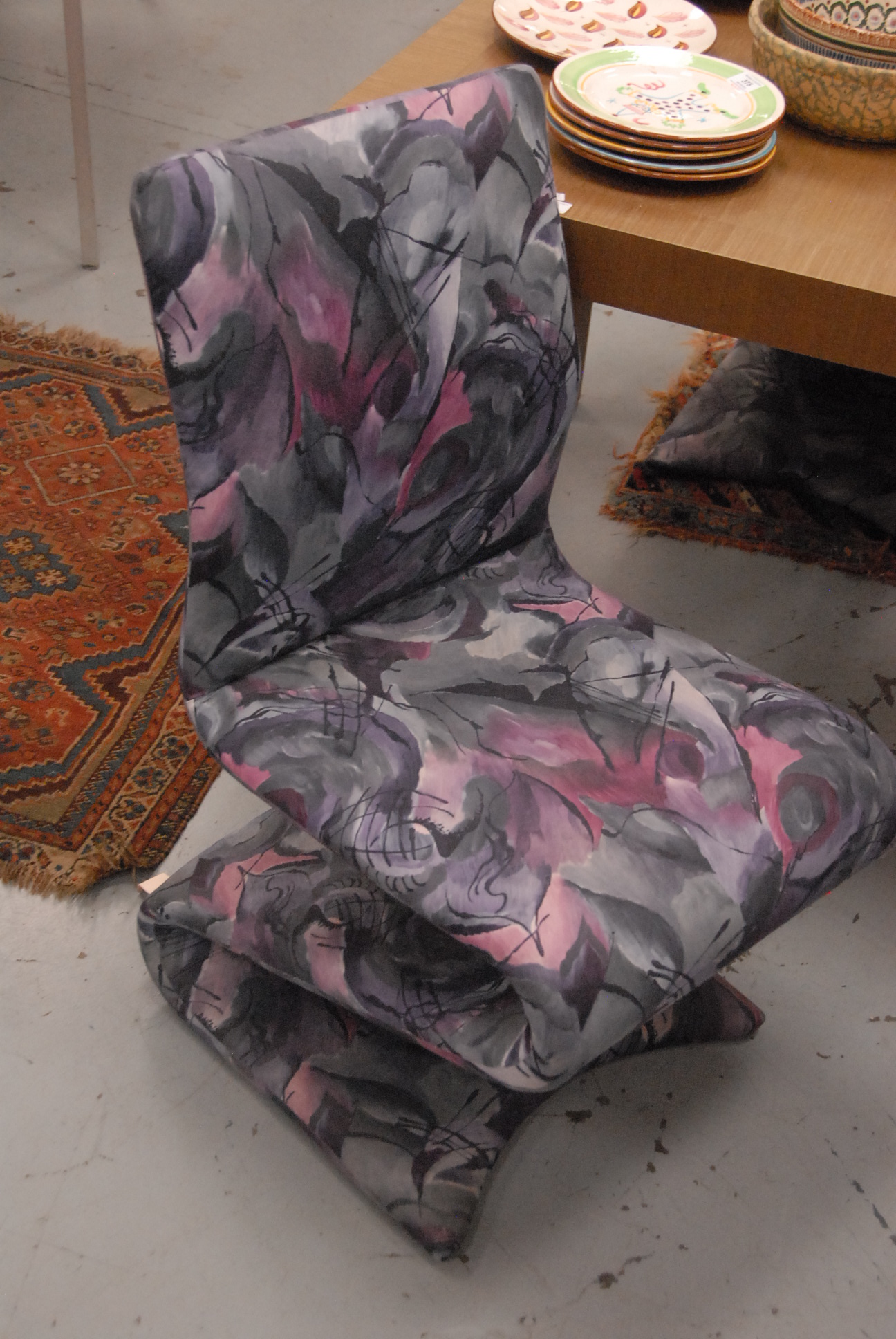 Set of four Z form contemporary upholstered chairs.
