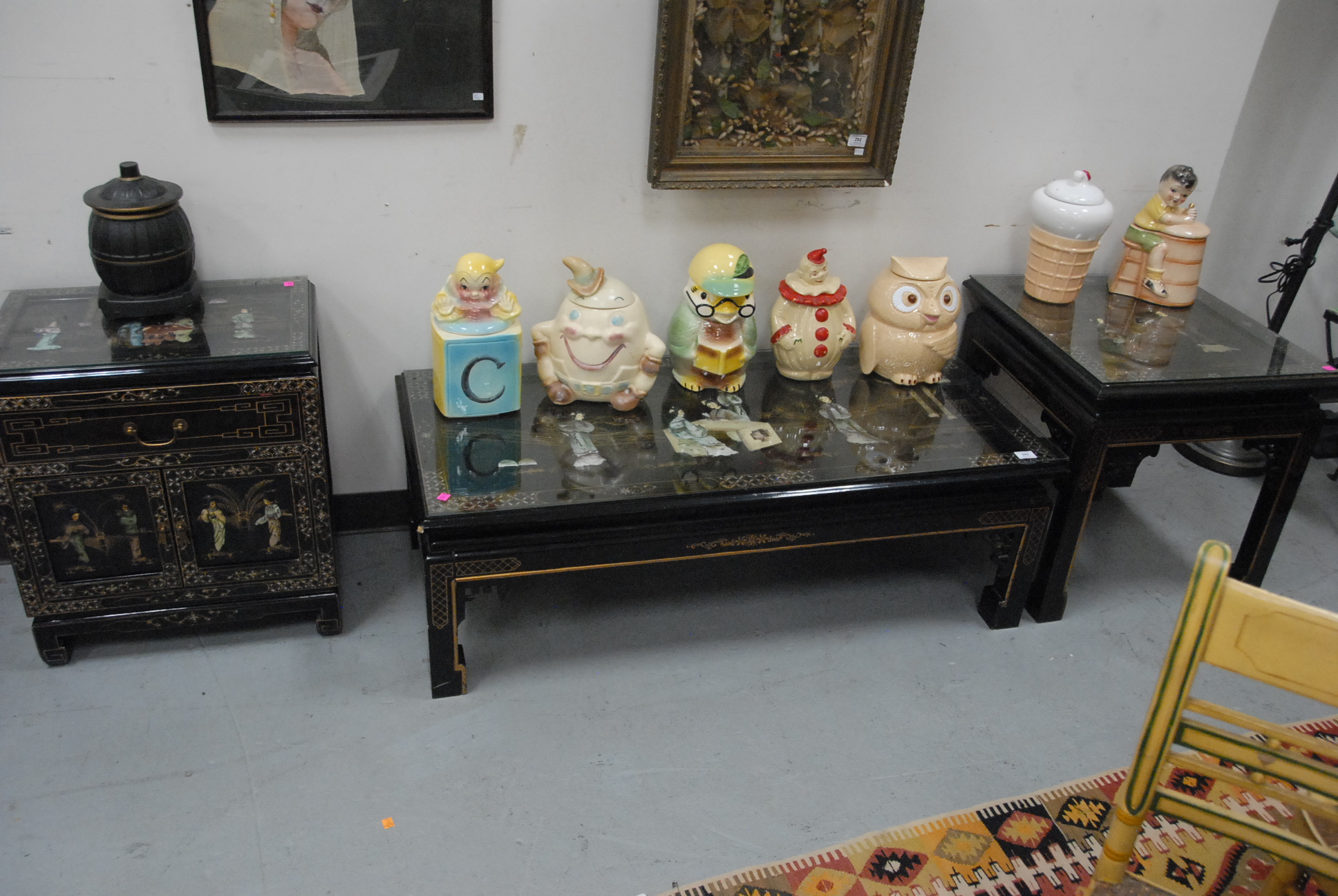 Lot 393: Three Chinese style living room pieces each with raised figures under glass to include coffee table, end table, and small one drawer…