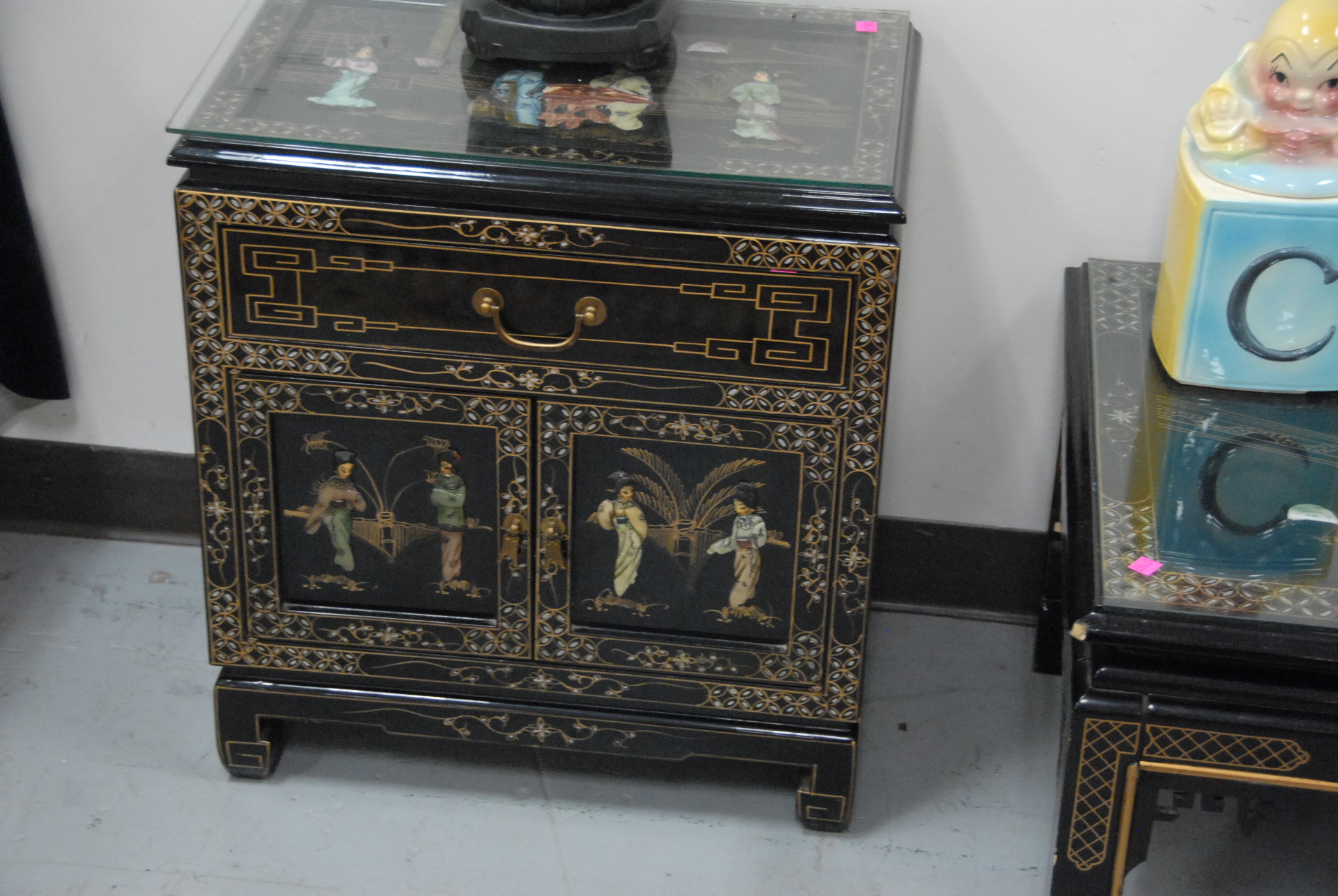Three Chinese style living room pieces each with raised figures under glass to include coffee table, end table, and small one drawer over two door chest.