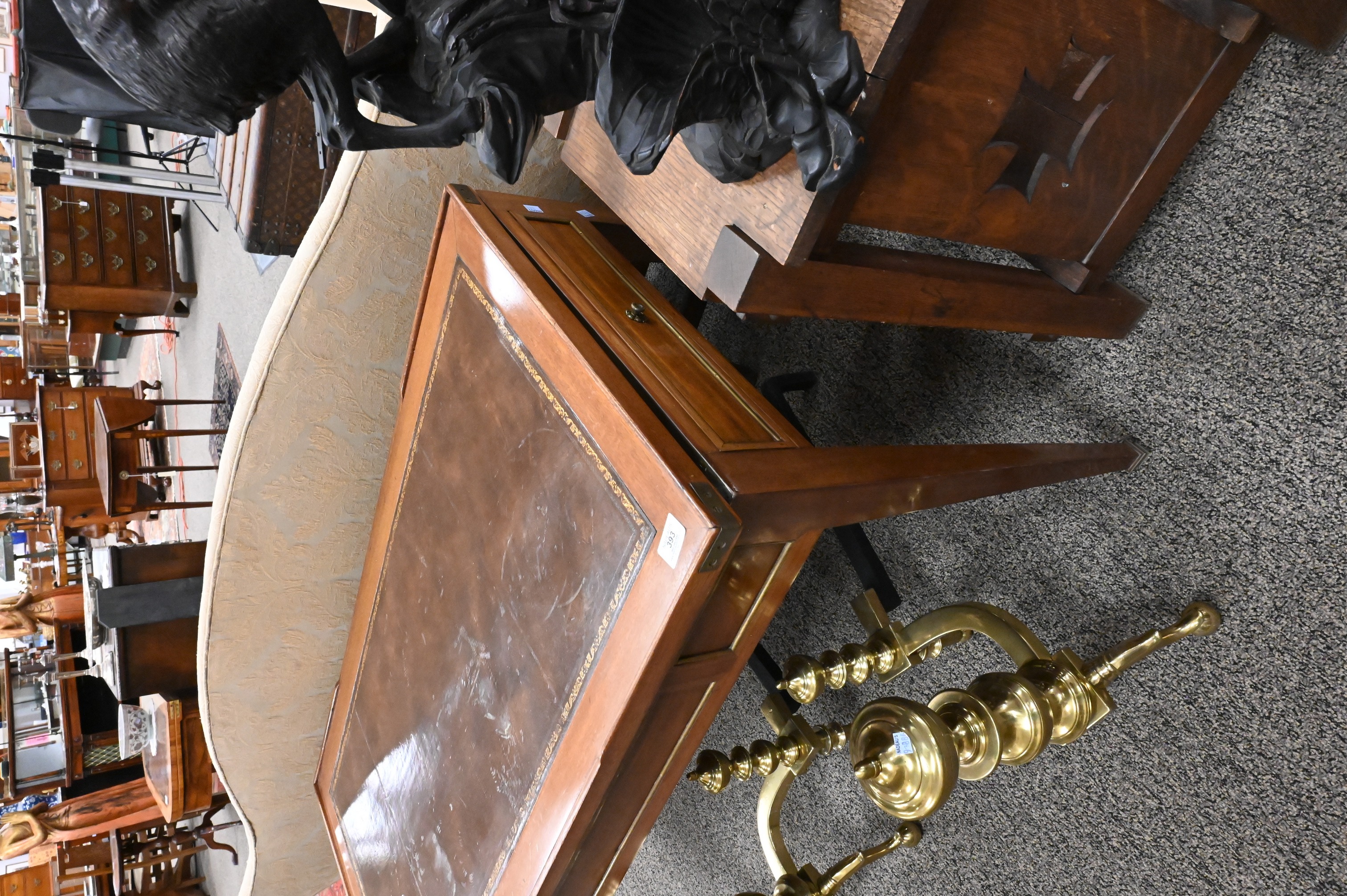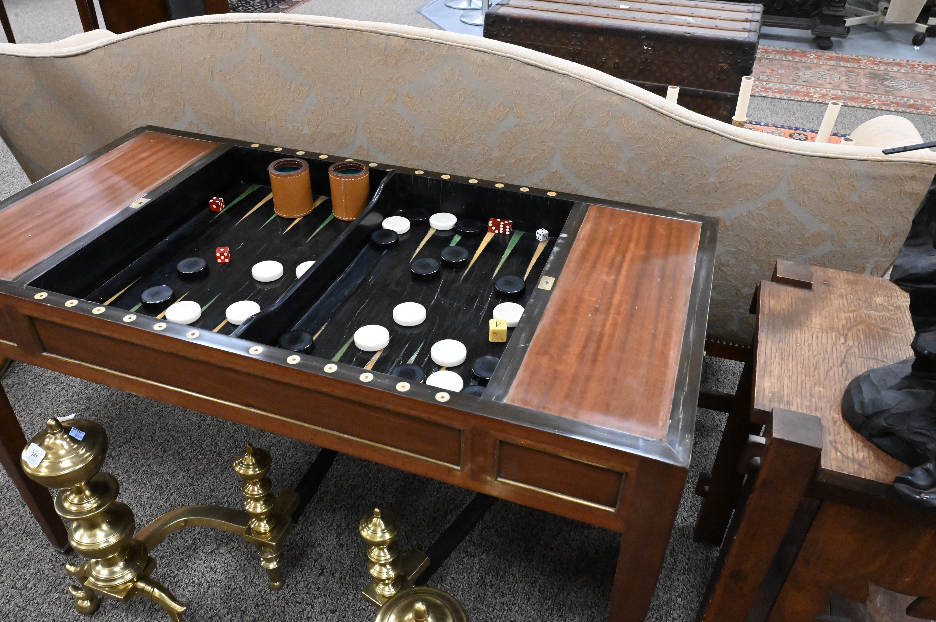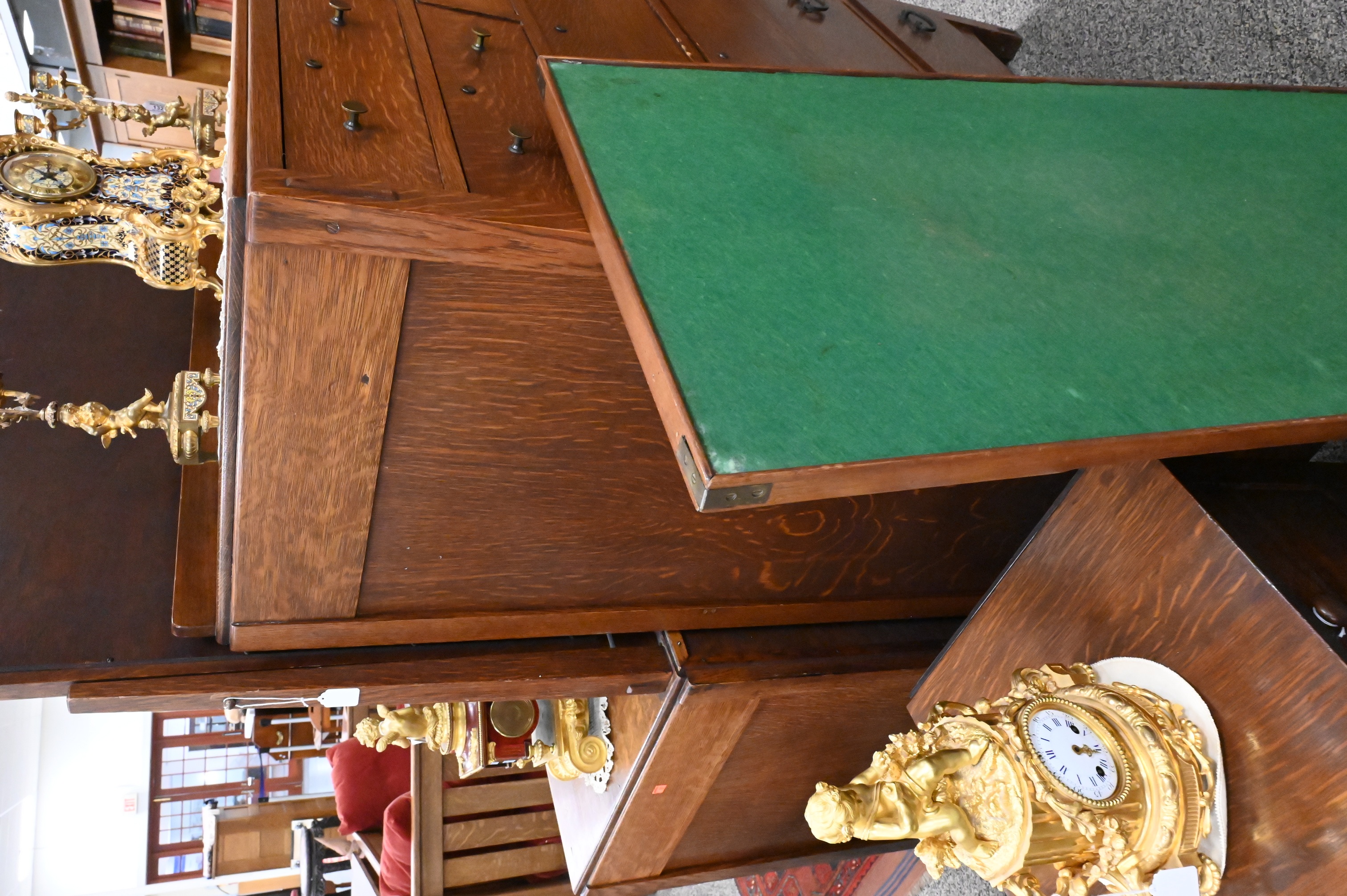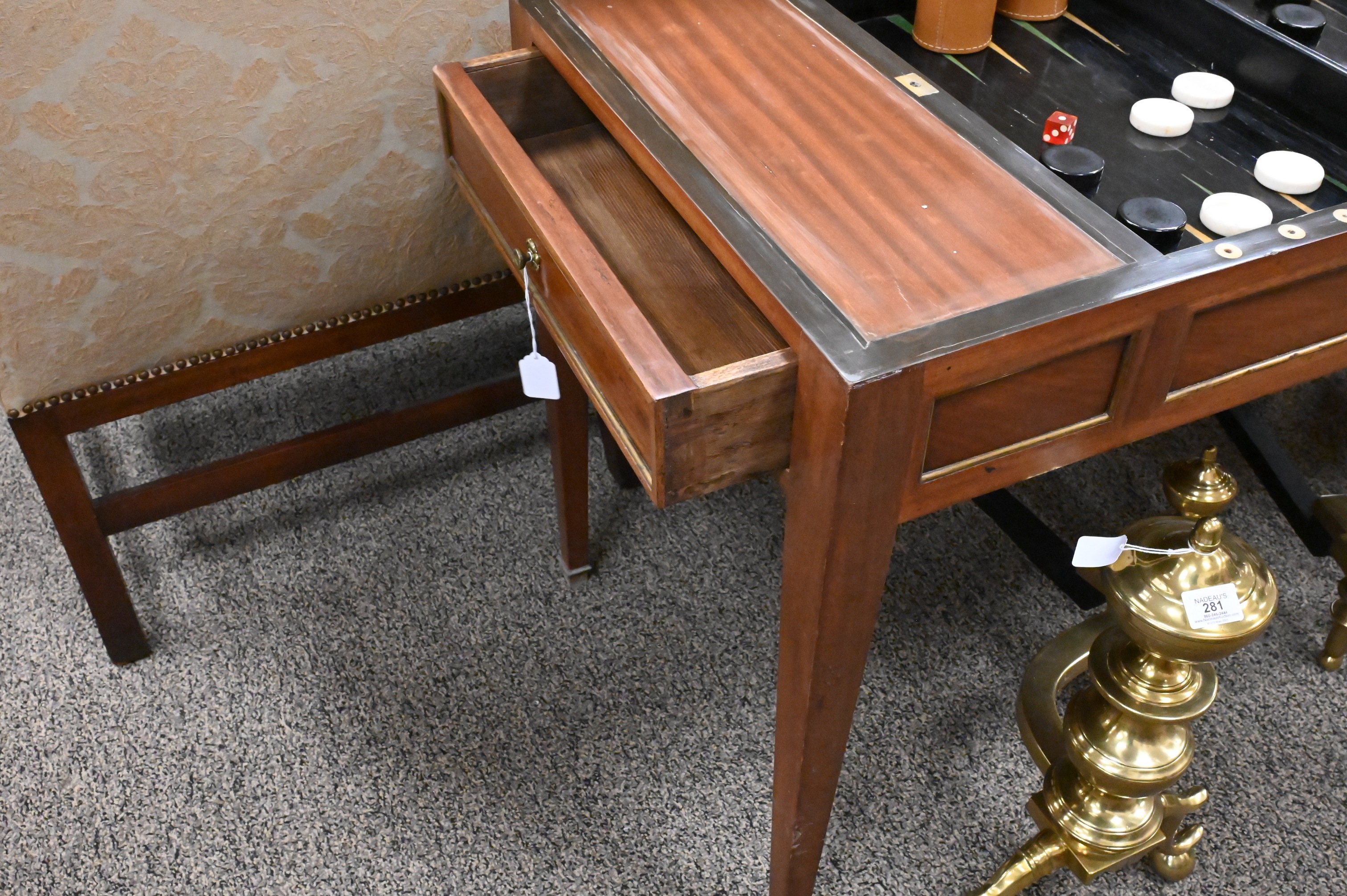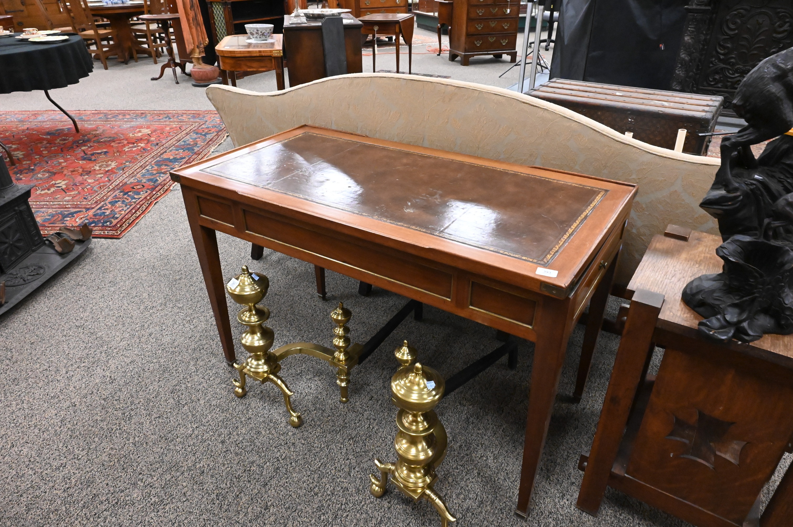 top having leather on one side, felt on opposite side, and framing on inside, drawers on either end all on square tapered legs