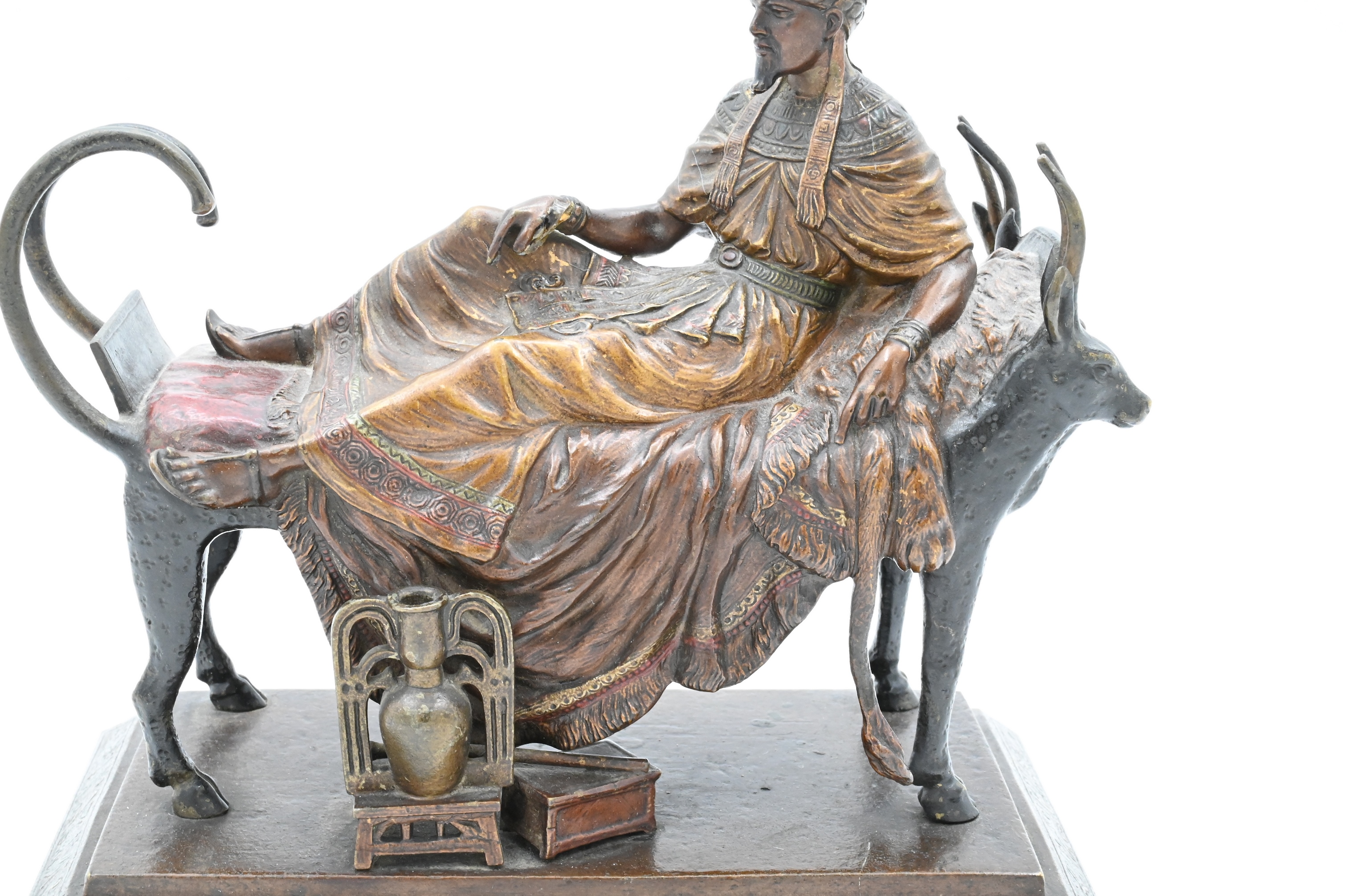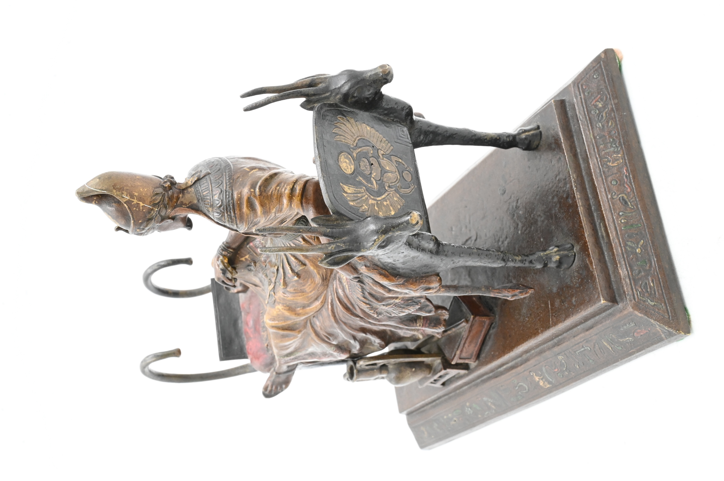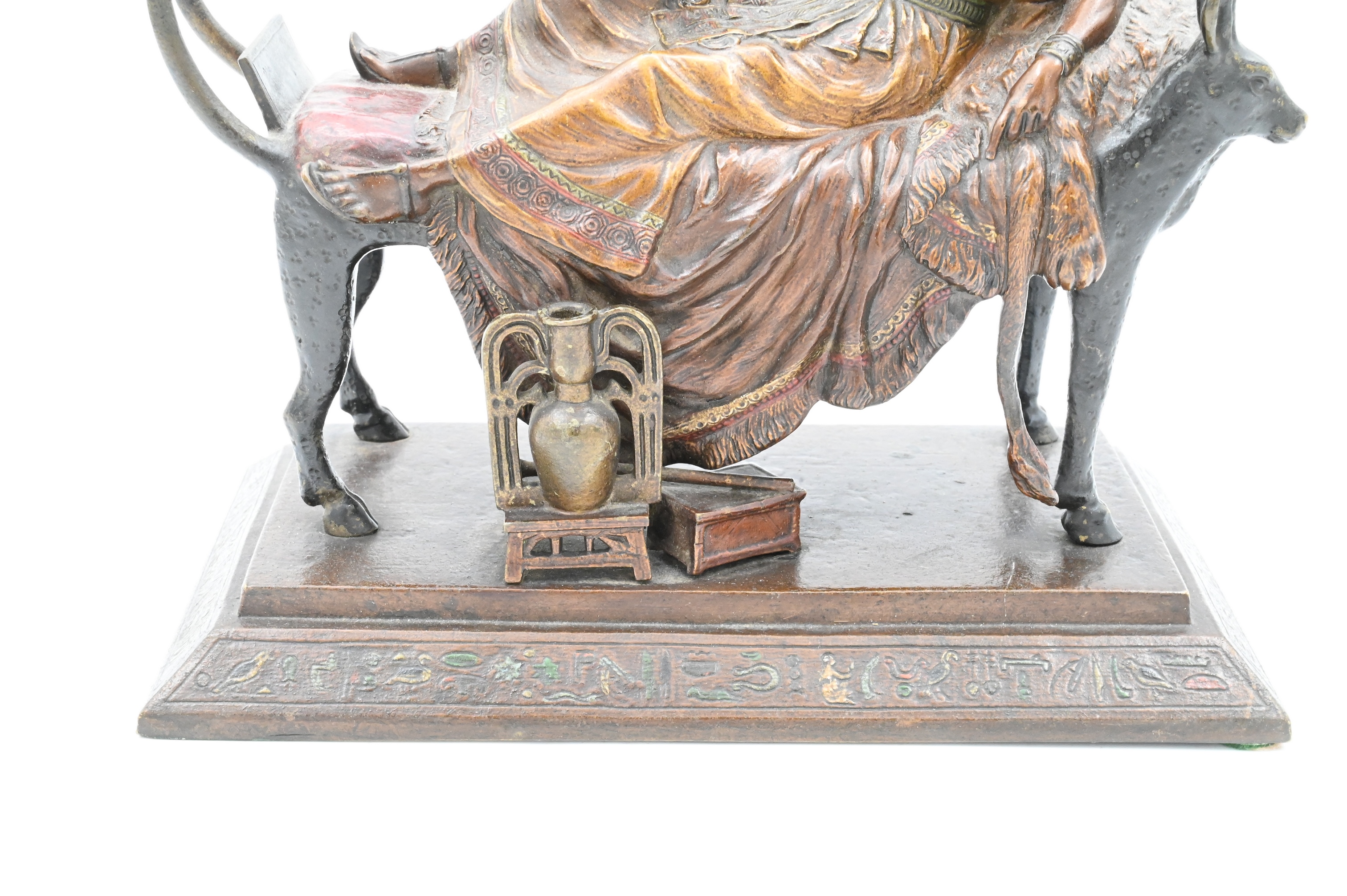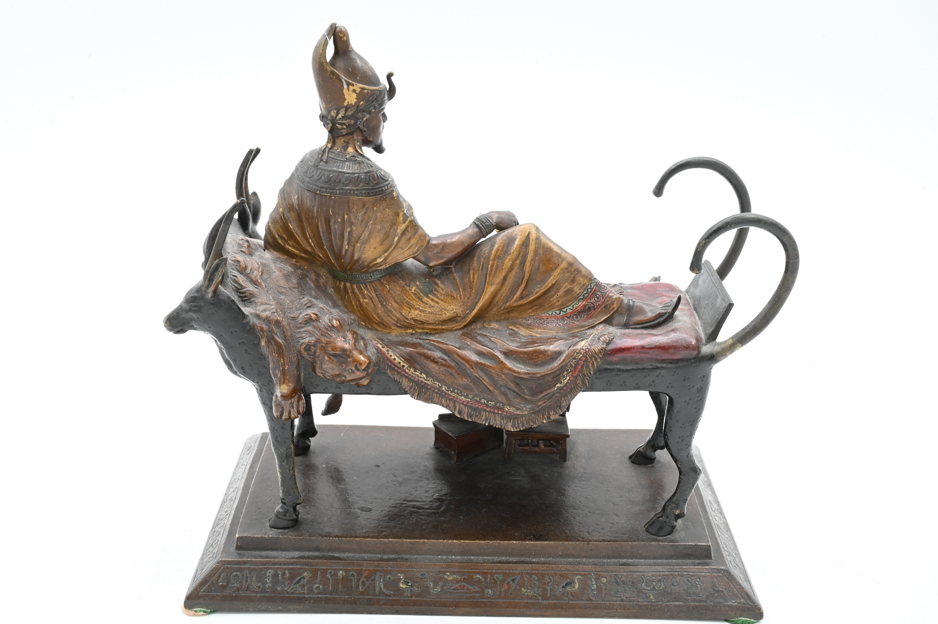 Cold painted bronze of Pharaoh lounging on a funerary bed with animal heads (marks not found)