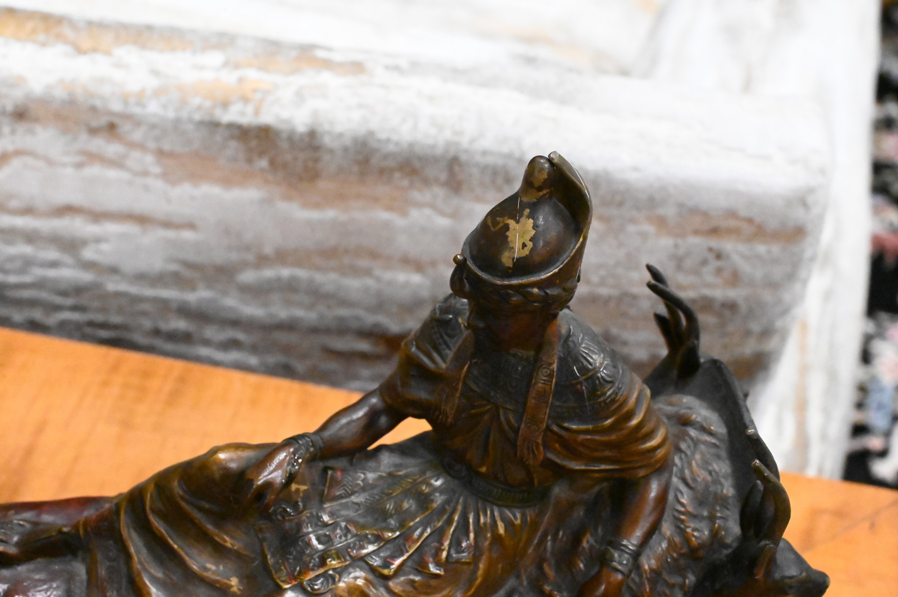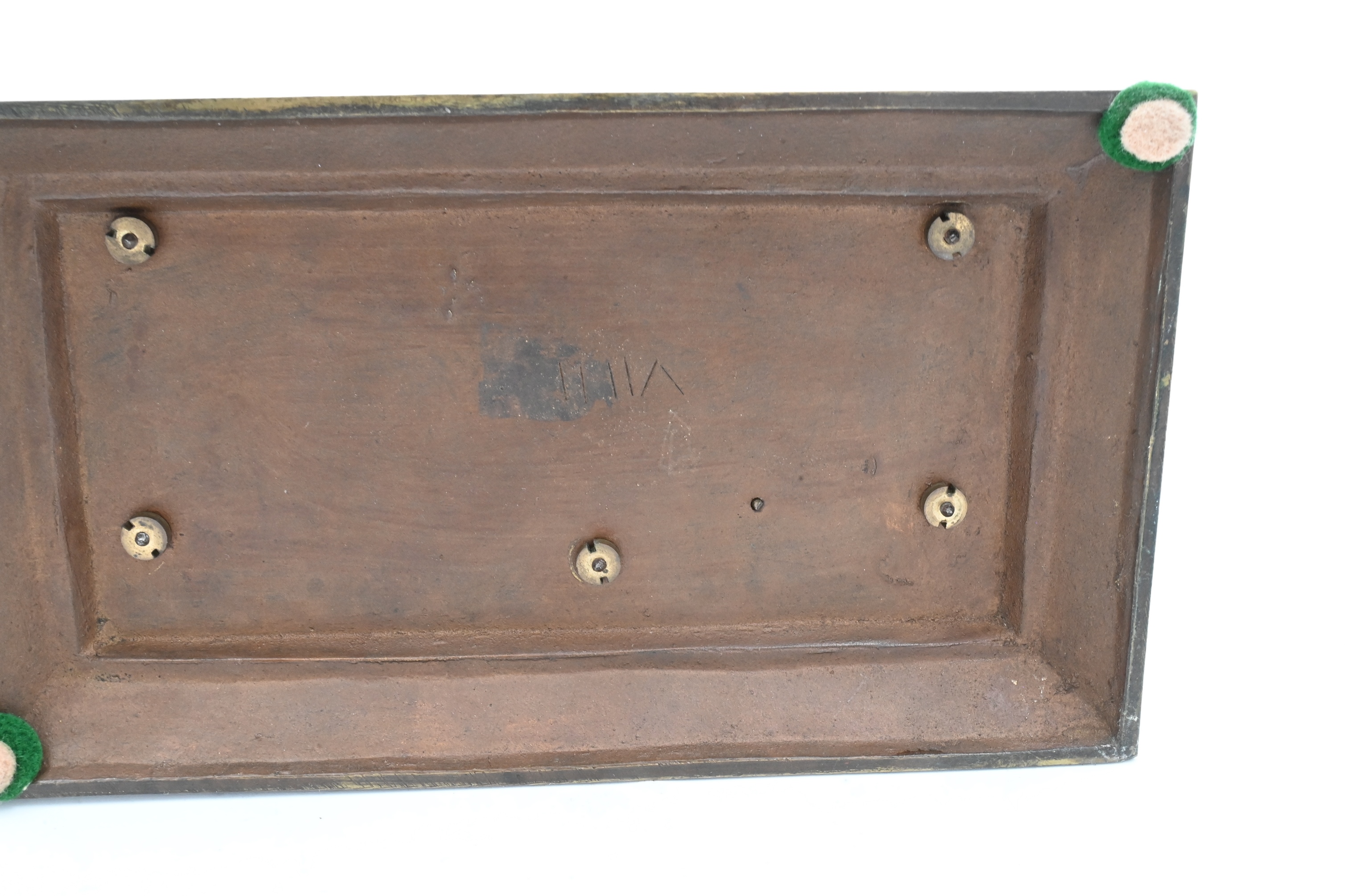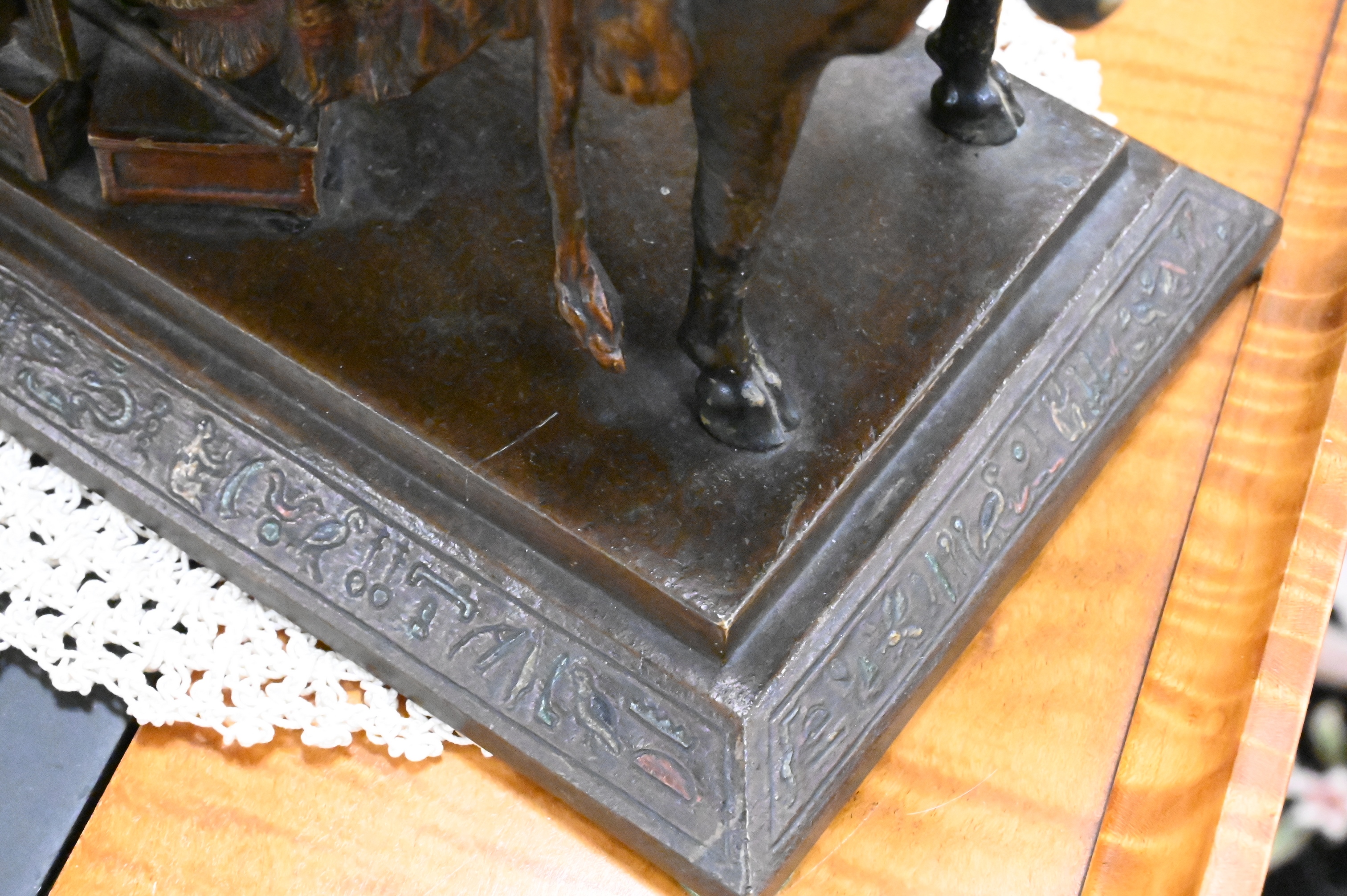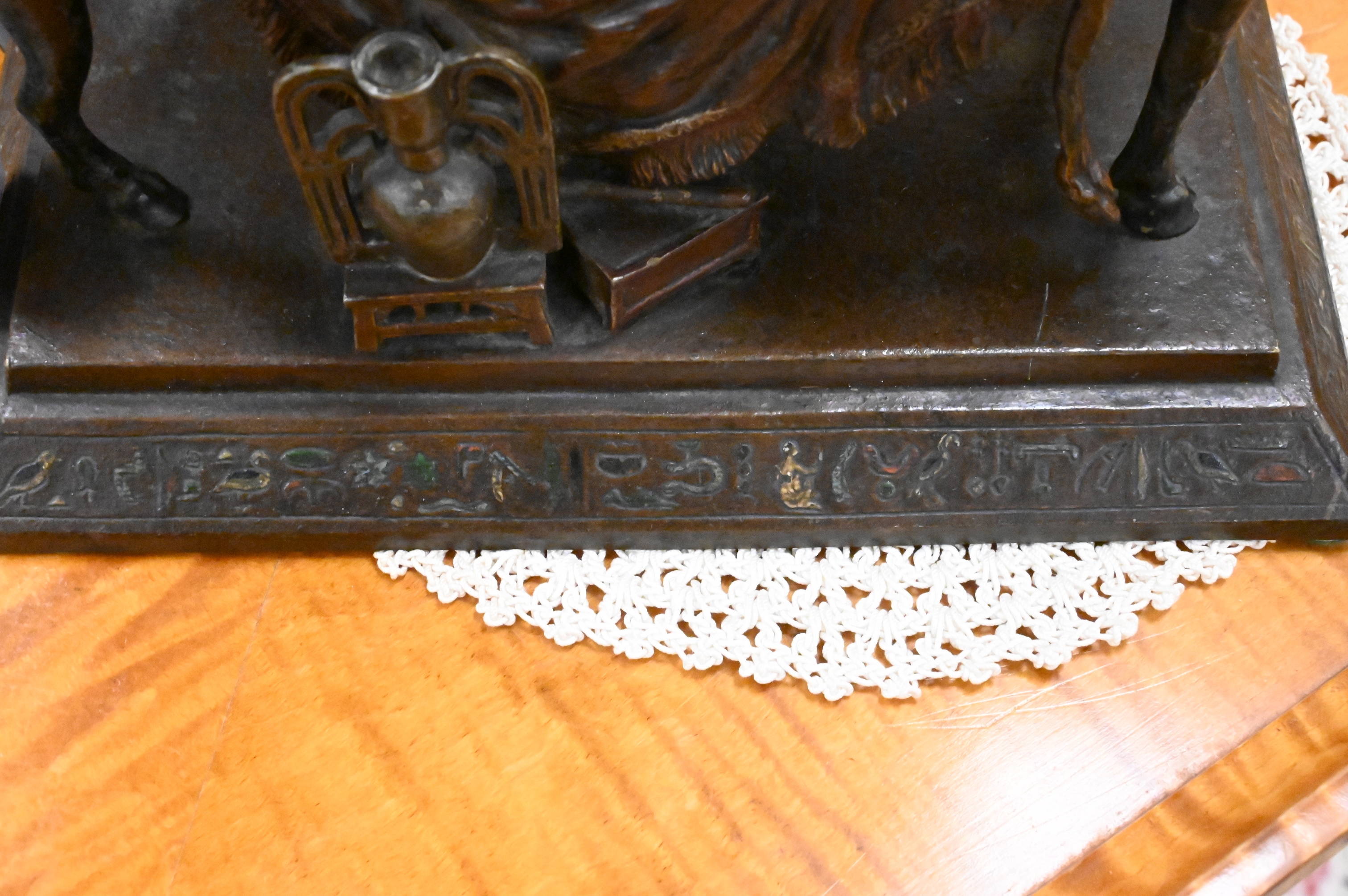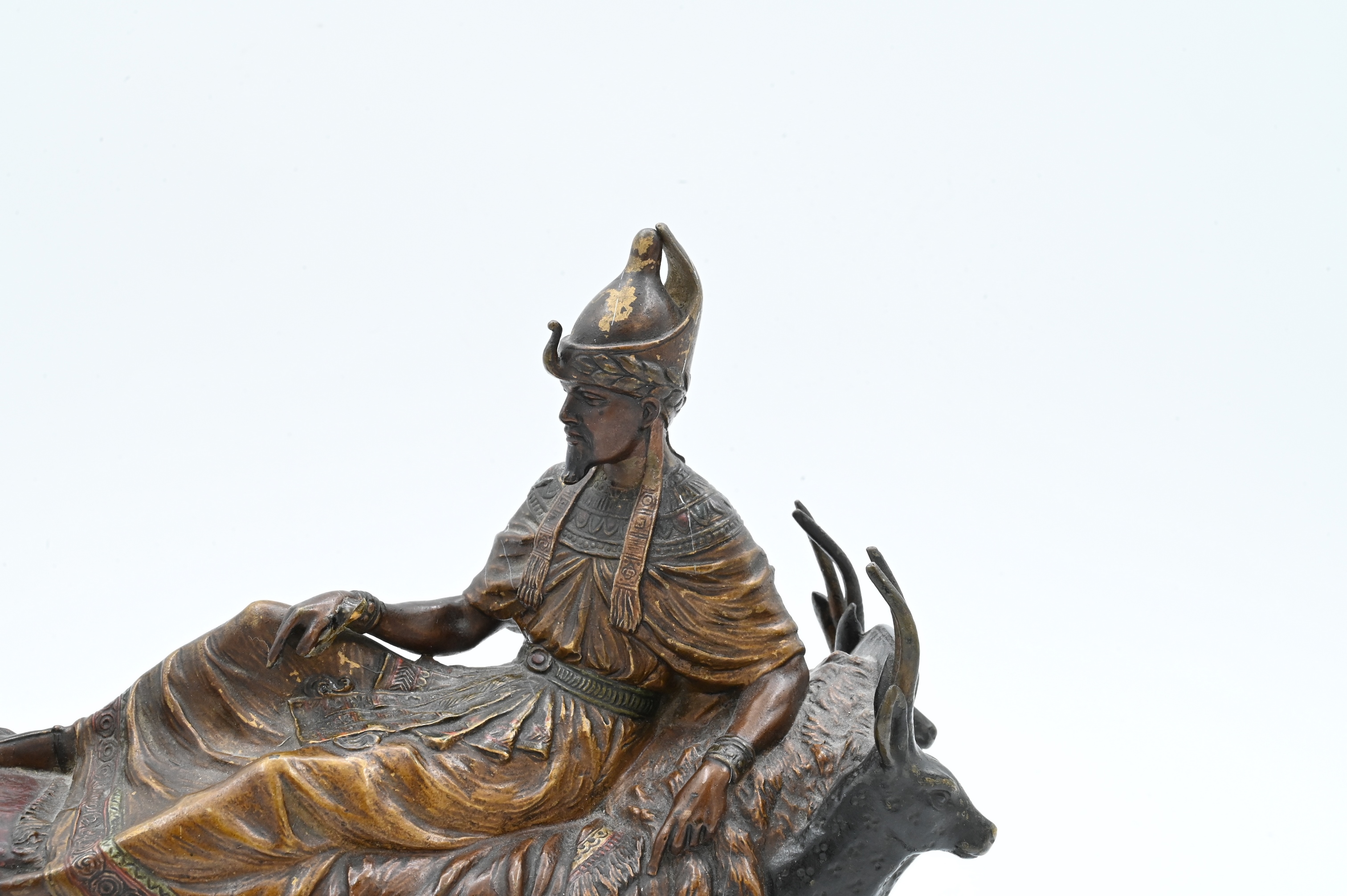 Cold painted bronze of Pharaoh lounging on a funerary bed with animal heads (marks not found)