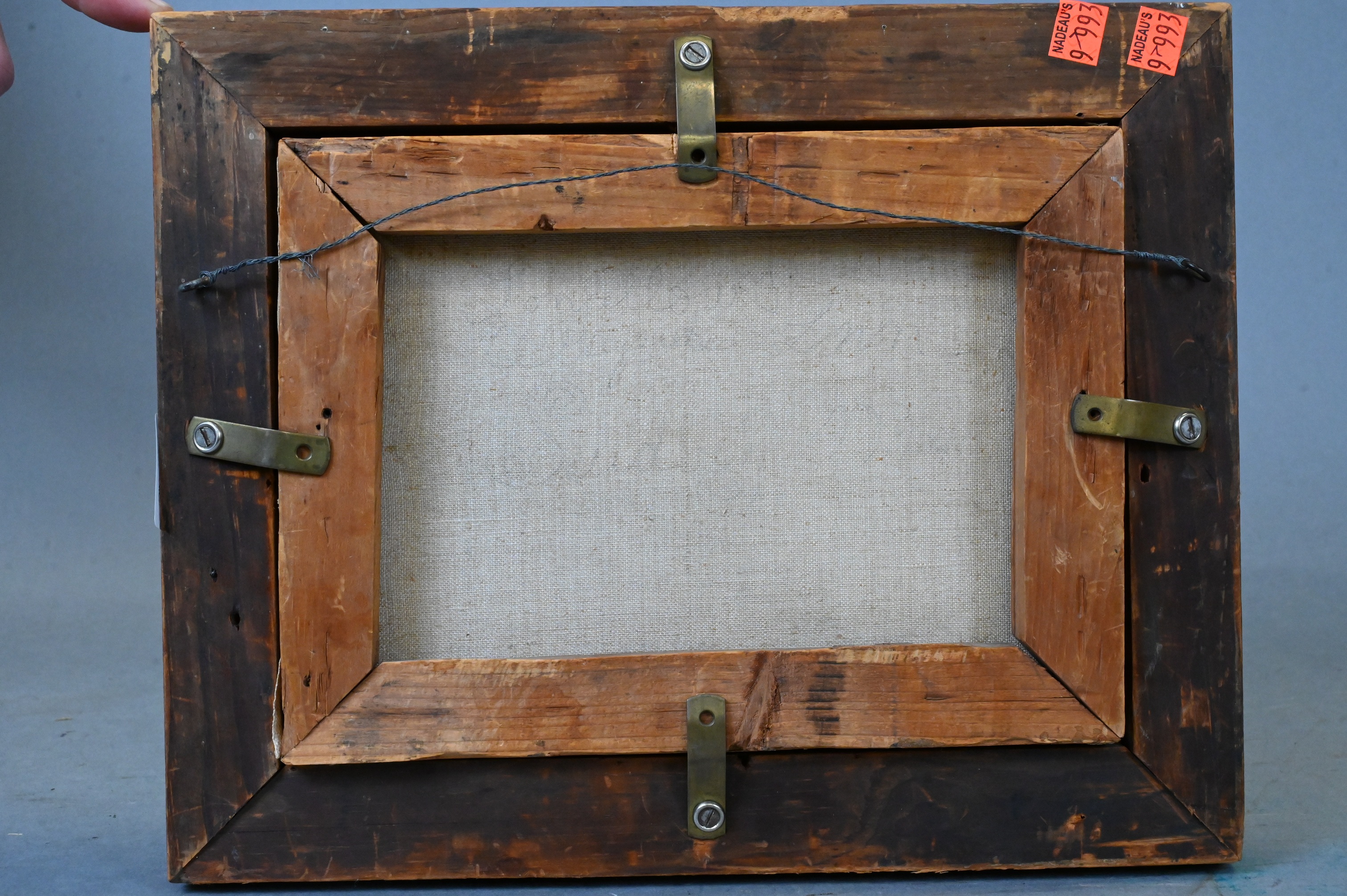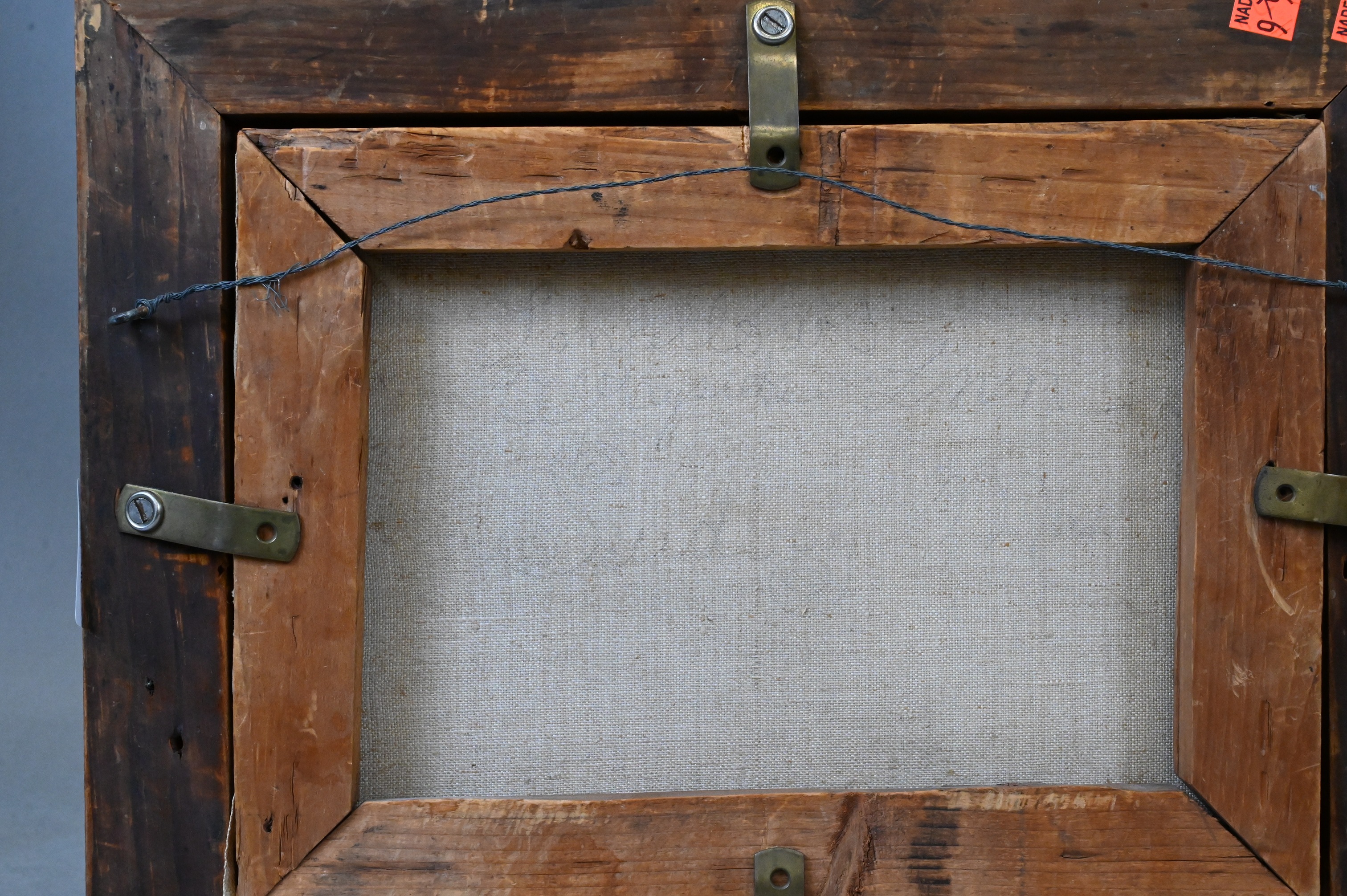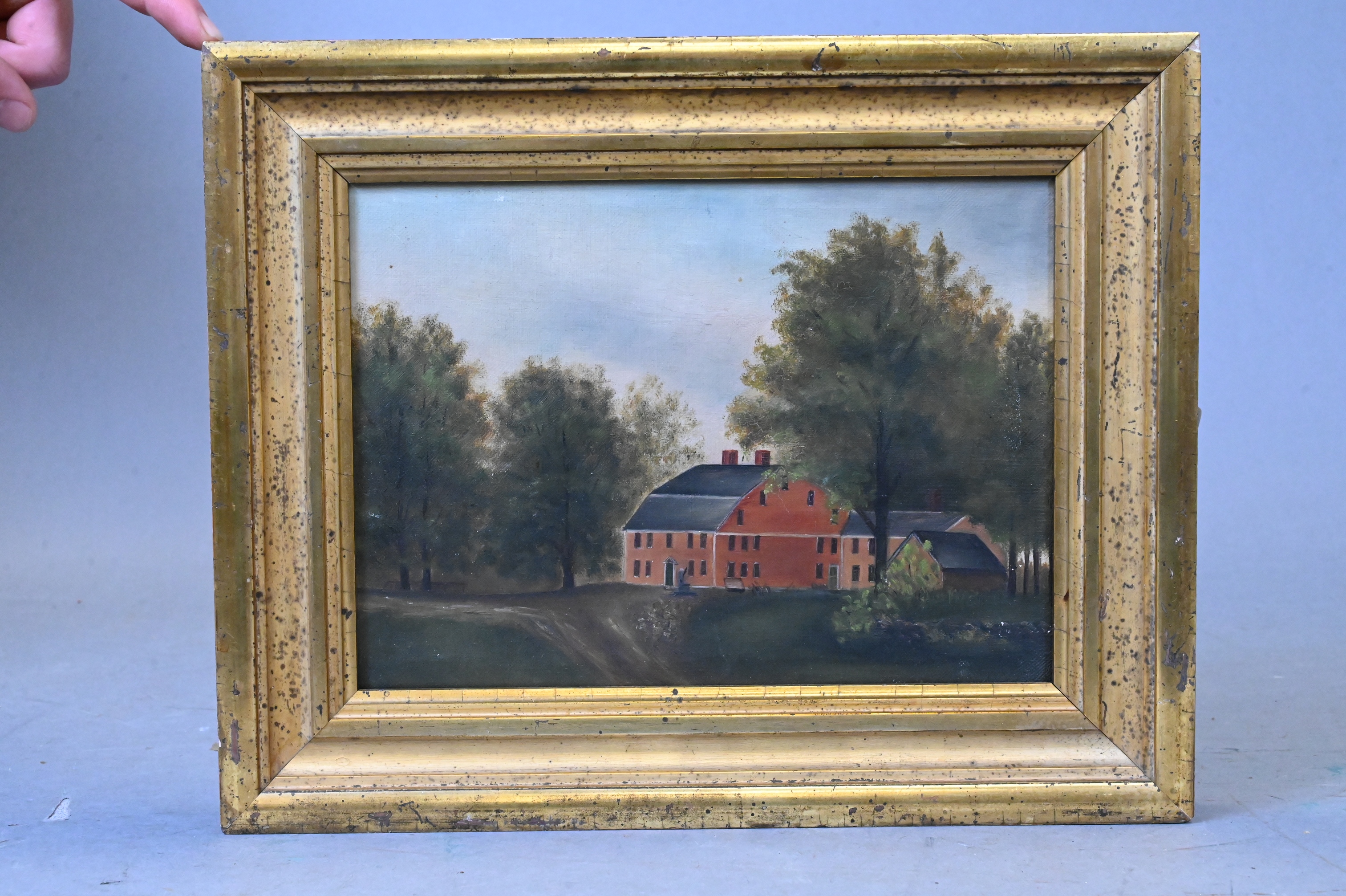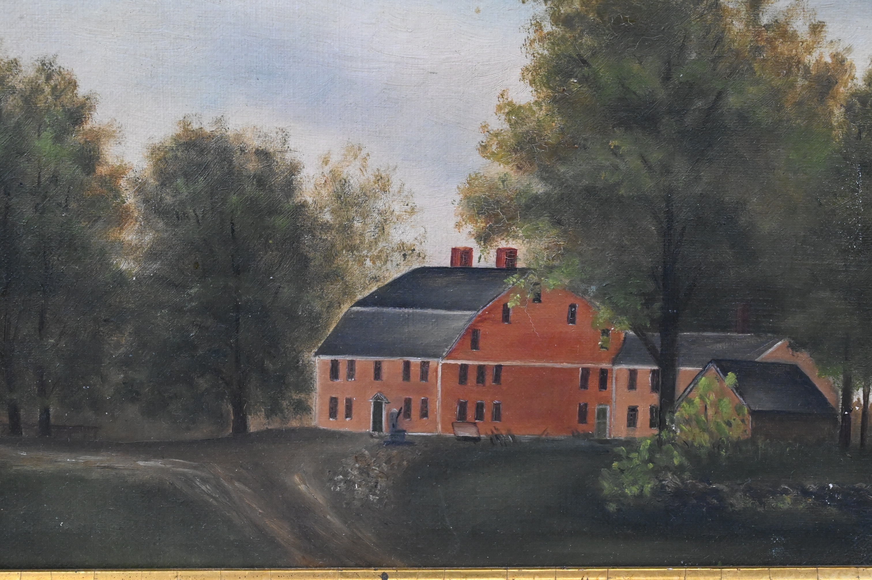 View of the historic Wayside Inn, founded in 1716 by David Howe as Howe’s Tavern and later celebrated in Henry Wadsworth Longfellow’s Tales of a Wayside Inn. The painting depicts the brick inn with adjoining outbuildings, framed by trees, rendered in a folk manner with emphasis on architectural detail.