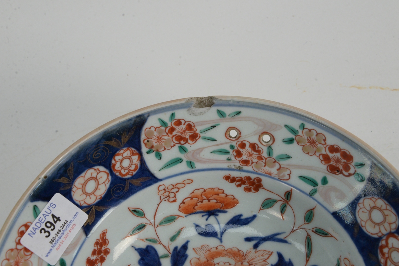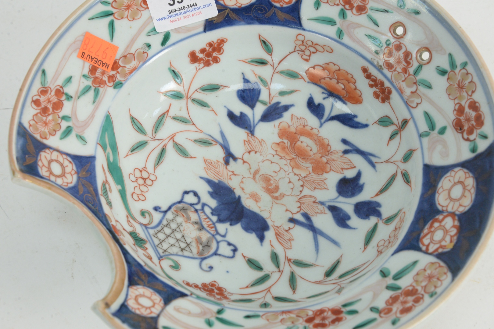 Chinese Imari Porcelain Bleeding Bowl with old label on bottom 1848 December 25, This bowl was given to me by Esther Morton Smith, wife of Daniel Smith goes on to talk about Thomas Richardson, who married John’s first wife, daughter of Bevis Newberry, Newport, Rhode Island, chip on rim, diameter 10 1/8 inches. Provenance: From a Newport, Rhode Island historic home, in the same family since 1761.