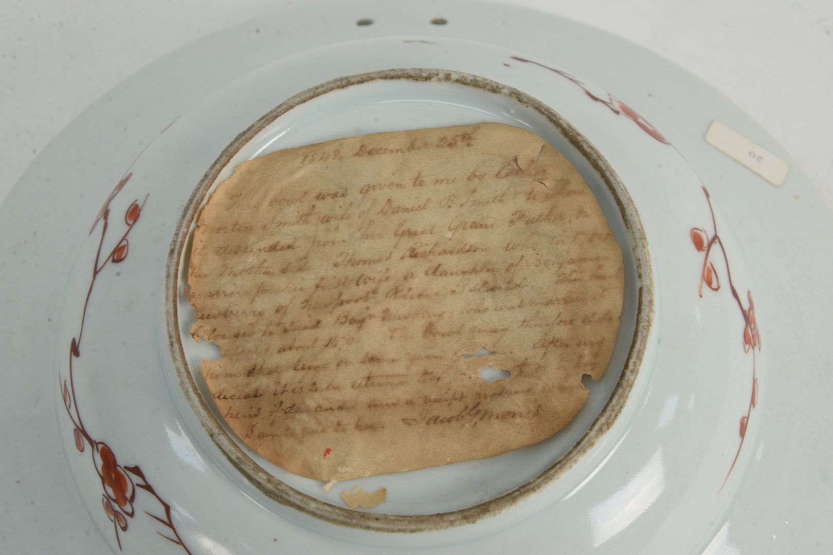 Lot 394: Chinese Imari Porcelain Bleeding Bowl with old label on bottom 1848 December 25, This bowl was given to me by Esther Morton Smith, wife of Daniel Smith goes on to talk about Thomas Richardson, who married John’s first wife, daughter of Bevis Newber