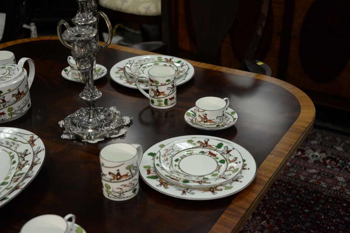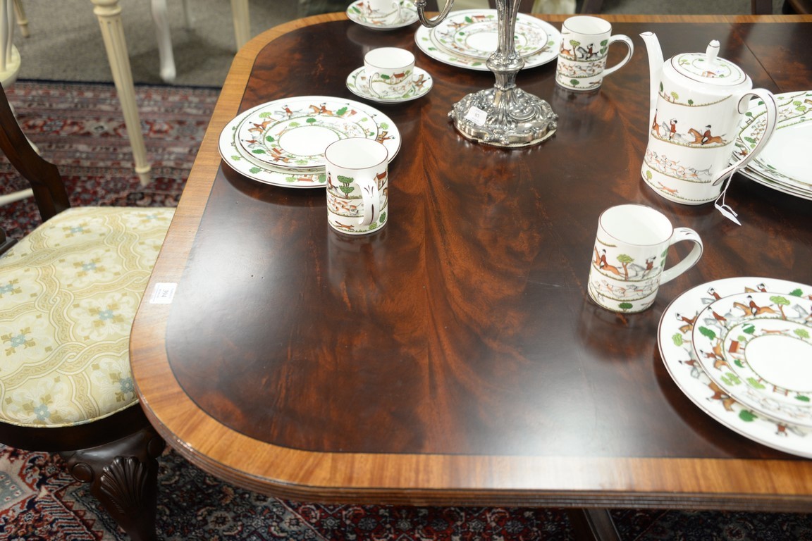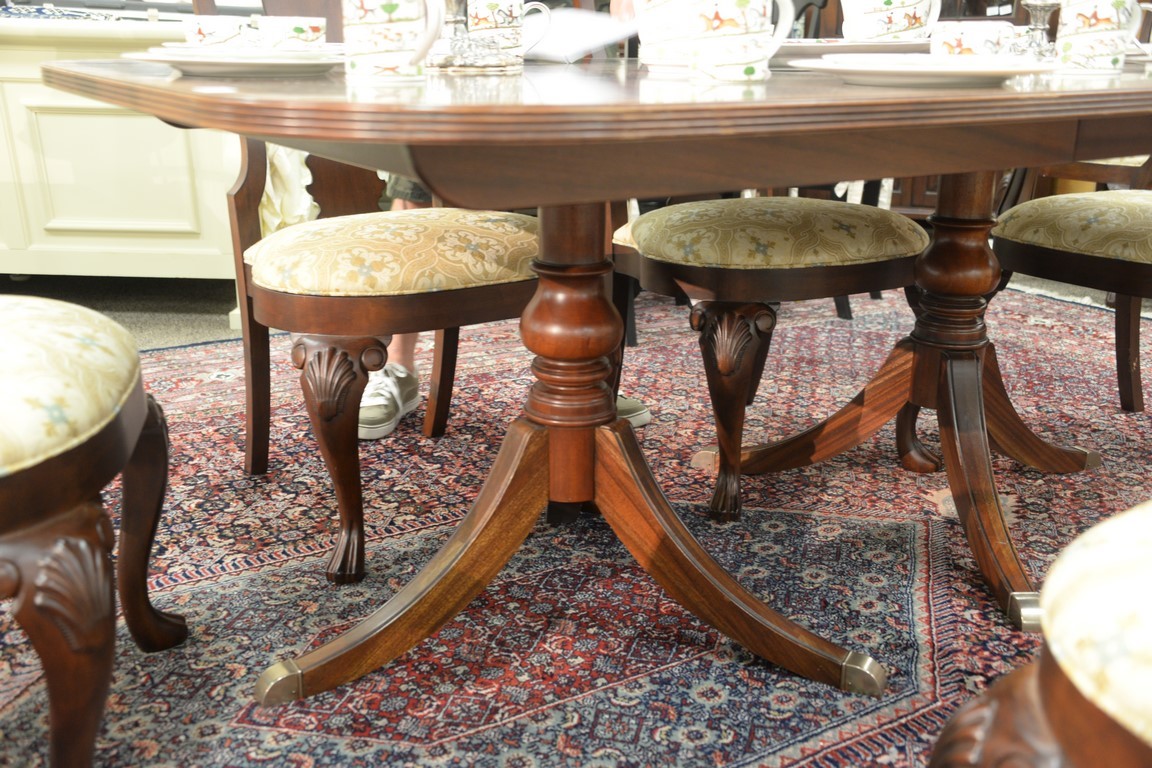 Lot 394: Ethan Allen mahogany dining table with banded inlaid top and double pedestal base and glass cut to fit top minor imperfections, no…
