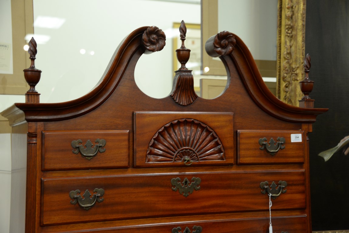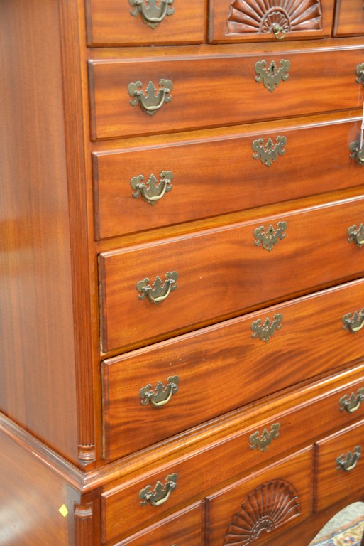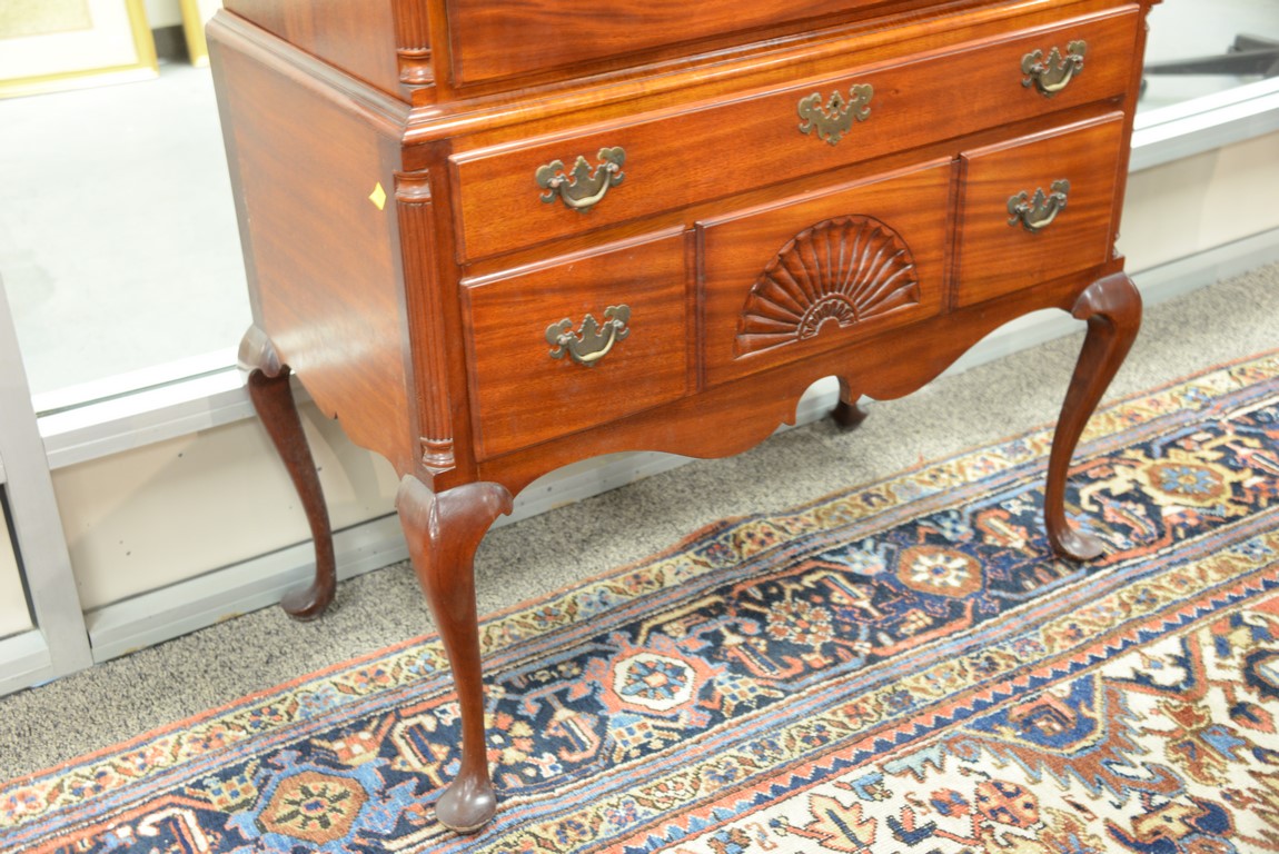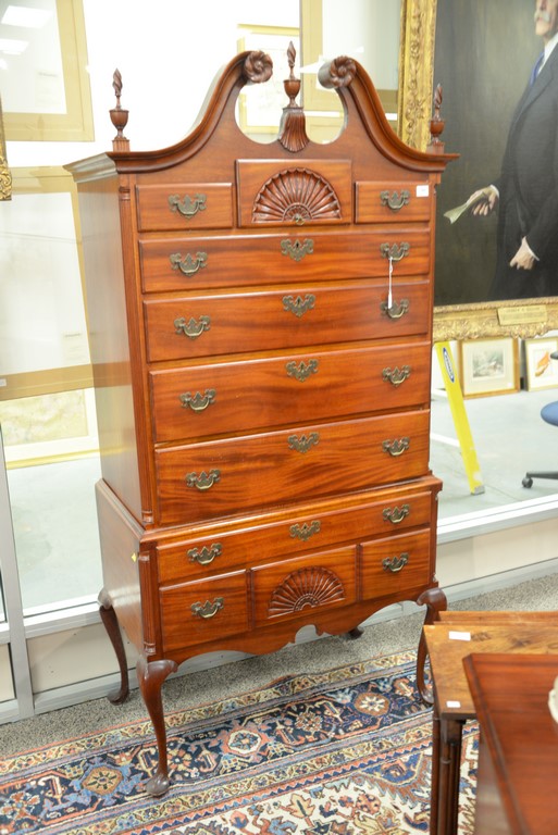 Lot 394: Fineberg Queen Anne style mahogany highboy in two parts with broken arch top, all set on cabriole legs ending in pad feet, made by F…