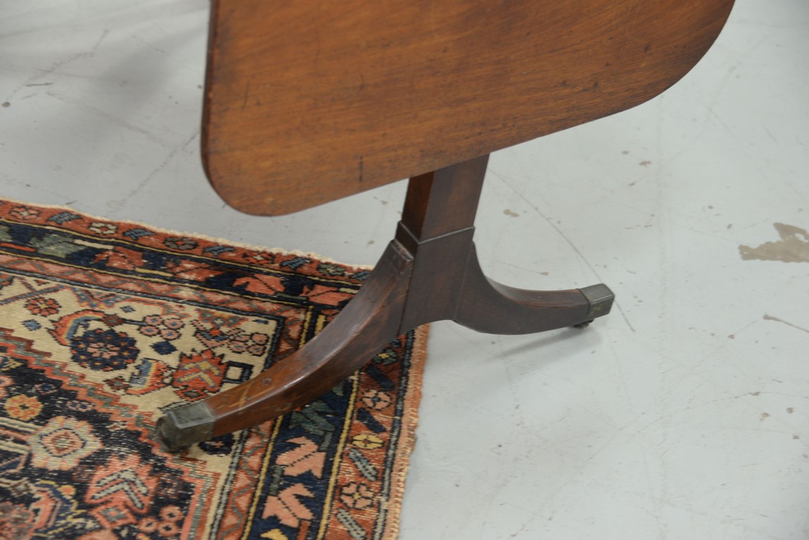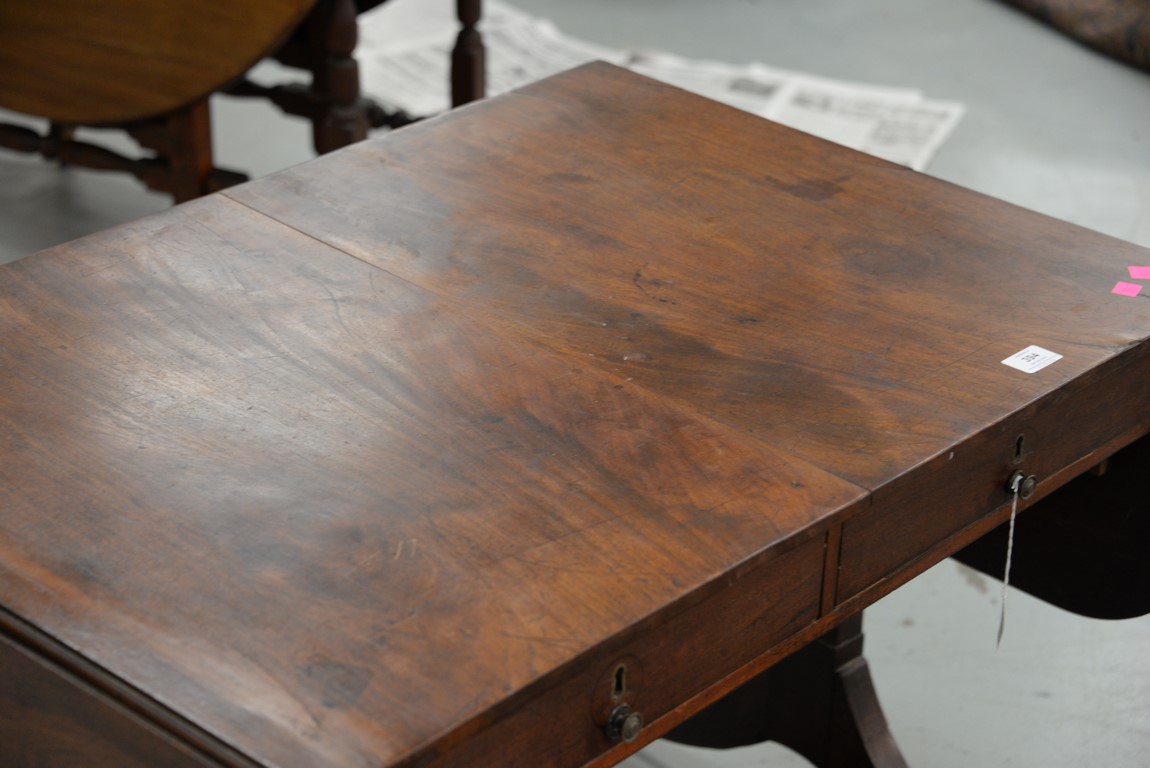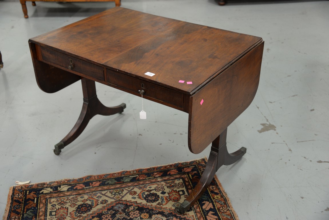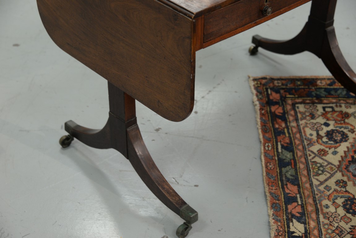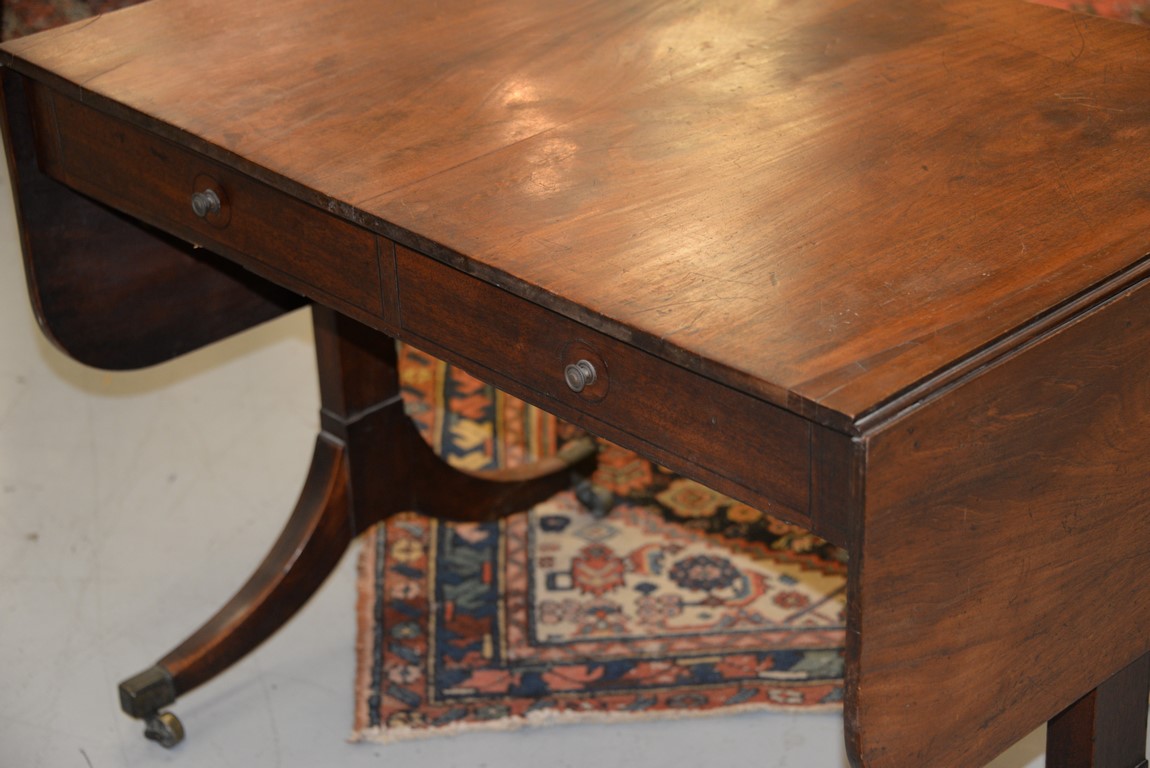 Lot 394: George III mahogany sofa table with drop leaves and two drawers in frieze set on tressle base ending in downswept members with line inlay, 19th century. ht. 28 in. top closed: 25 1/2 x 36 top open: 25 1/2 x 61