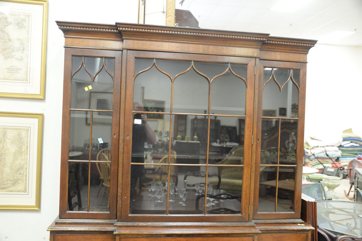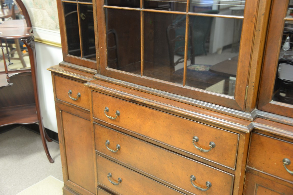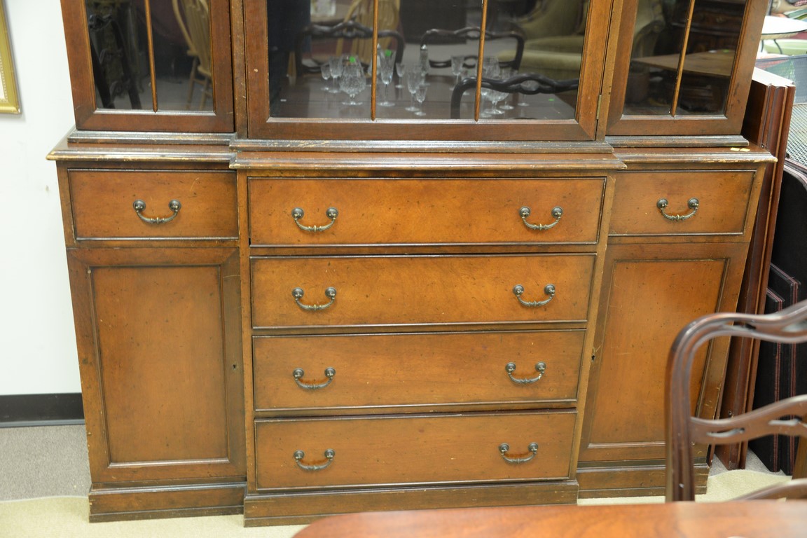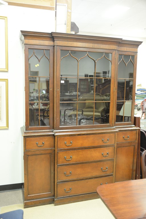 Joahon mahogany two part breakfront in need of refinishing. ht. 82in. wd. 63in.