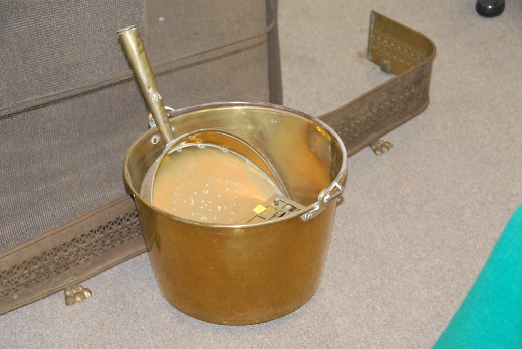 Large brass bucket, fire screen, fire fender, dust pan, and trivet.