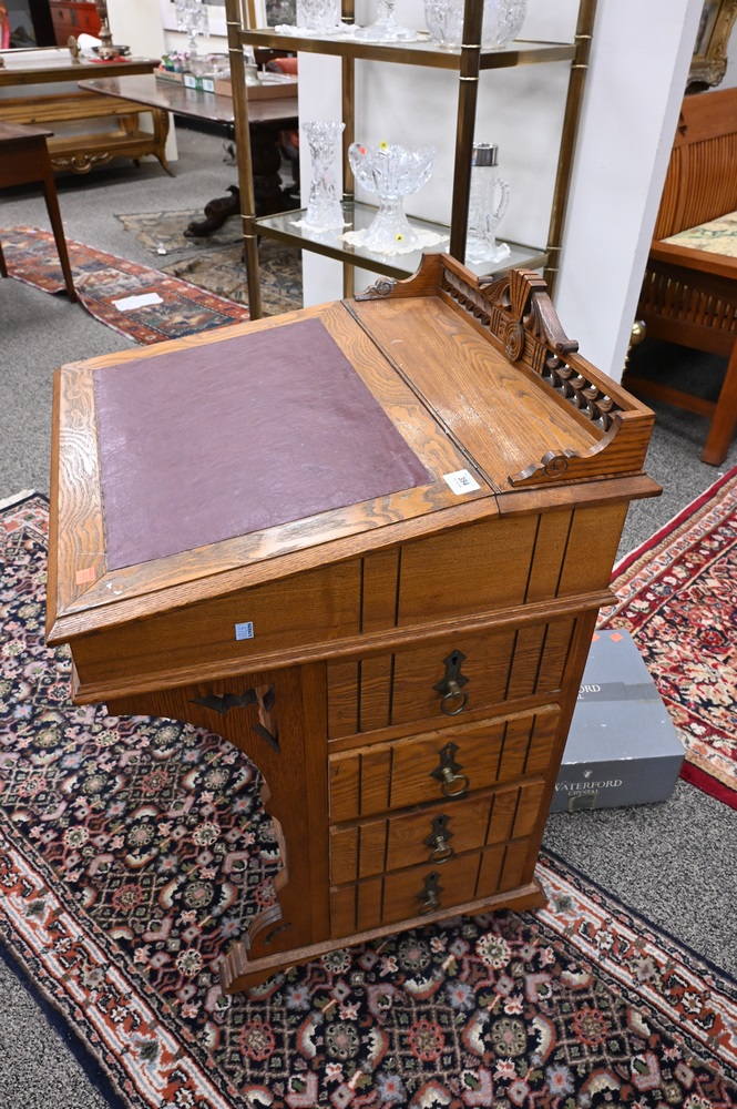 Lot 394: Oak Davenport Desk, having side drawer, height 36 3/4 inches, top 23 1/2″ x 23 1/2″.