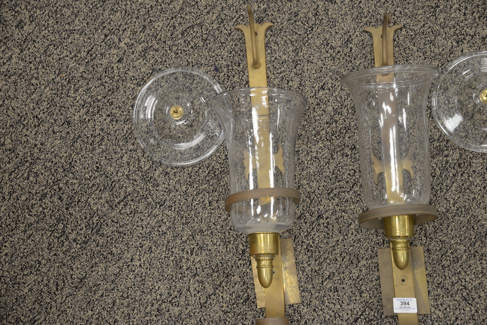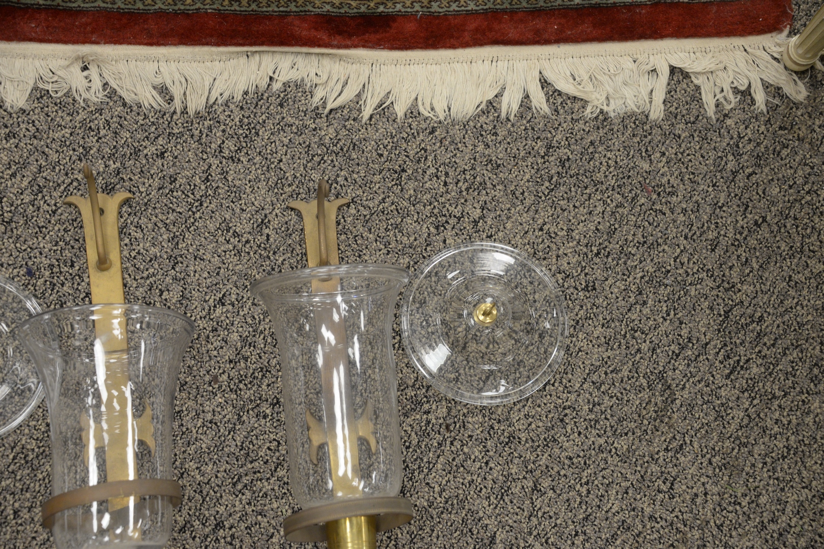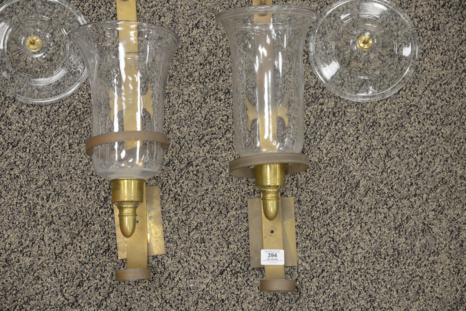 Lot 394: Pair of Glass and Brass Mounted Hurricane Sconces, having brass wall brackets, height 14 inches, diameter 7 1/2 inches.