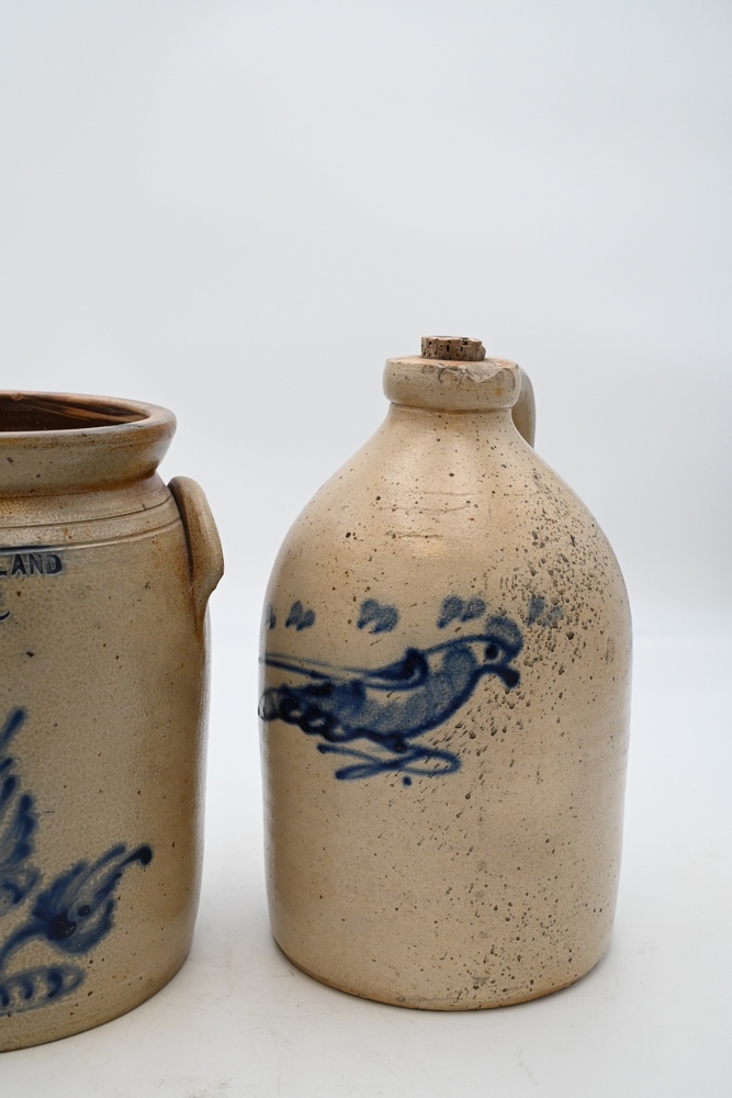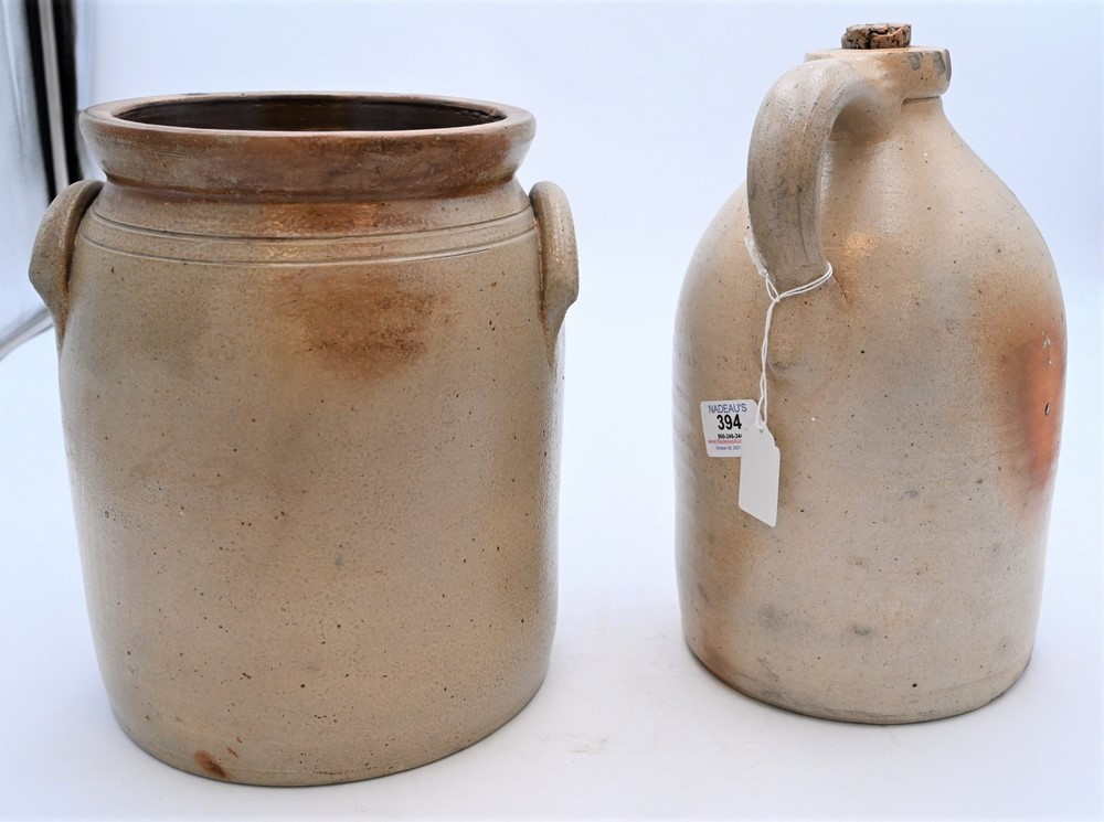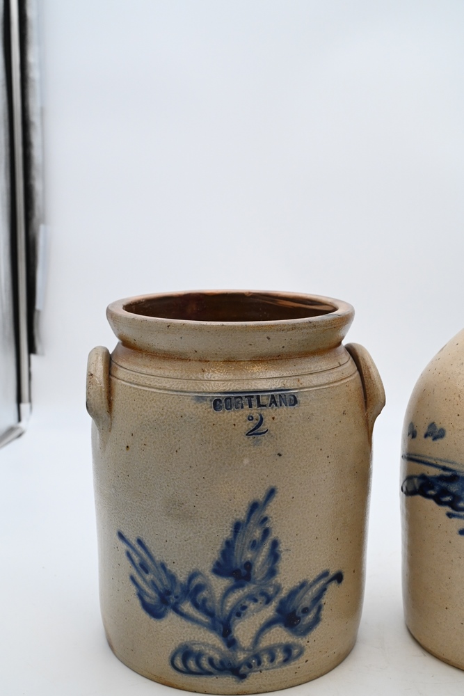Lot 394: Two Piece Stoneware Lot to include one jug with blue bird along with two gallon crock having blue flowers marked cortland