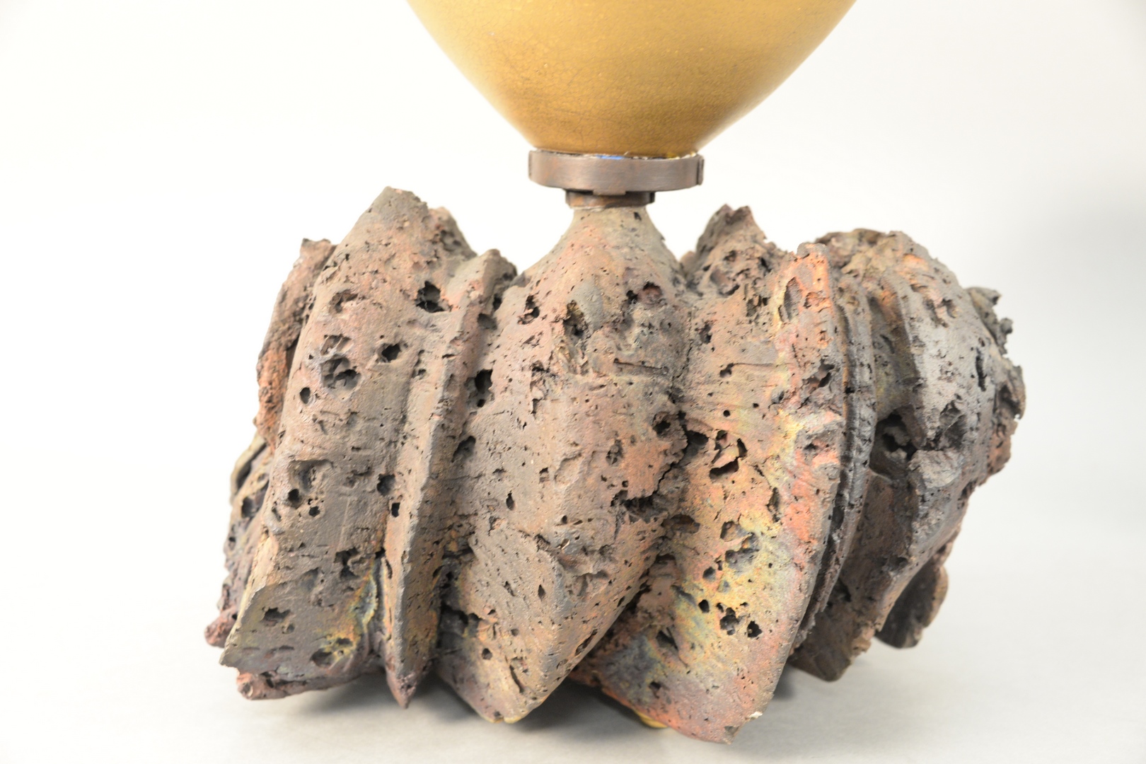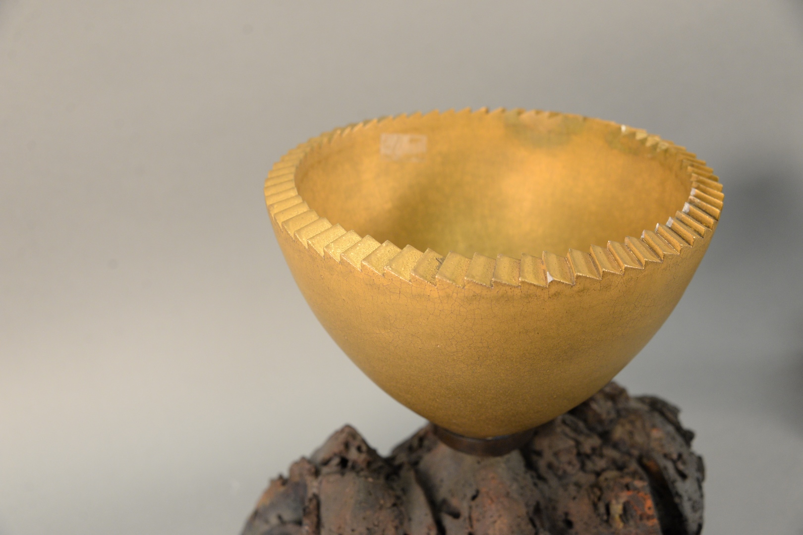 Lot 395: Adrian Saxe b. 1943 gold bowl on Raku fired ceramic, natural base height 16 1/4 inches, diameter 10 3/4 inches, length 12 1/2 inch…