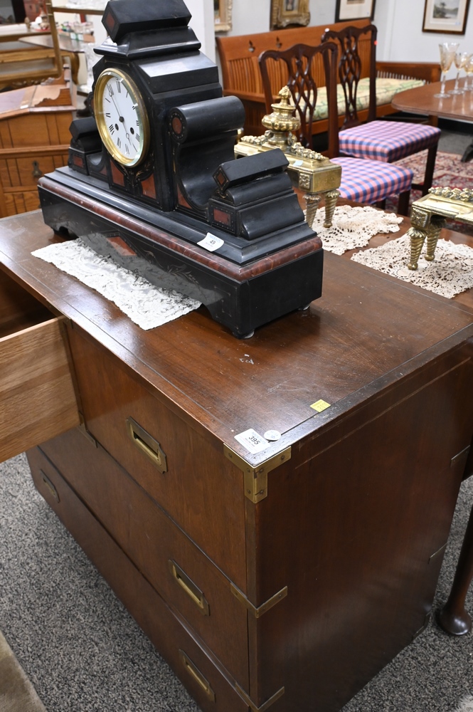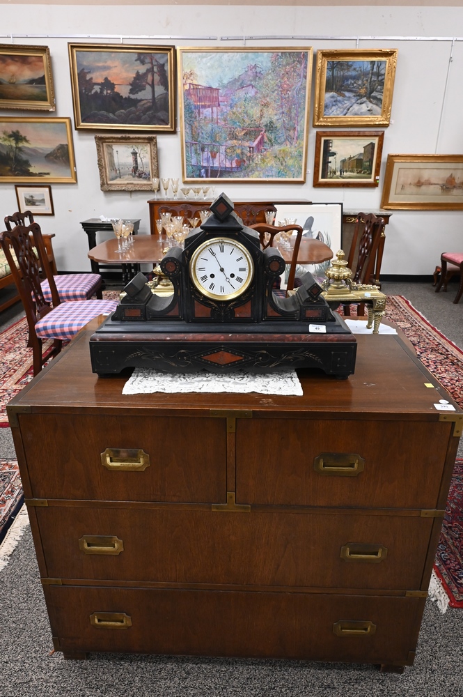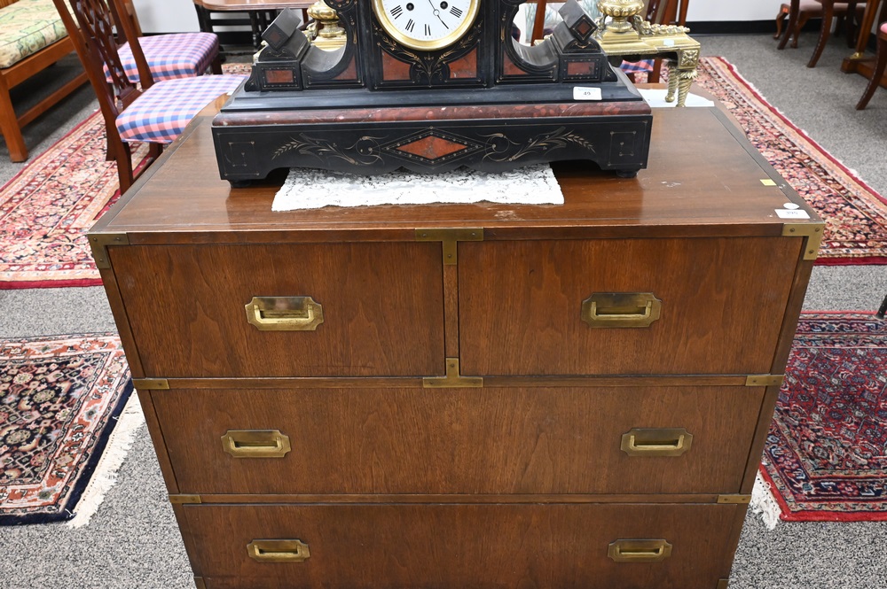 Lot 395: Baker Mahogany Campaign Style Chest, having two over two drawers, height 32 inches, width 38 inches.