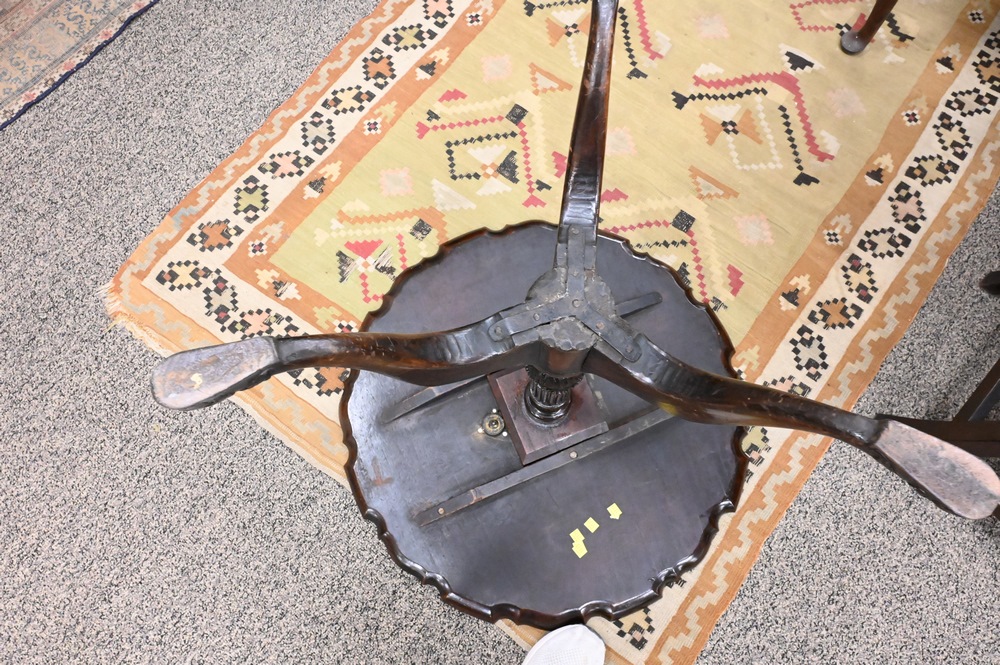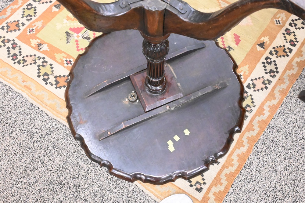 Lot 395: Chippendale Mahogany Tip Table, having piecrust edge on fluted and carved shaft, on tripod base with carved feet, height 28 1/2 inches, top 29 1/2″ x 30″.