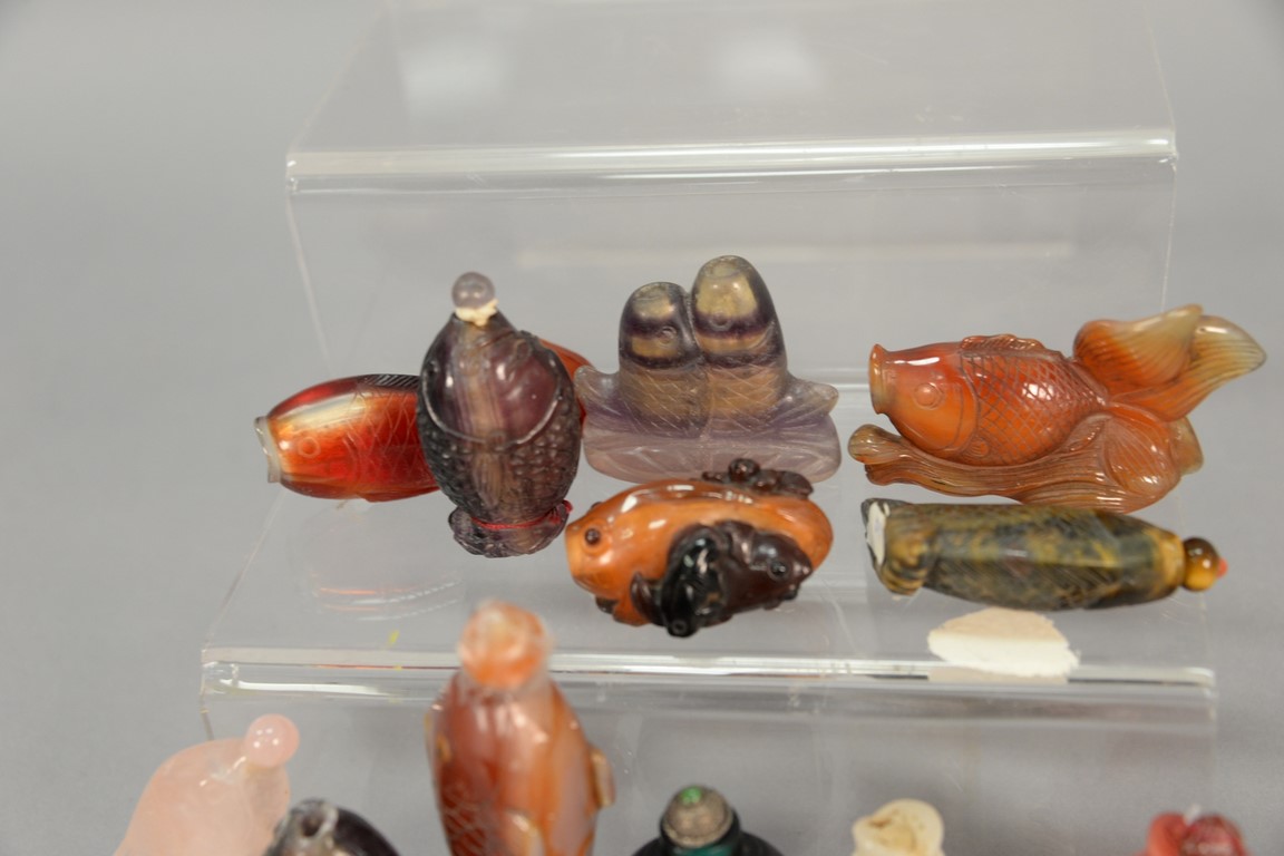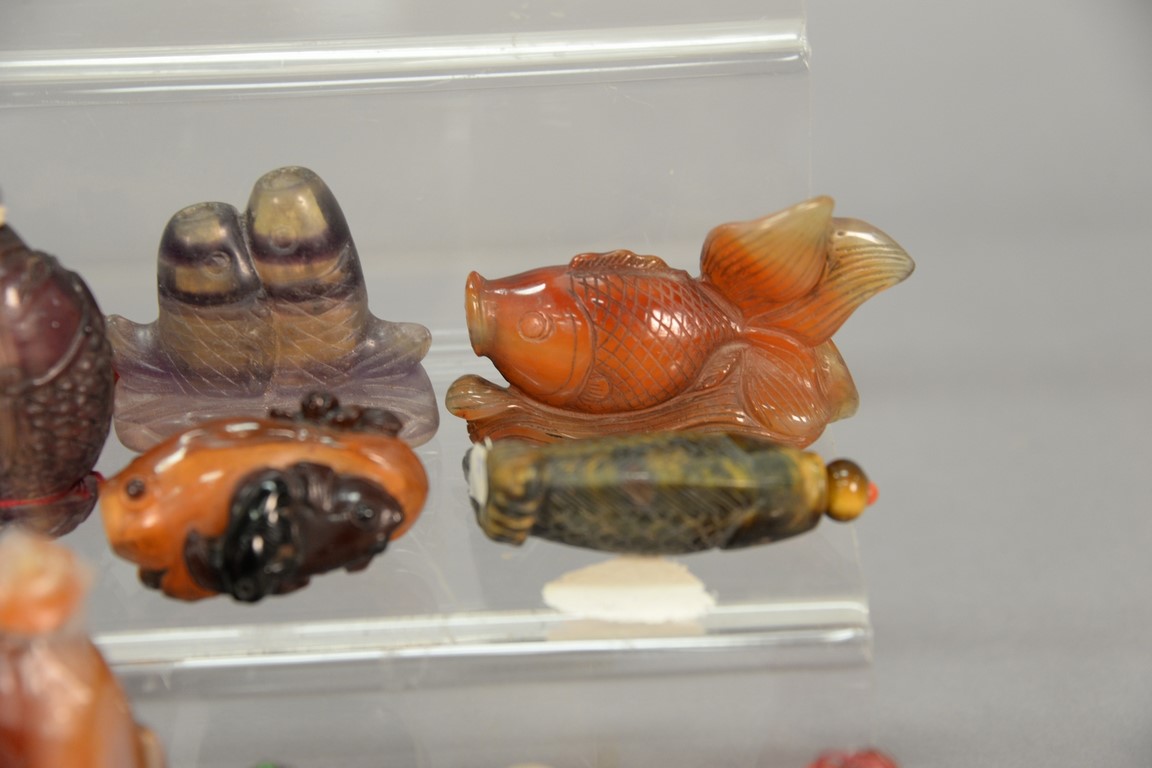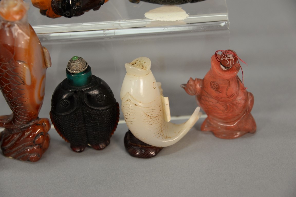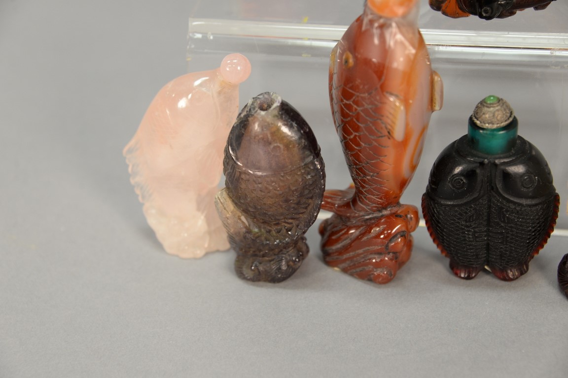 Collection of twelve snuff bottles in the form of fish including quartz, overlay glass, and crystal agate, and one tiger eye. ht. 1 1/4in. to 2in.