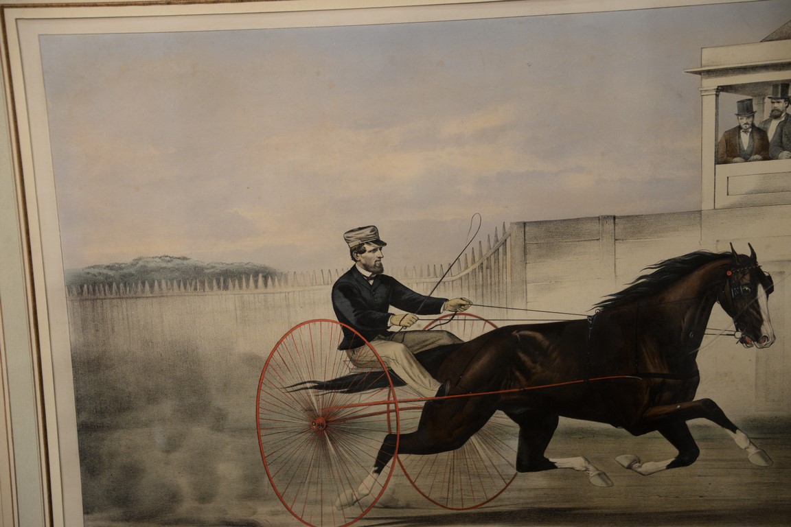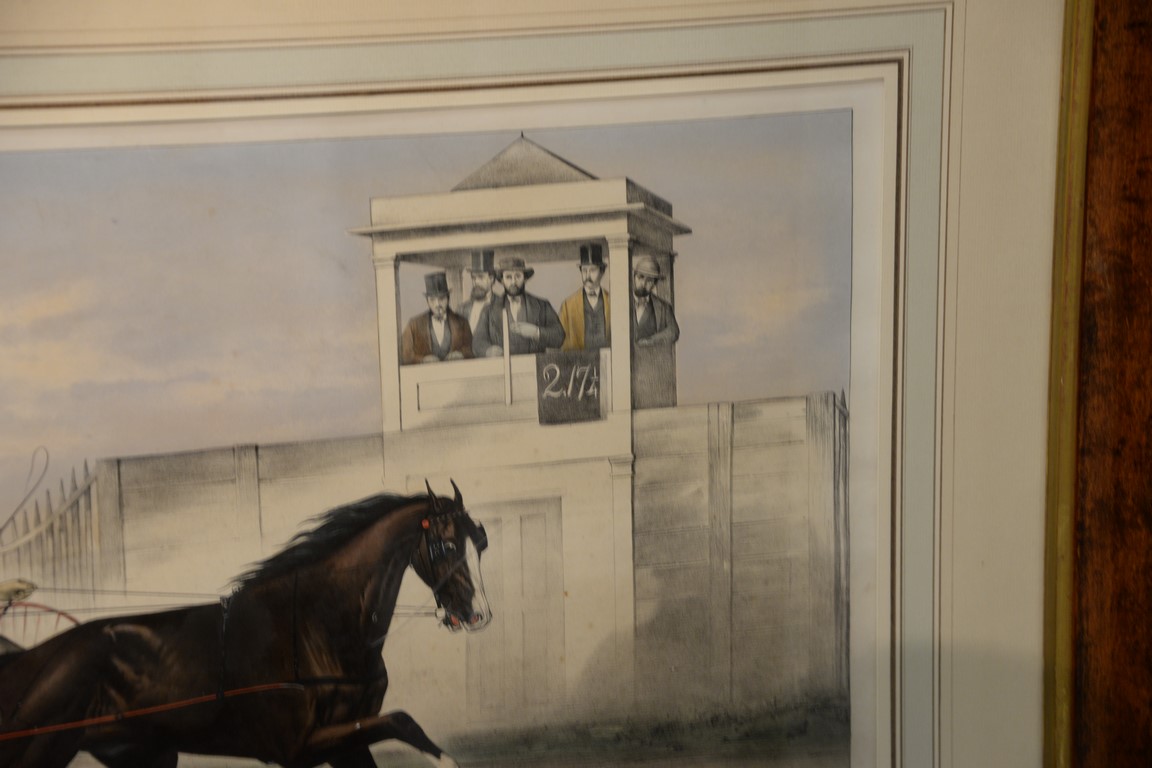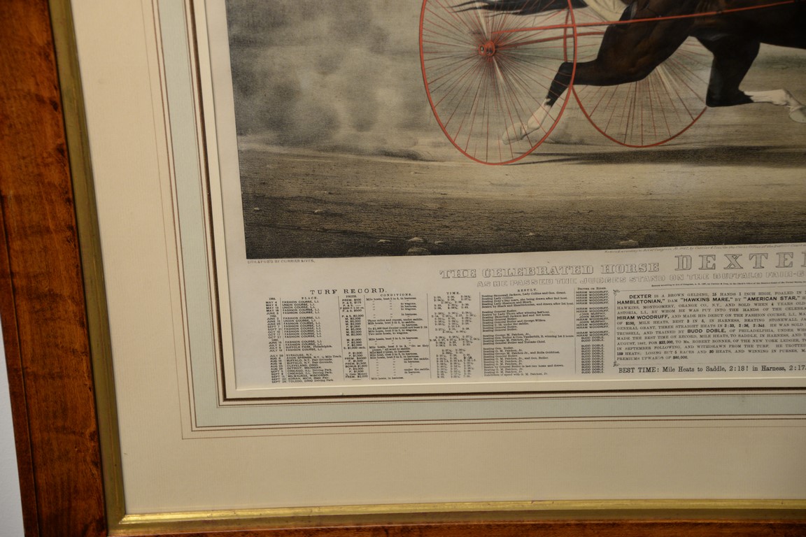 Lot 395: Currier & Ives large folio hand colored lithograph The Celebrated Horse Dexter, The King of the World as he passes the Ju…