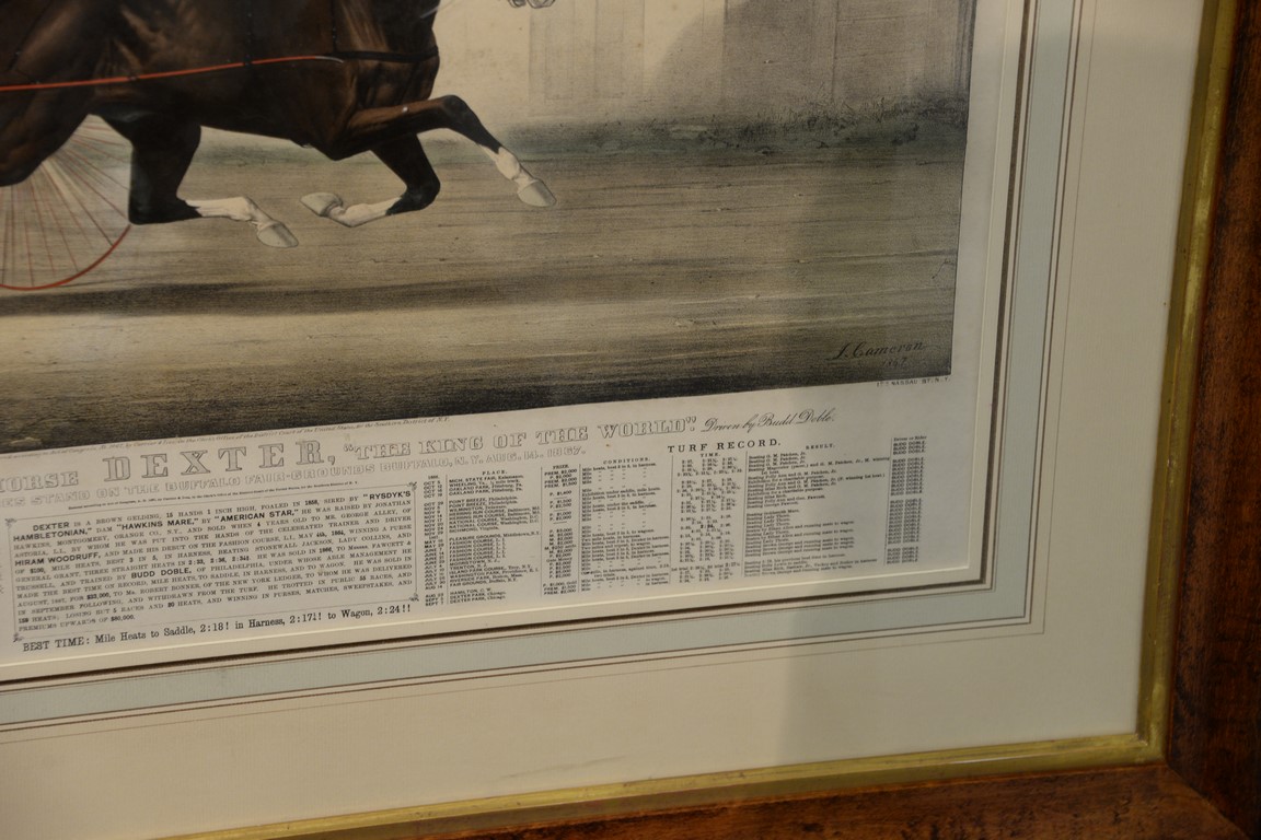 Currier & Ives large folio hand colored lithograph The Celebrated Horse Dexter, The King of the World as he passes the Judge stand on the Buffalo Fair-grounds Buffalo, N.Y. Aug. 14, 1867 after J. Cameron marked lower left: Lith & Pub’d by Currier & Ives sight size 21 1/2 x 27 1/2 Provenance: Property from Credit Suisse’s Americana Collection