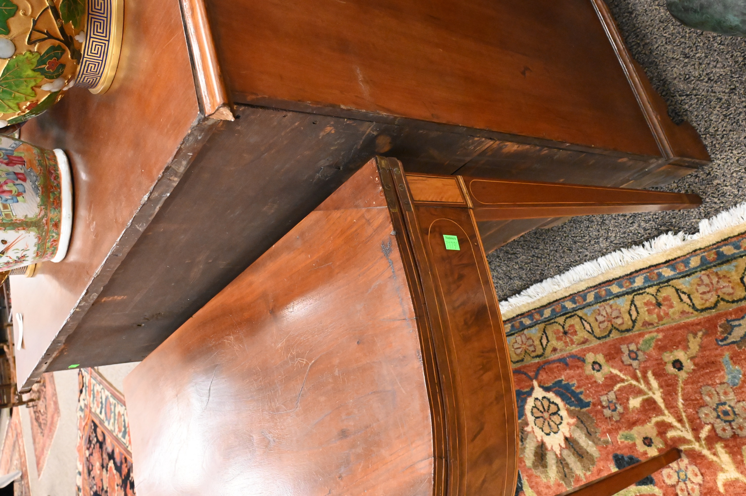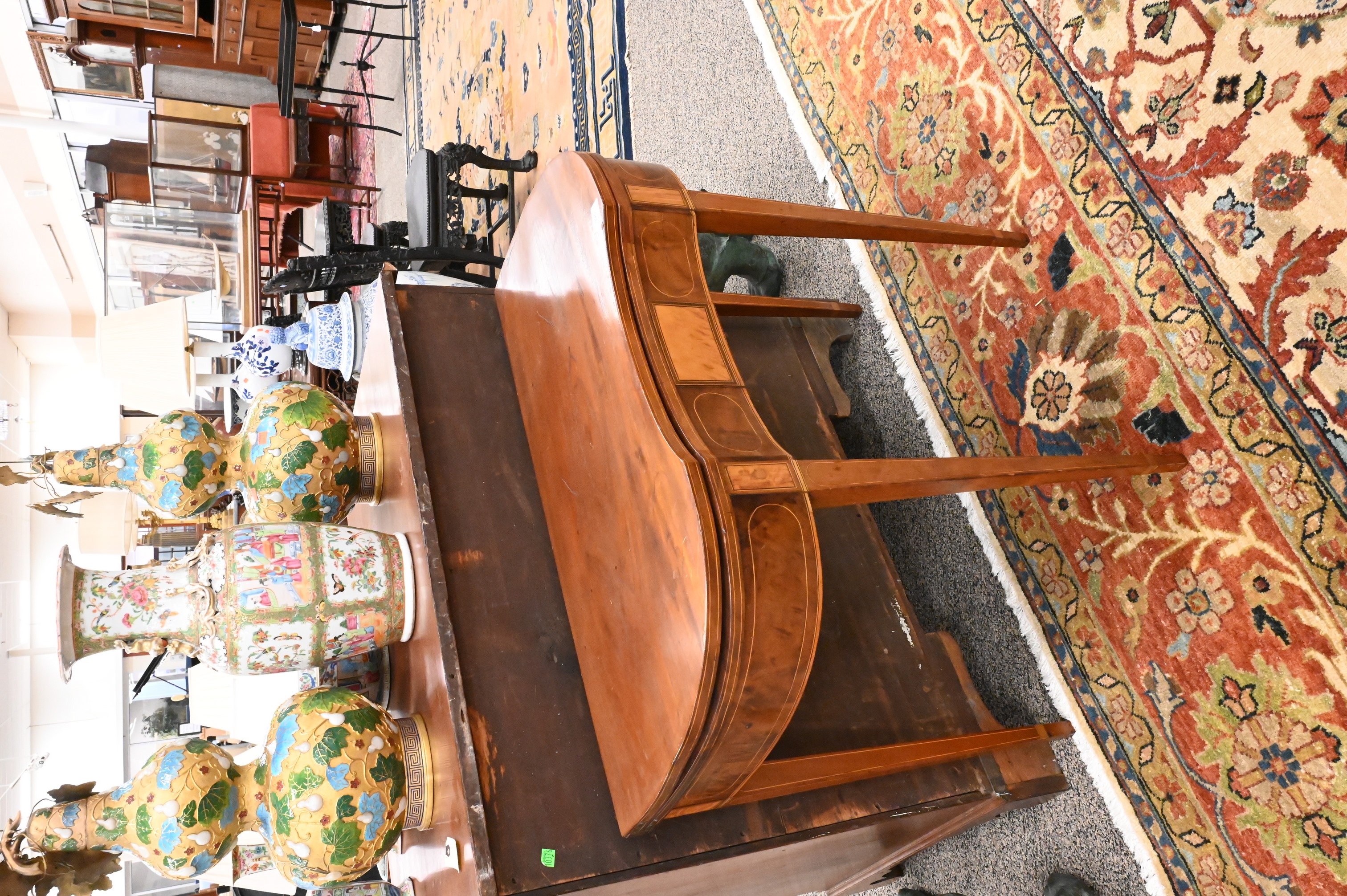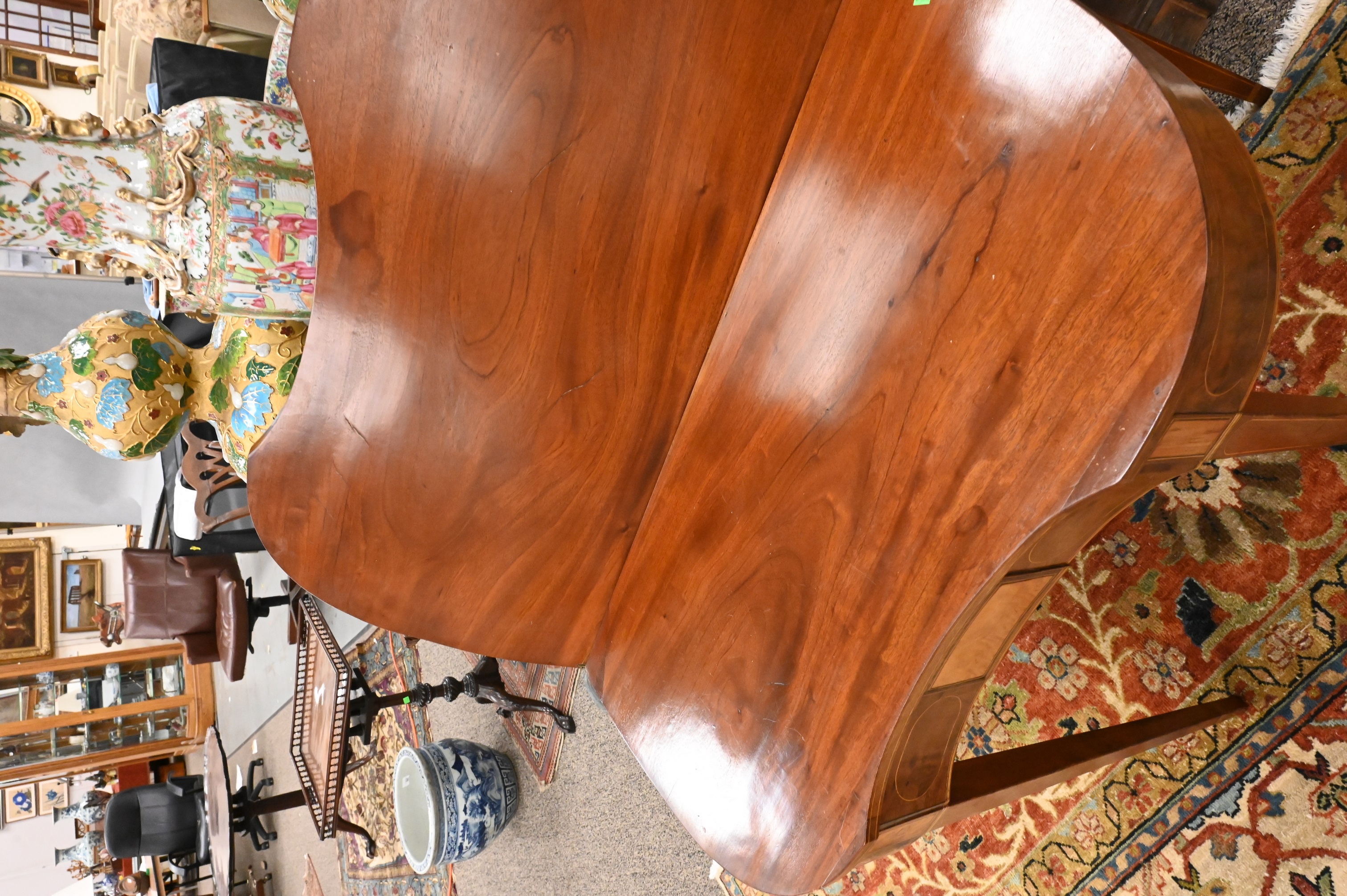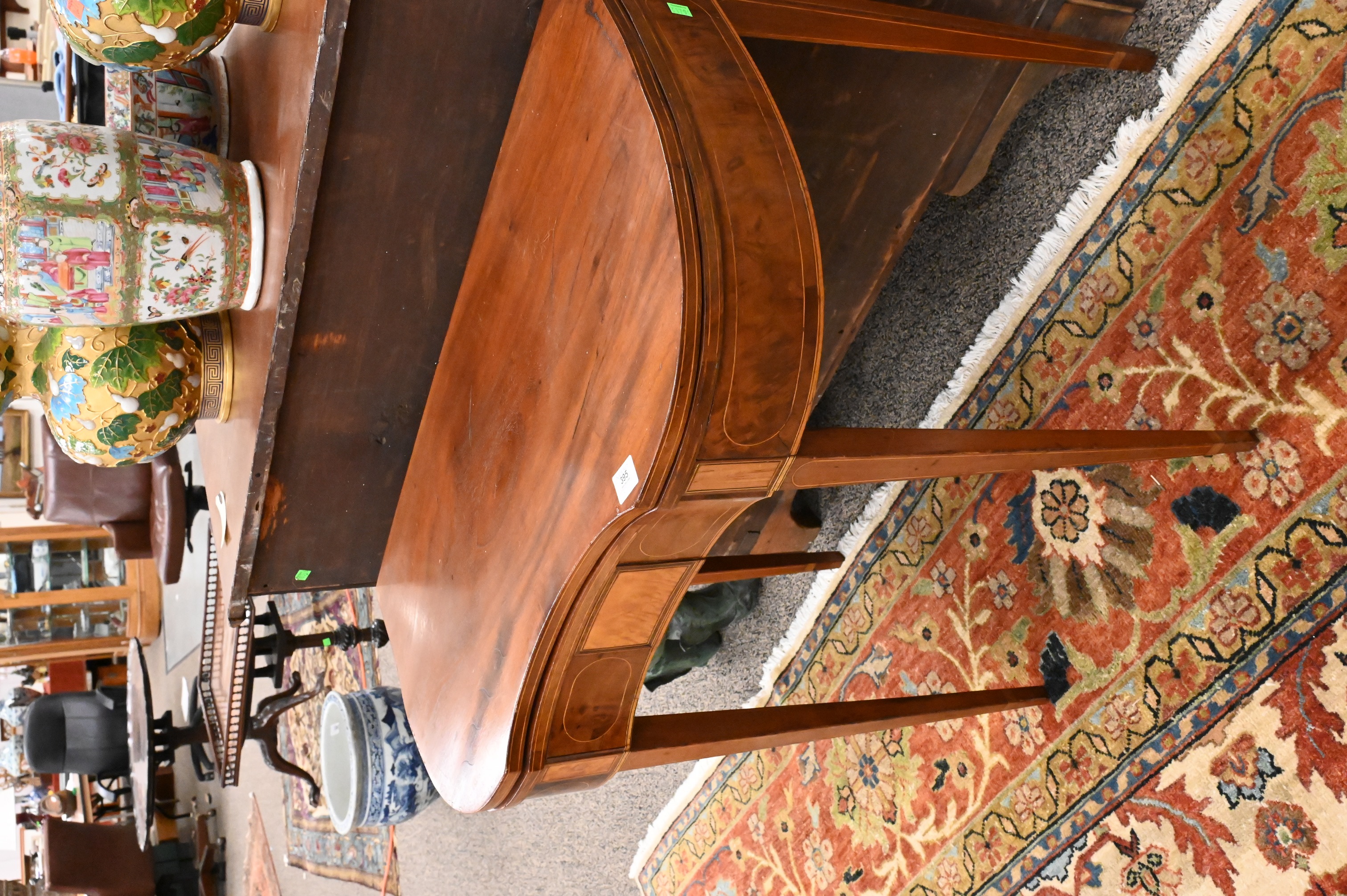 having concave shaped top over conforming skirt with maple panel and line inlays, all set on square tapered legs, circa 1790