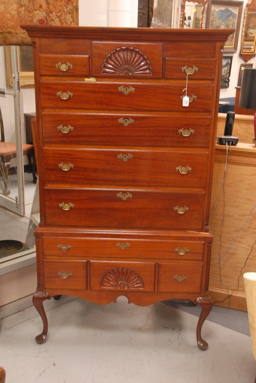 Fineberg mahogany chest on chest in two parts, upper section having three short drawers over four graduated drawers on base with two long drawers on short cabriole legs ending in pad feet, made by Fineberg, Hartford, CT. ht. 65in. wd. 34in. dp. 19in.