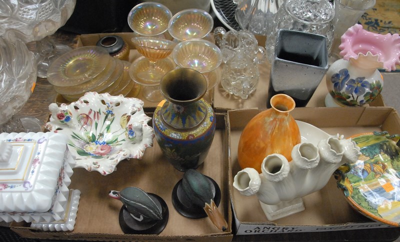Four box lots including glass and china, Cloisonne vase, Majolica compote, duck bookends, etc.