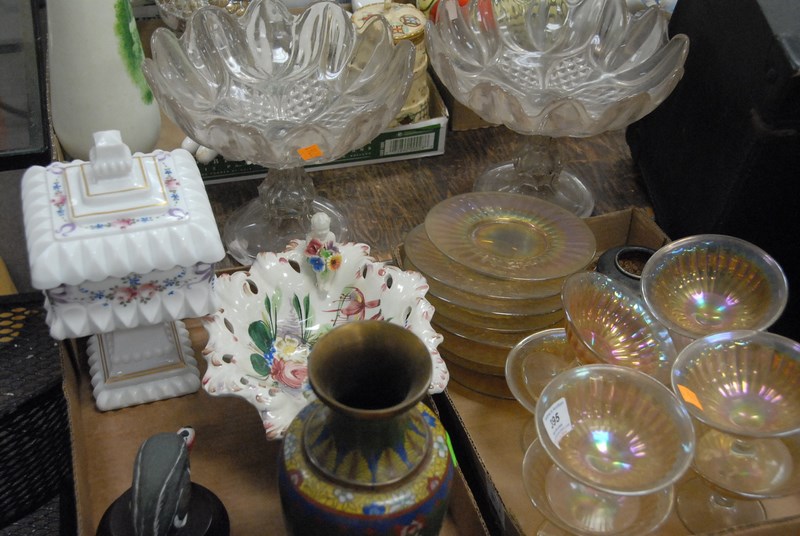 Lot 395: Four box lots including glass and china, Cloisonne vase, Majolica compote, duck bookends, etc.