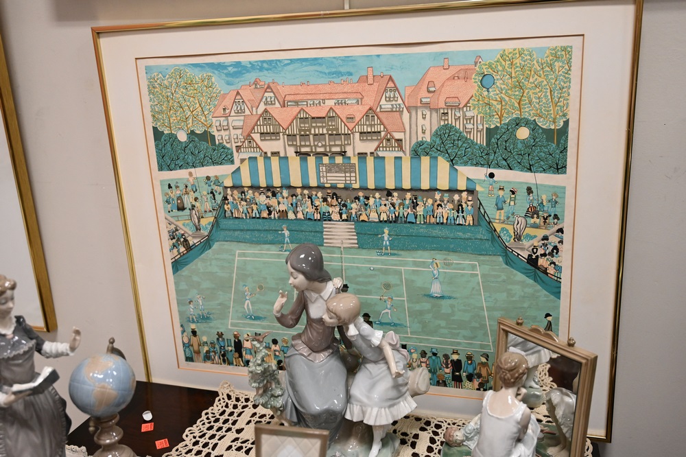 Lot 395: Four Piece Lot, to include watercolor on paper; still life with flowers, signed indistinctly and dated 2003 upper right; Ernest Garthwaite (American, b. 1940), “Mohegan Golden Eagle”, lithograph in colors on paper, signed, titled, and dated in pencil in the lower margin; Ivel Weinmiller (Argentinean, b. 1954), “Forest Hills”, lithograph in colors on paper, signed, titled, and numbered “10/50” in pencil in the lower margin; along with Rolf Rafflewski (German, b. 1943), Parisian Scene, lithograph in colors on paper, signed and numbered “50/150″ in pencil in the lower margin, largest 22 1/2″ x 30”.