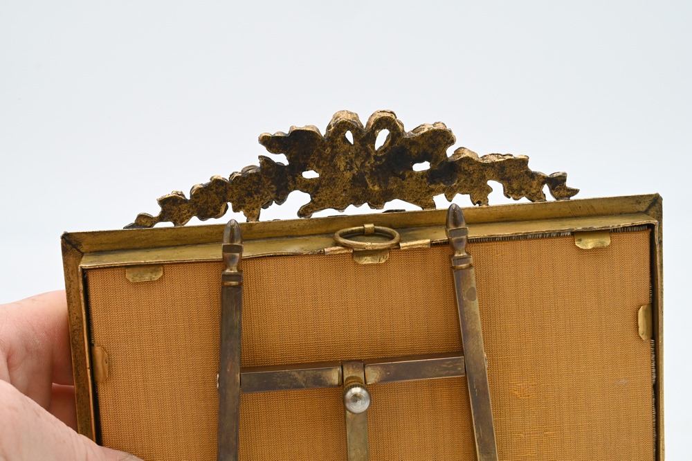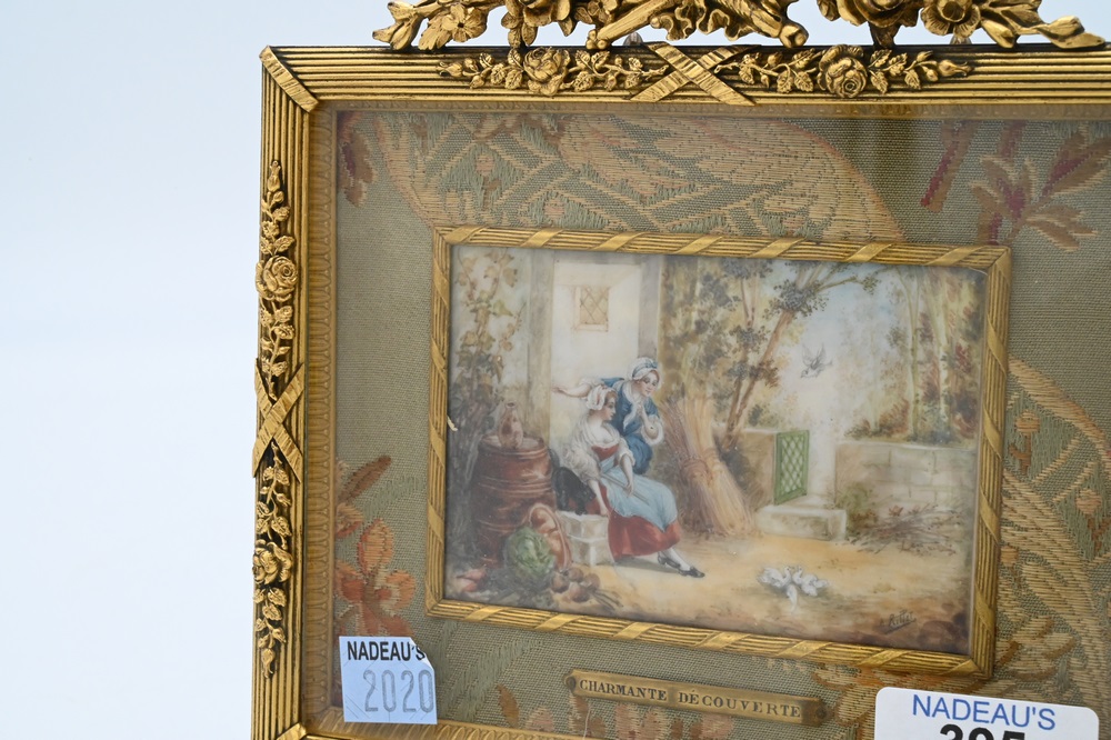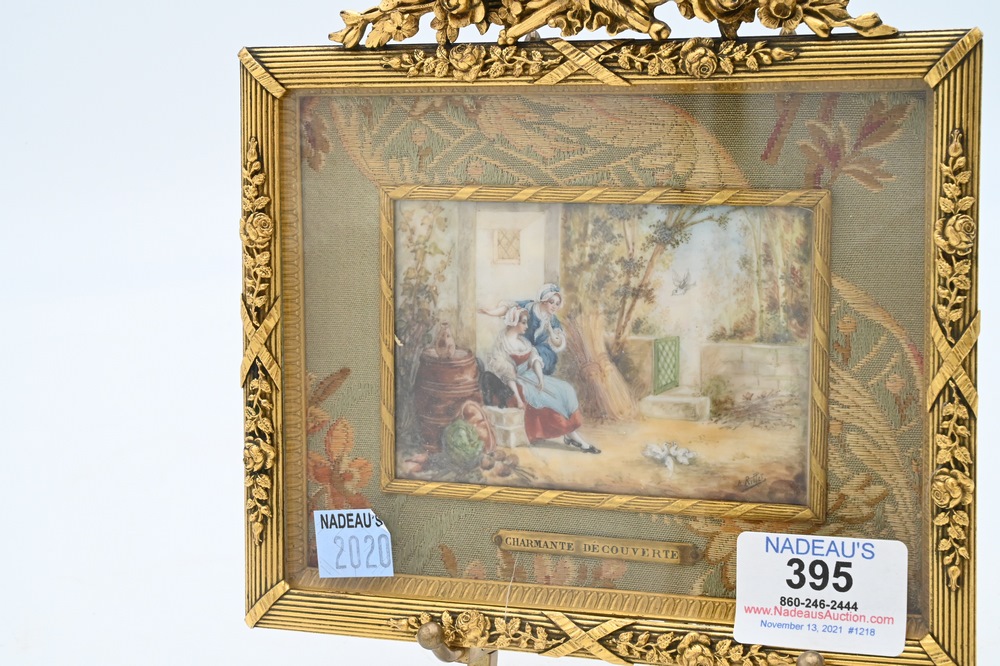Lot 395: French Miniature Painting, two women and a cat feeding birds, “Charmante de Couverte”, in brass frame, signed lower right A. Ritter?, frame height without decorative top 5 3/4 inches, width 7 inches.