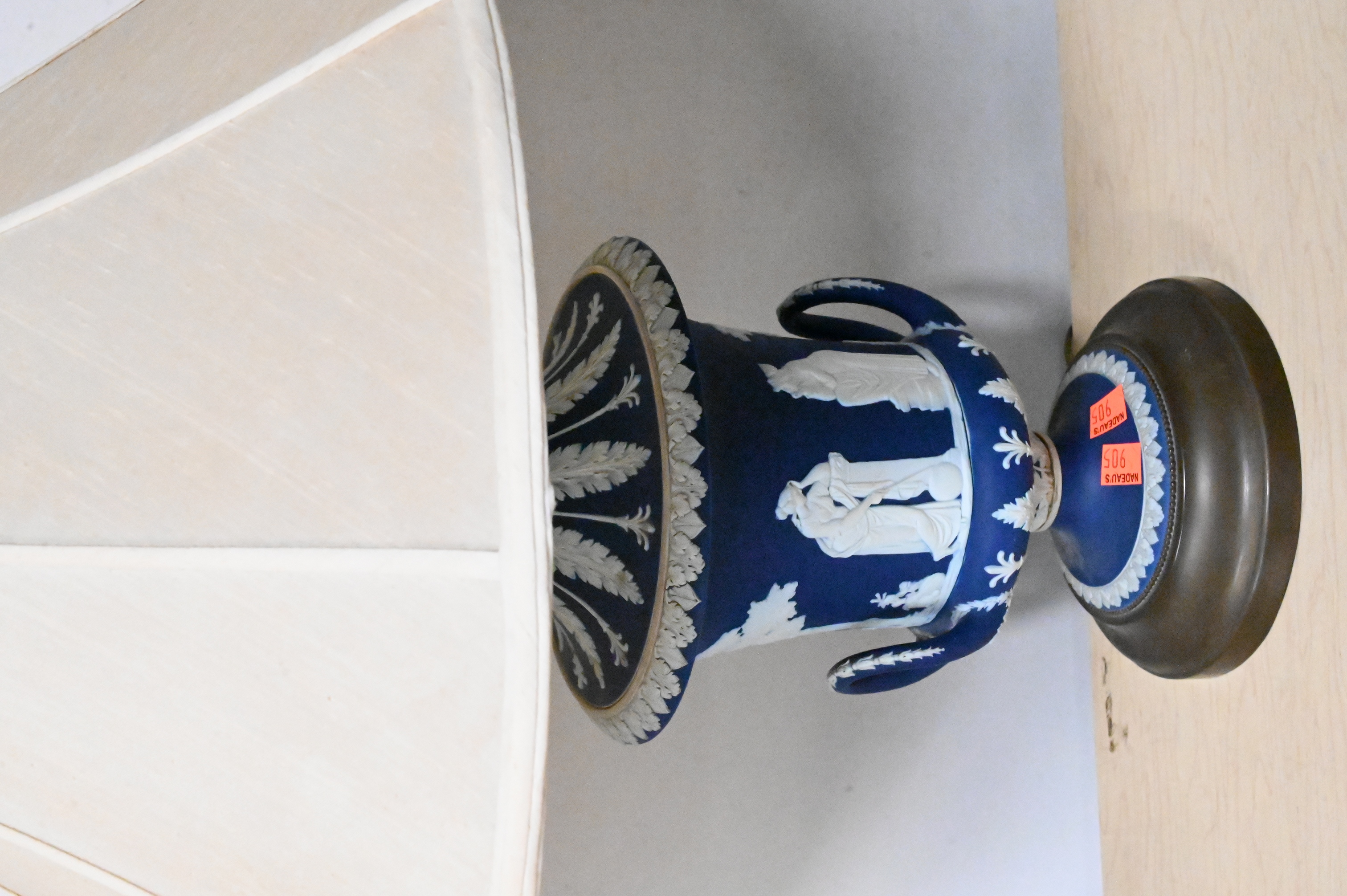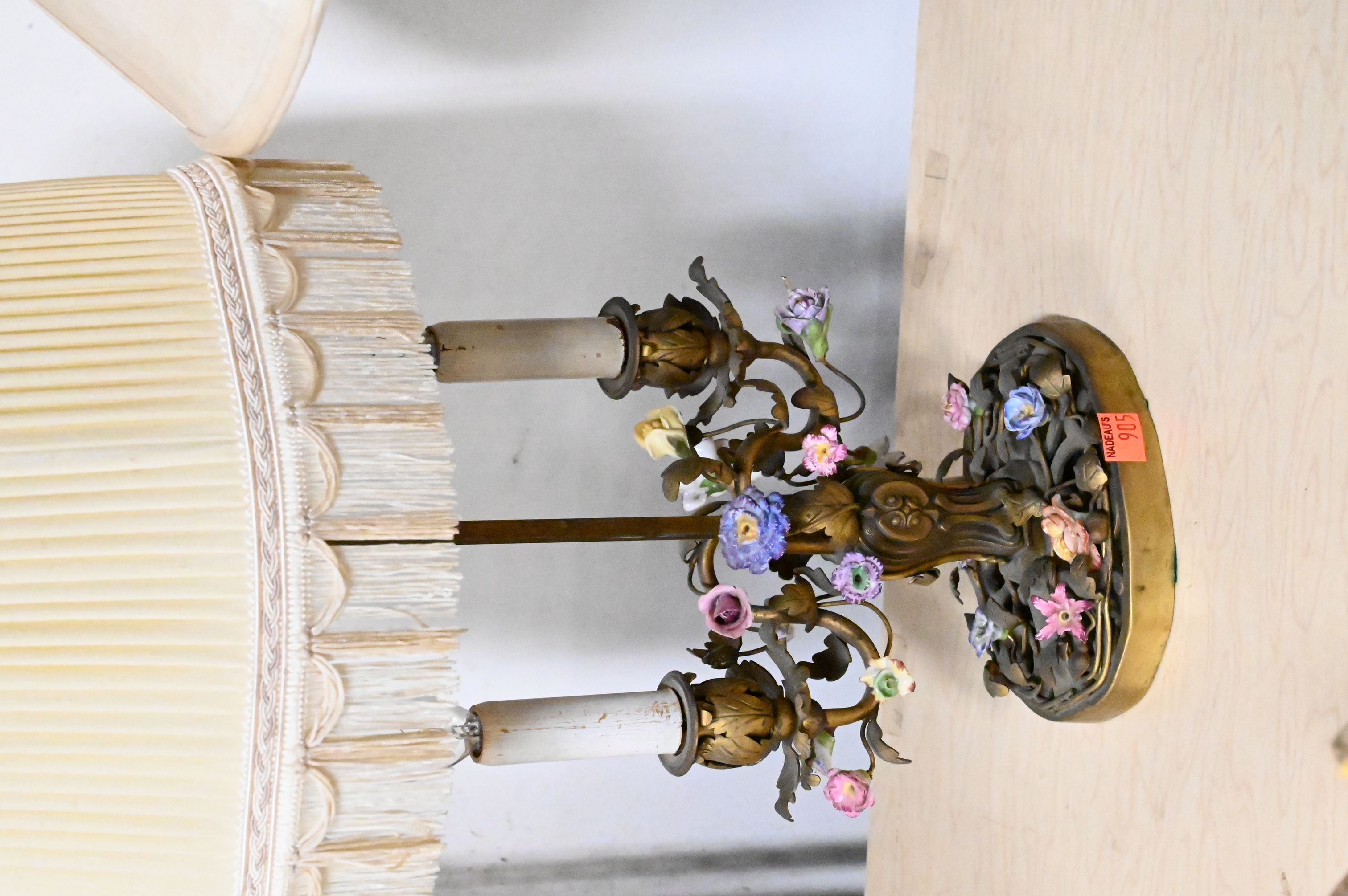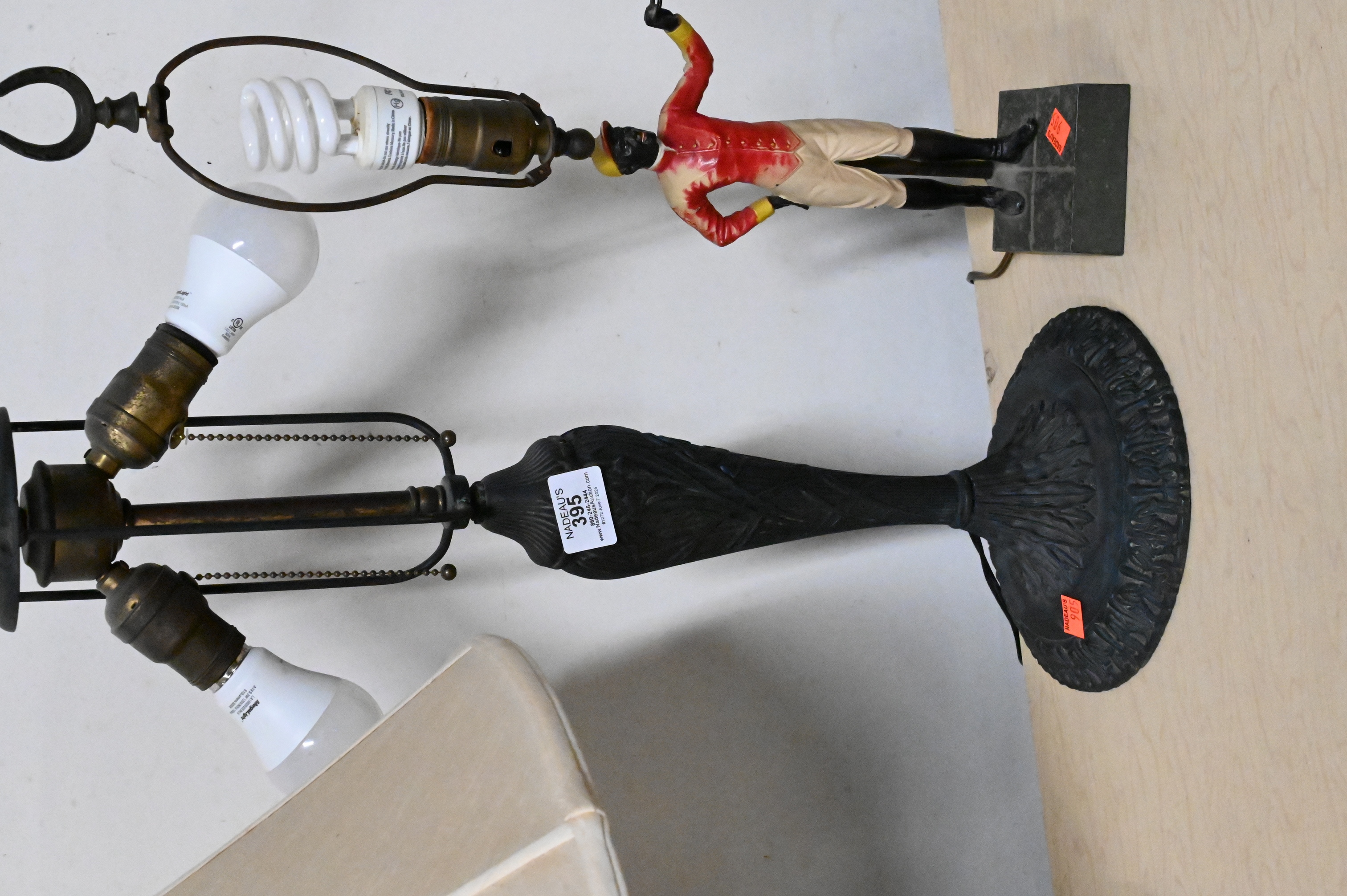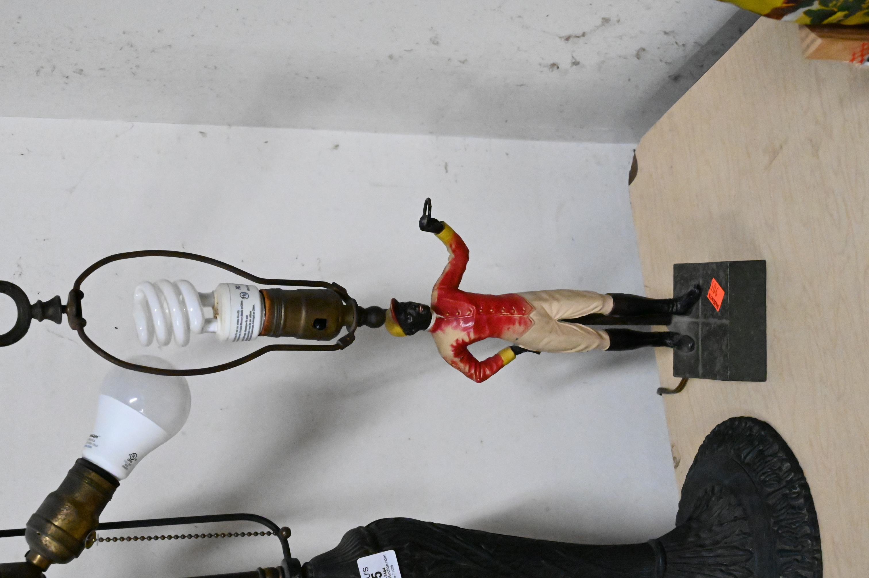 figural lawn jockey black Americana lamp, Wedgewood cameo, iron Art Nouveau style lamp, along with gilt and enamel flower two light candelabra