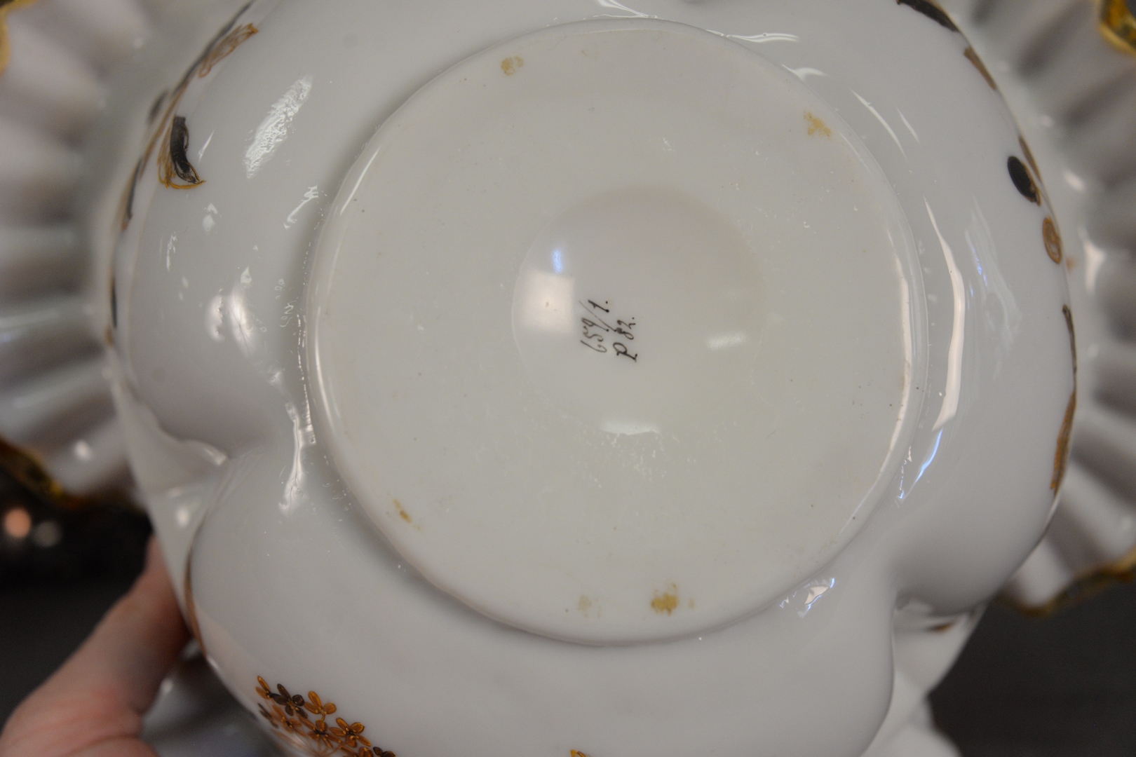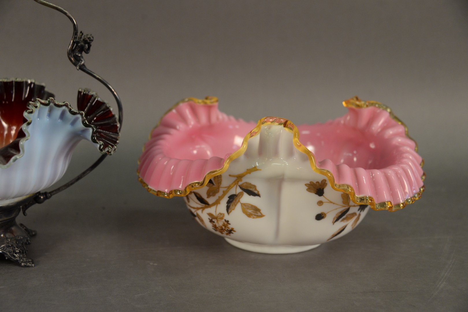 Lot 395: Group of Two Glass Brides Bowls, to include one having silver plated base, the other having floral details to the exterior, height 6 inches, diameter 13 inches. Provenance: Estate of James Wadhams