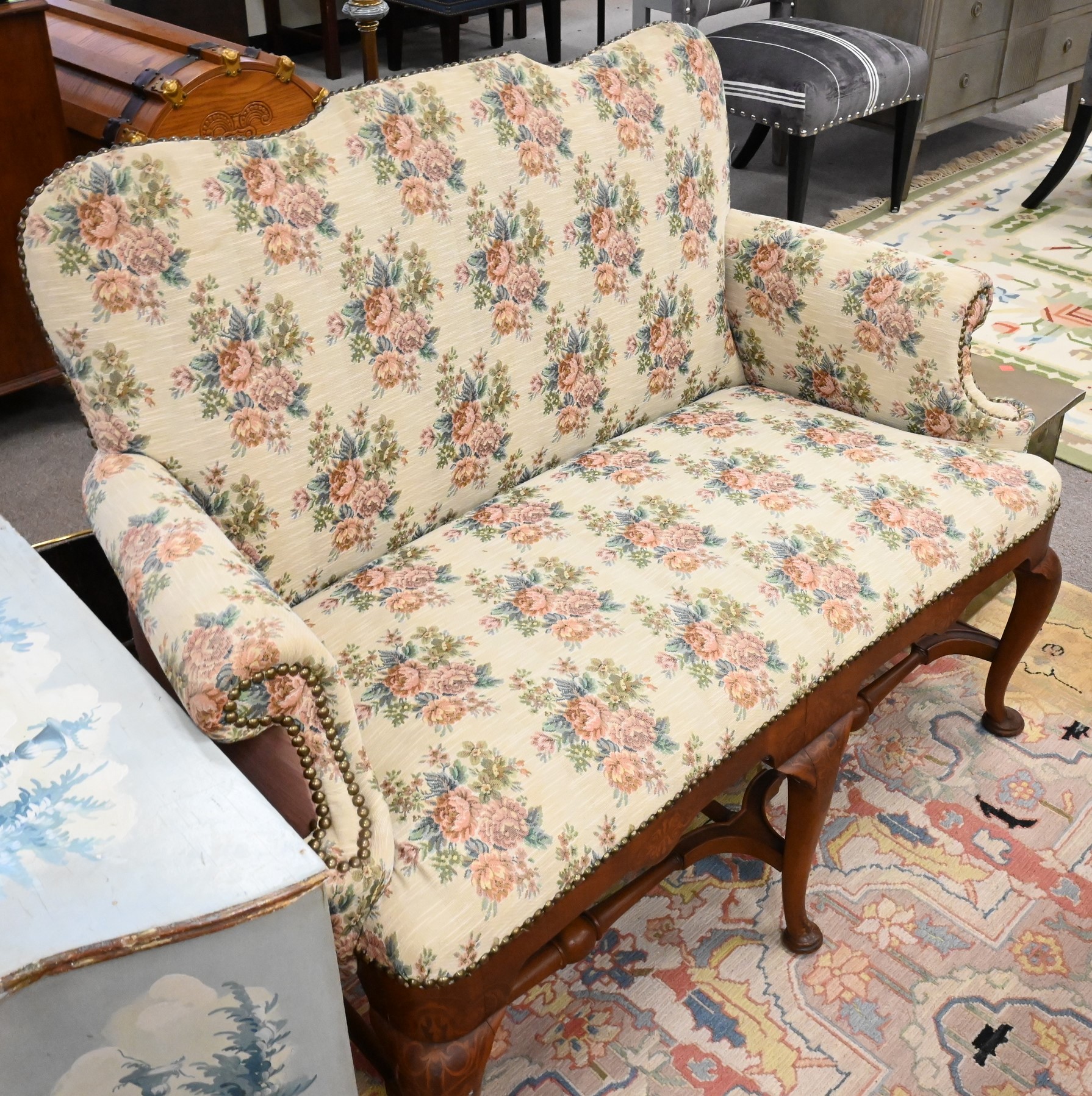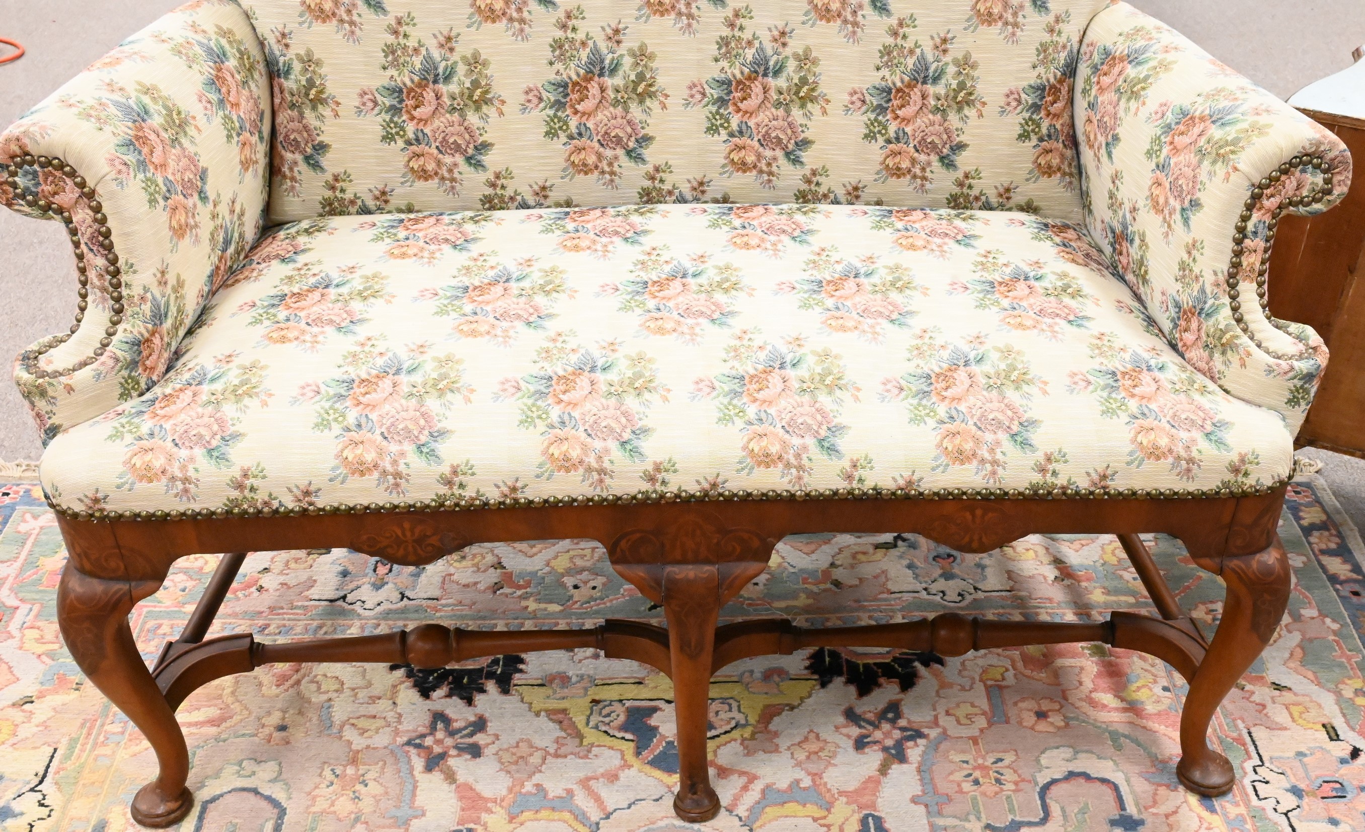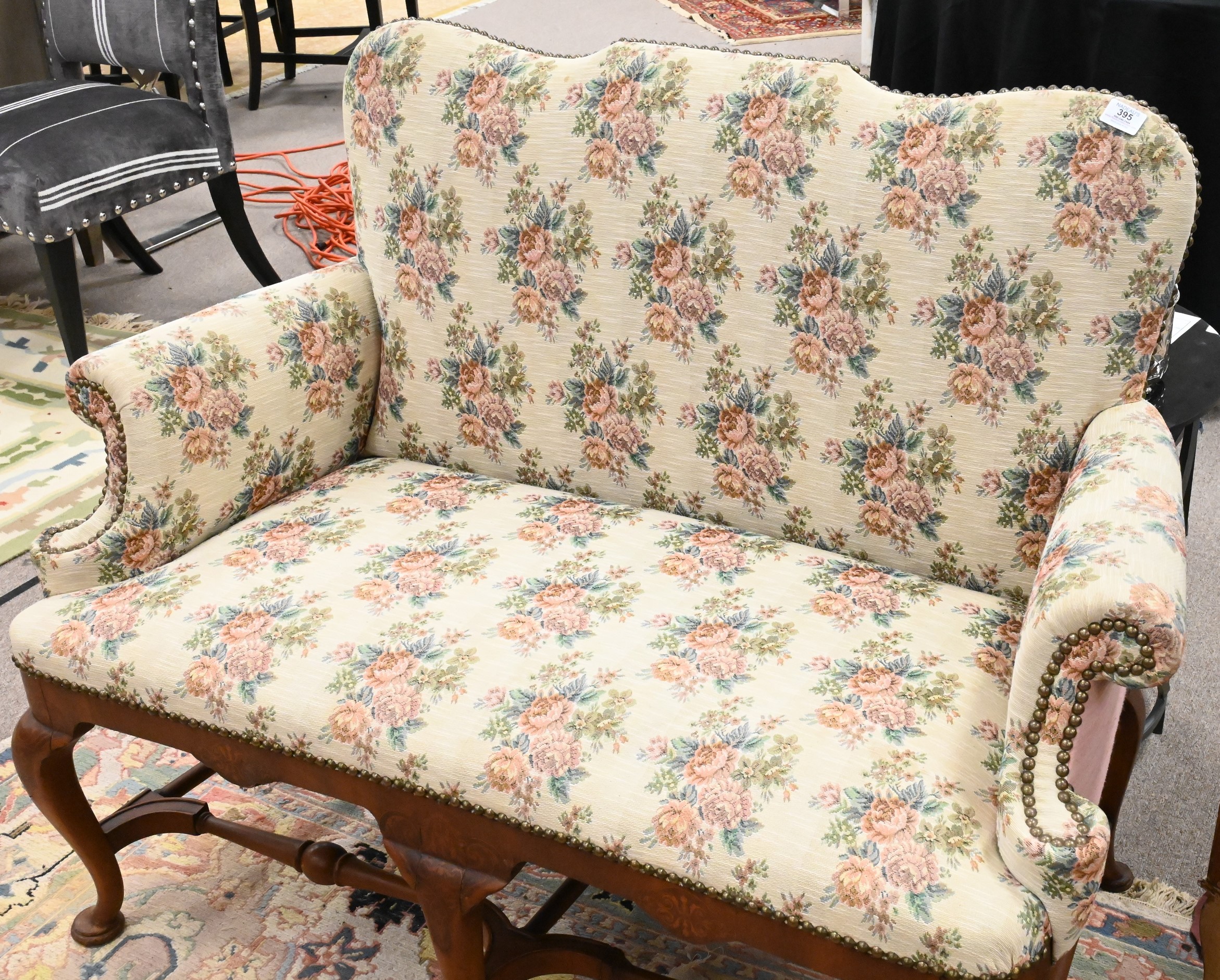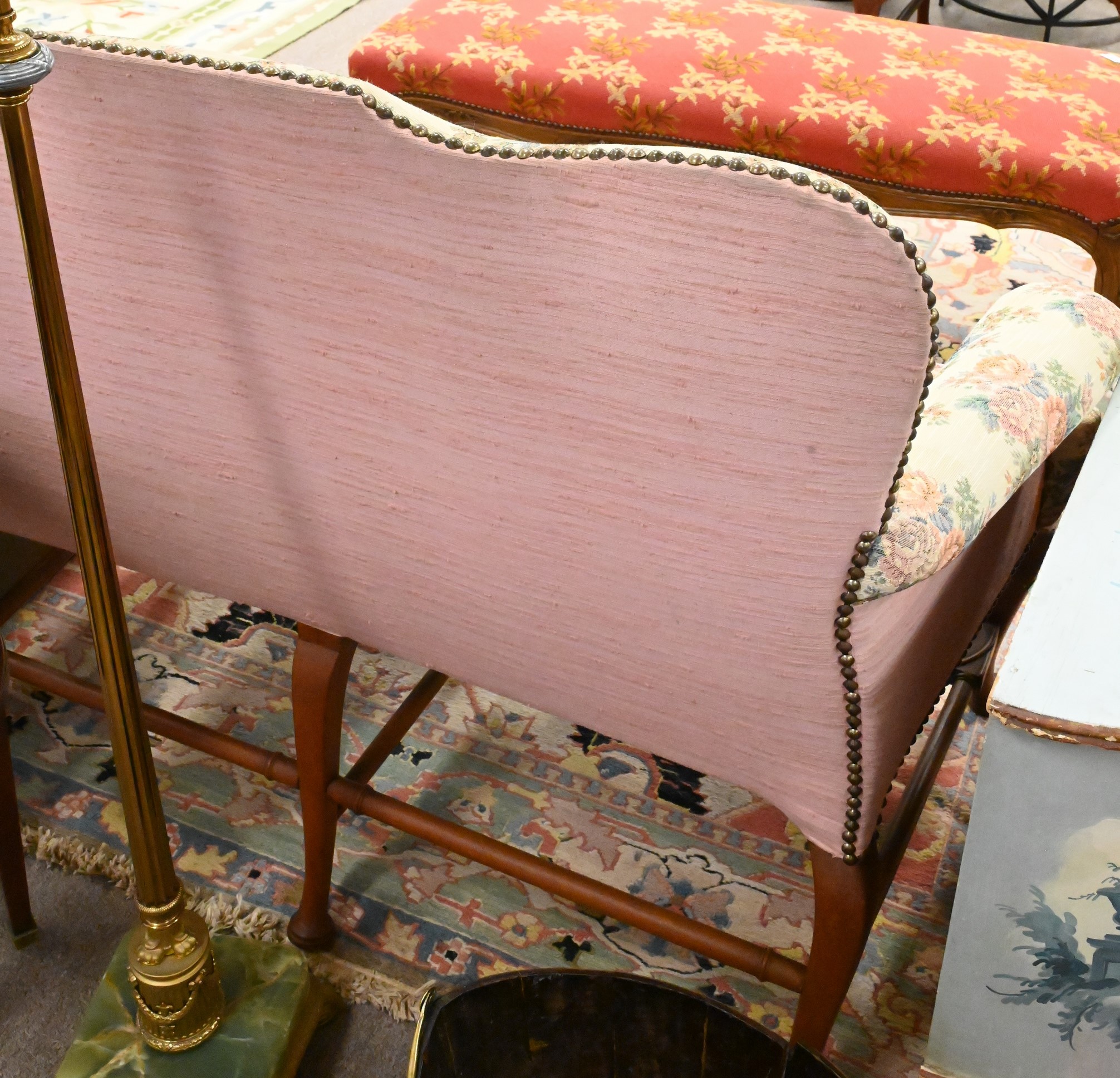having shaped backs and floral upholstery over stretcher base and pad feet