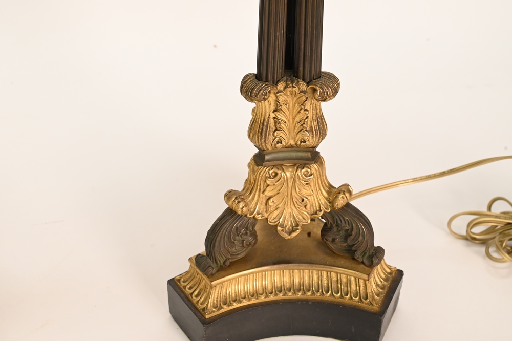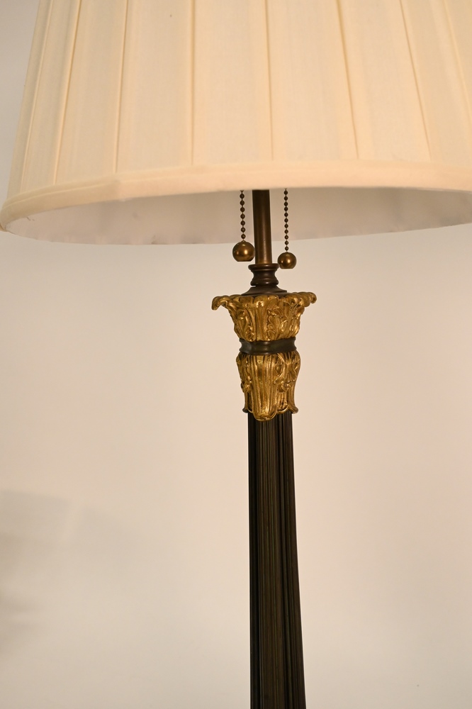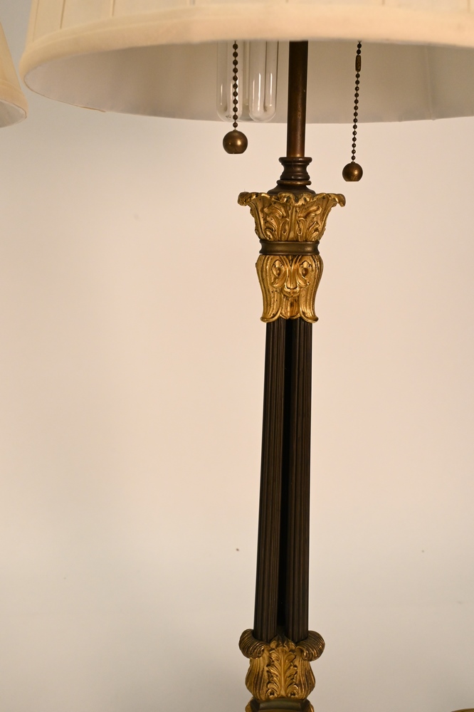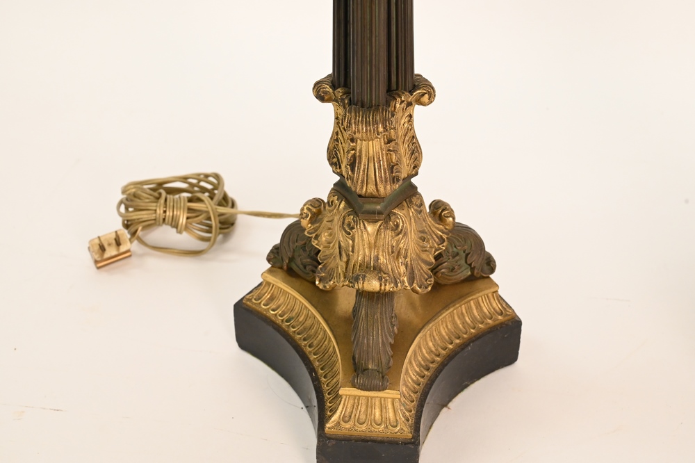 Lot 395: Pair of Regency Bronze Column Candlesticks, having gilt bronze top on triple column shaft on scrolling tripod base, height 36 inches.