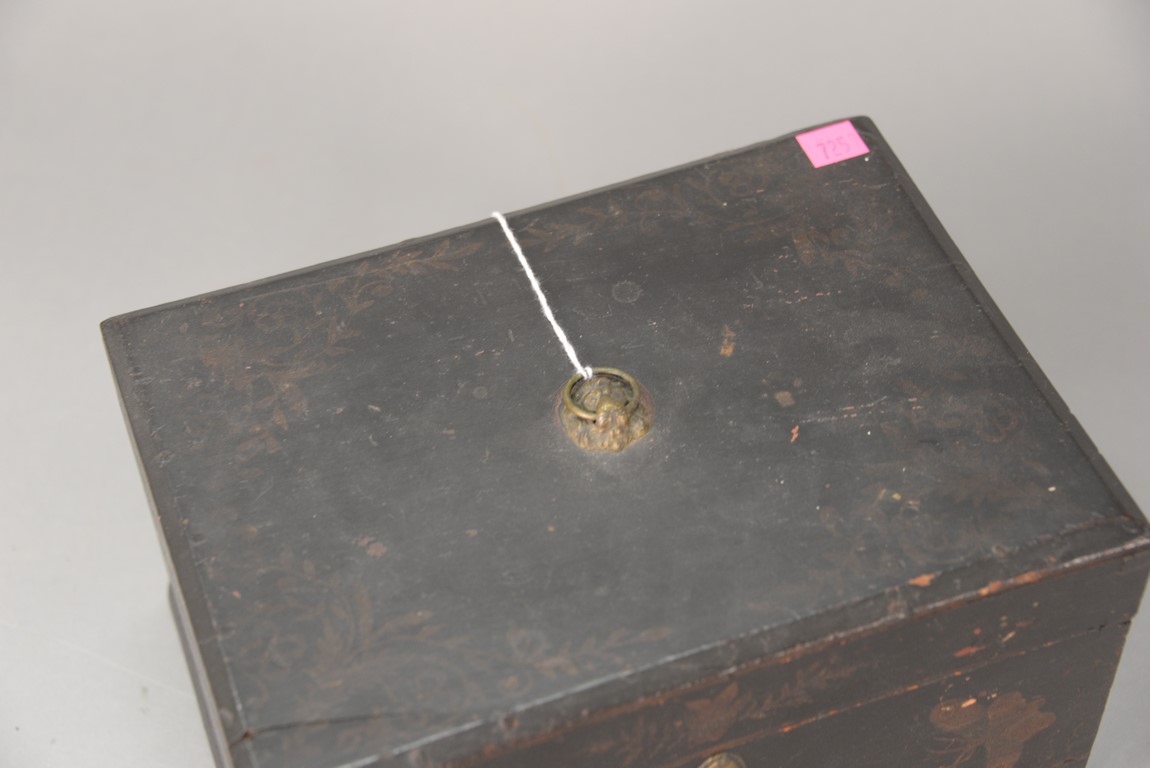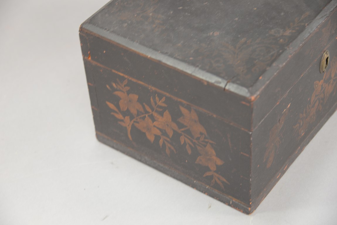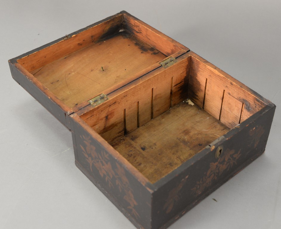 Primitive hinged covered box having dovetailed corners and original black paint with gold stenciled flowers and butterflies. ht. 6 1/2 in. wd. 10 3/4 in.