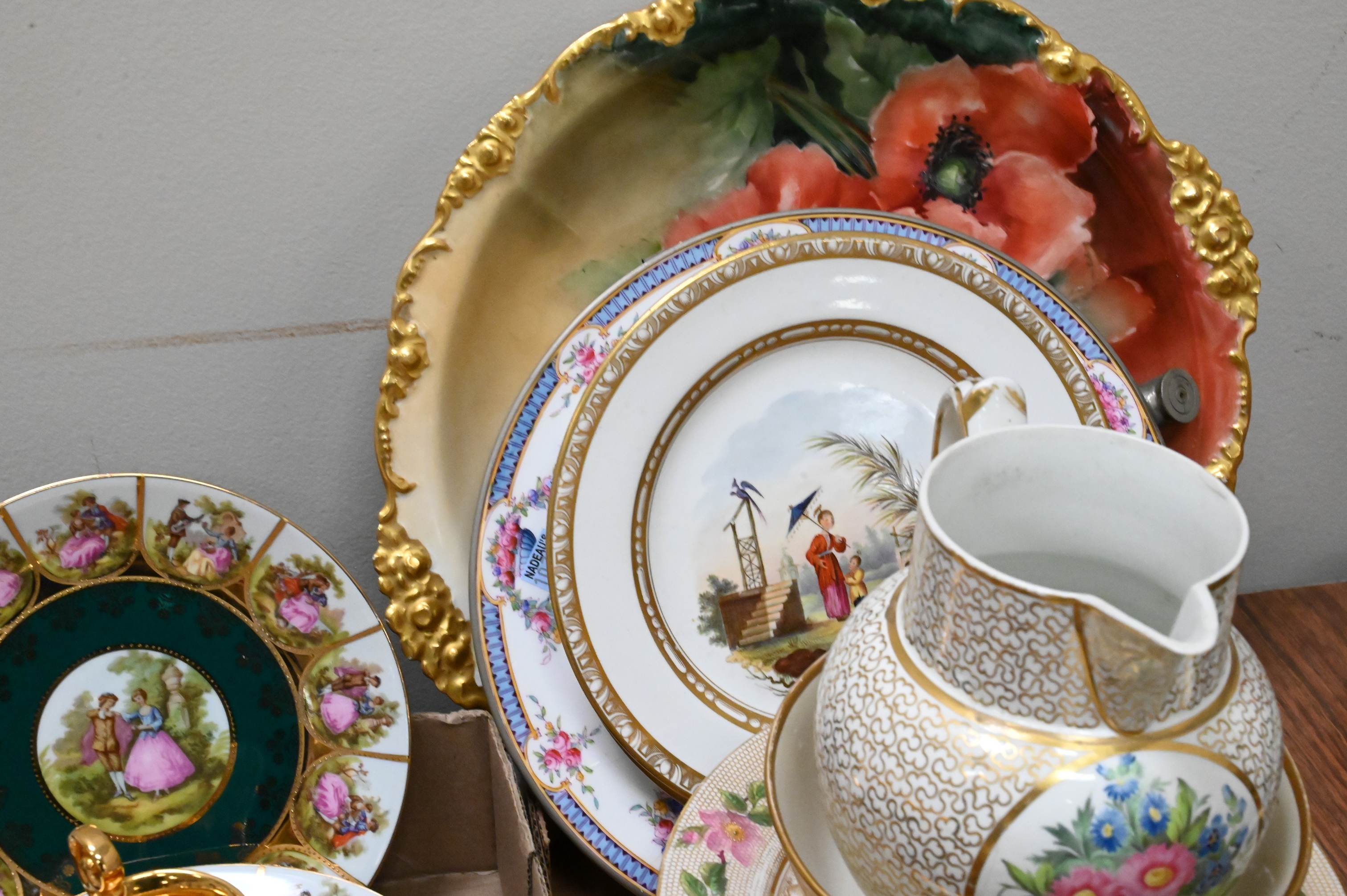 to include Royal Vienna service for four demitasse set in “Fragonard Love Story”, hand painted and gilt Limoges France platter, dish and plates, lustreware bowl and tea service, etcetera