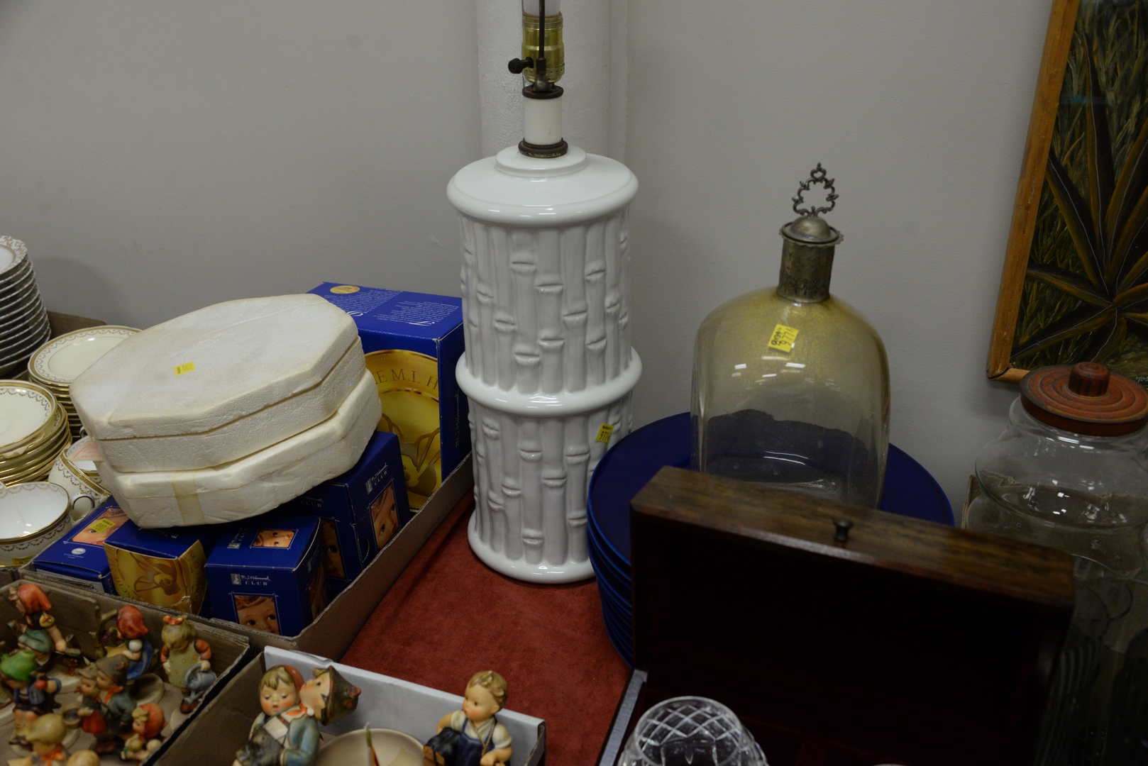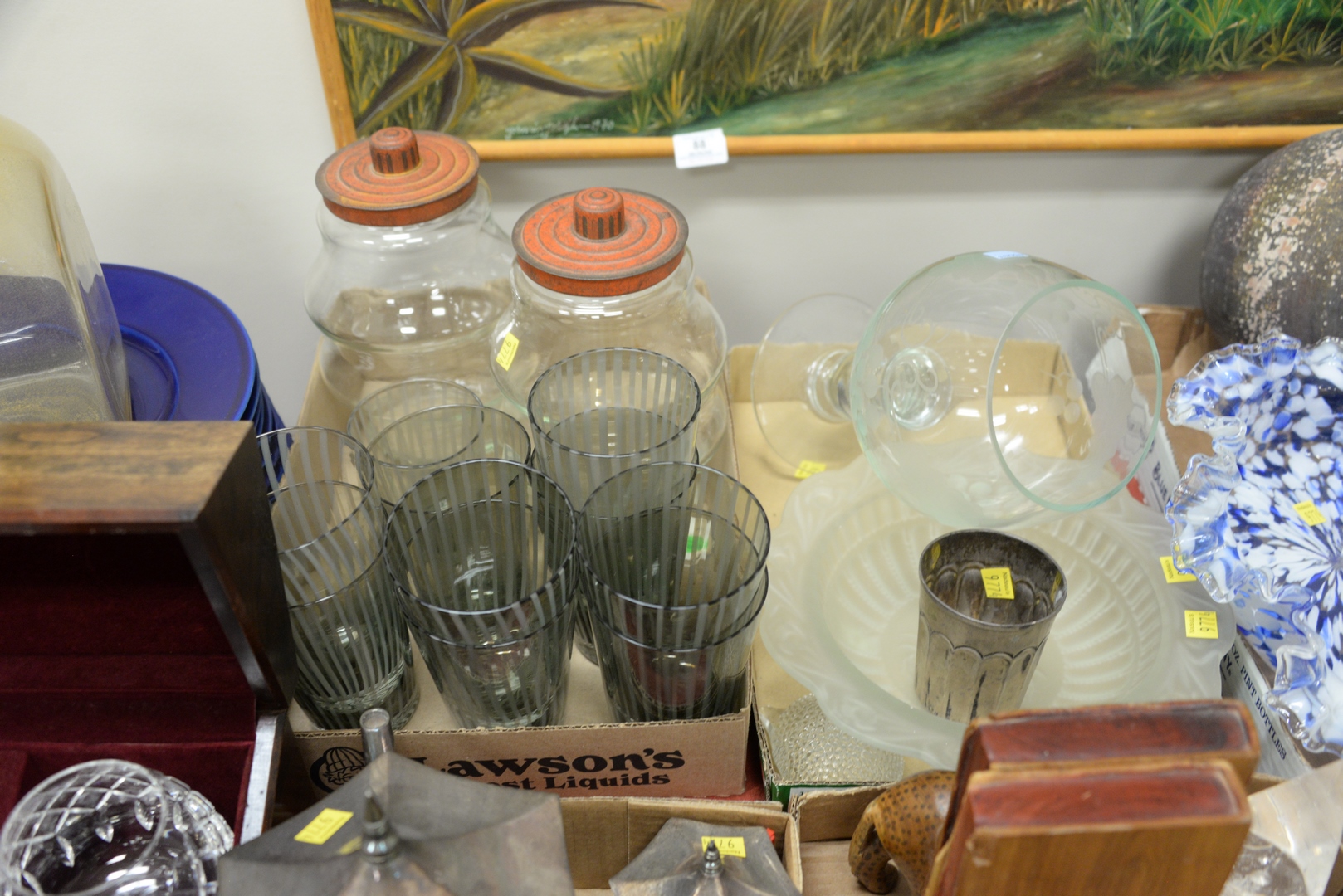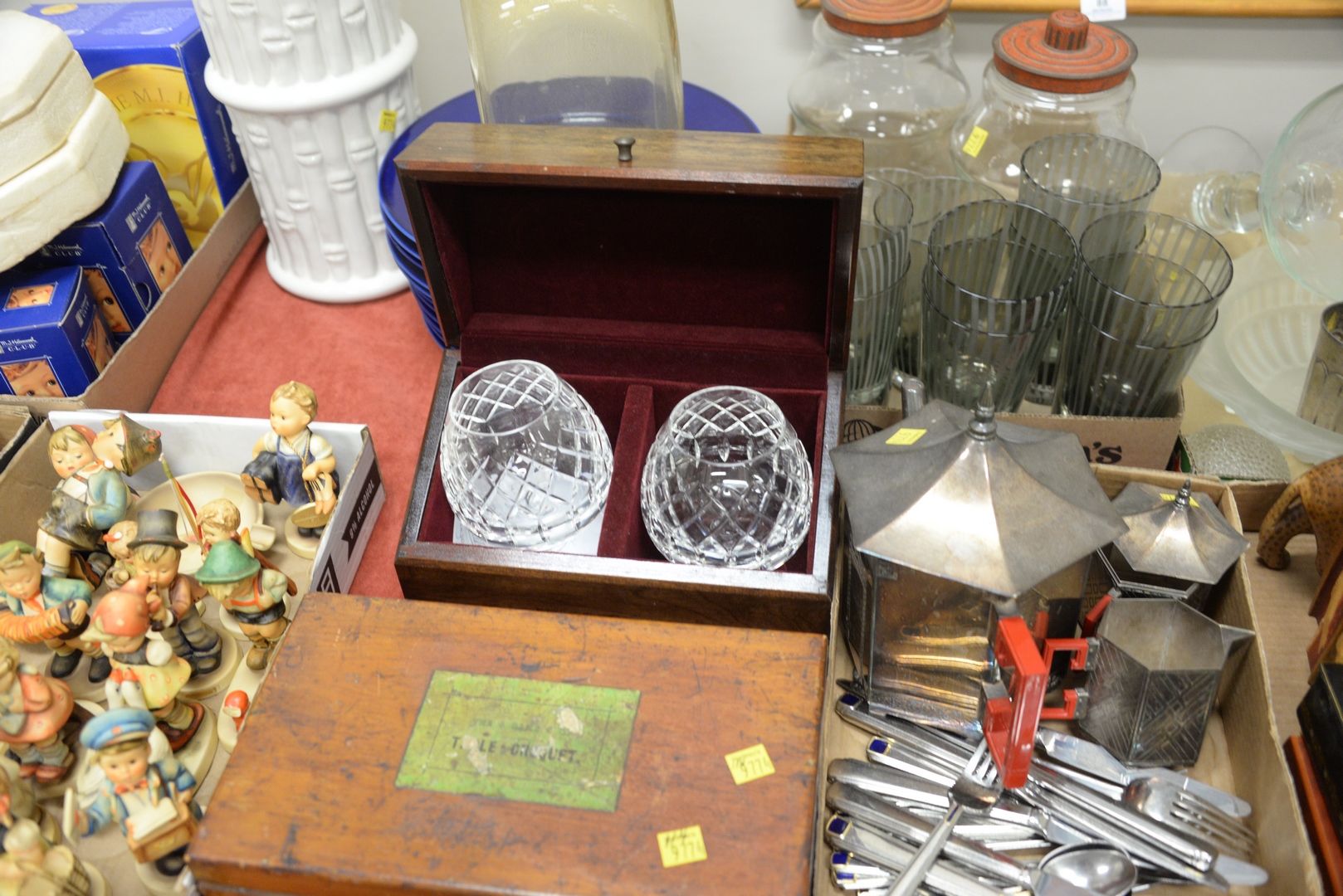 Six Tray Lots to include assorted items, set plates, glasses, animal bookends, shells, silver plate, tea set, art glass bowl, large square bottle with silver top, pair of tin covered jars, terracotta vessel by Pier One, Cartier rocks glasses in fitted box, miniature croquet set, along with a quill box, etc. Provenance: Property from the Estate of Alexis Gregory, Sold to Benefit the Alexis Gregory Foundation