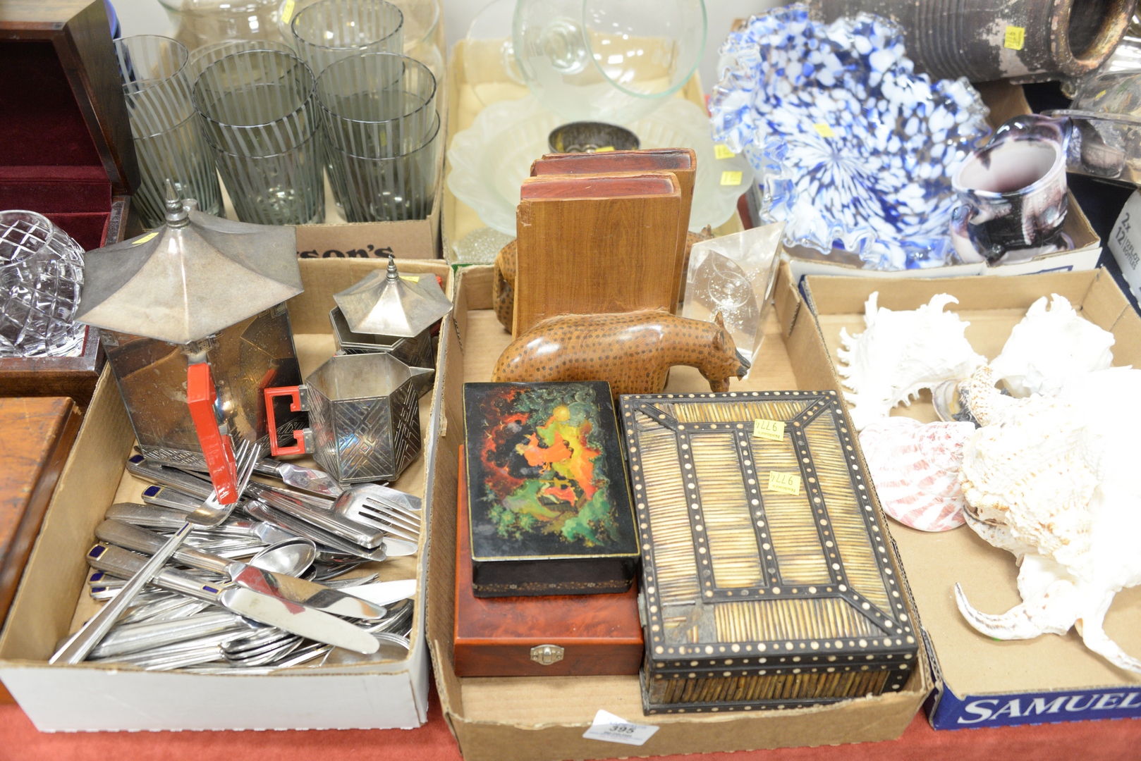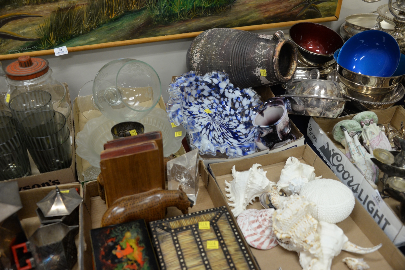Lot 395: Six Tray Lots to include assorted items, set plates, glasses, animal bookends, shells, silver plate, tea set, art glass bowl, large square bottle with silver top, pair of tin covered jars, terracotta vessel by Pier One, Cartier rocks glasses in fitte