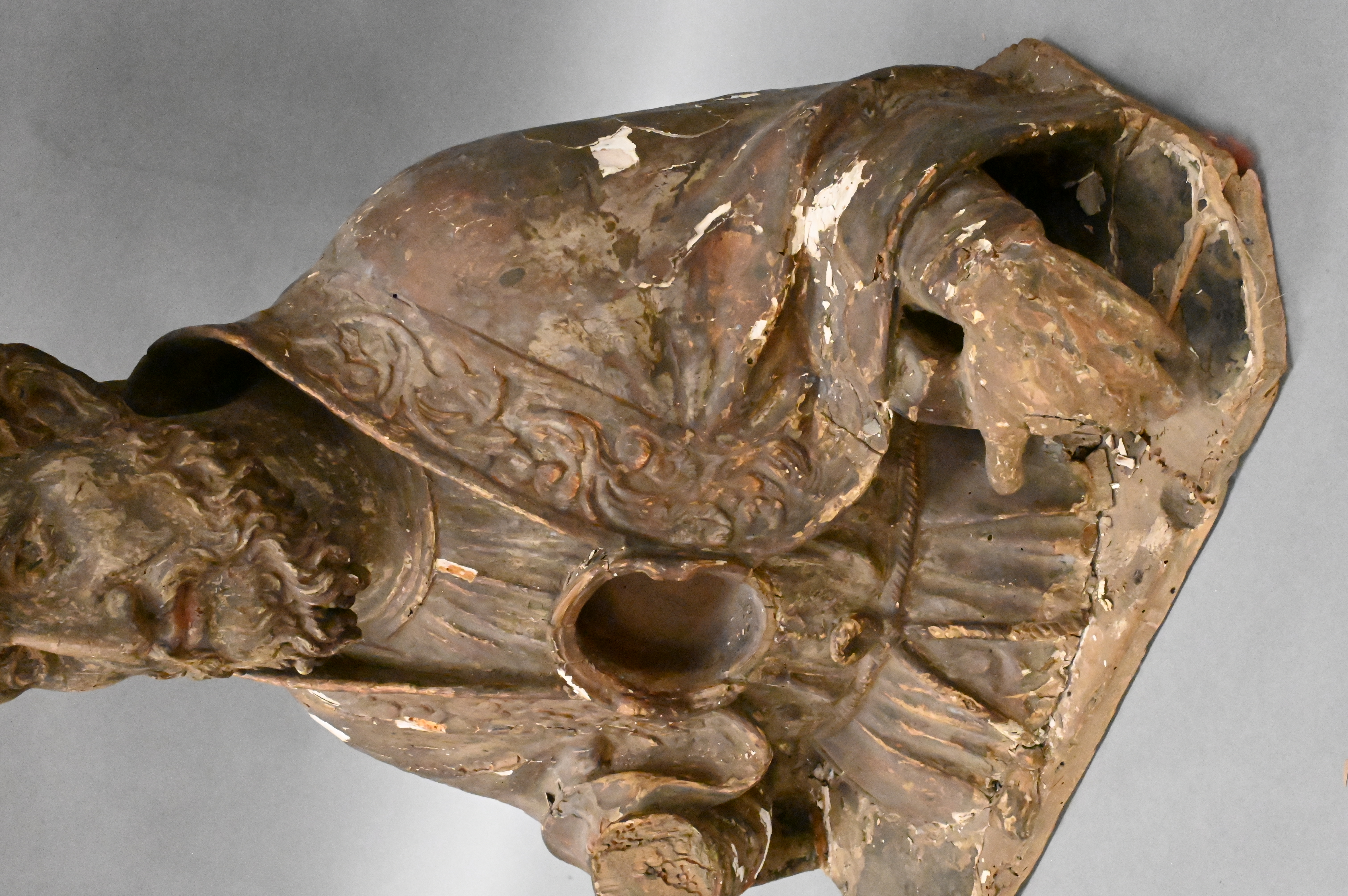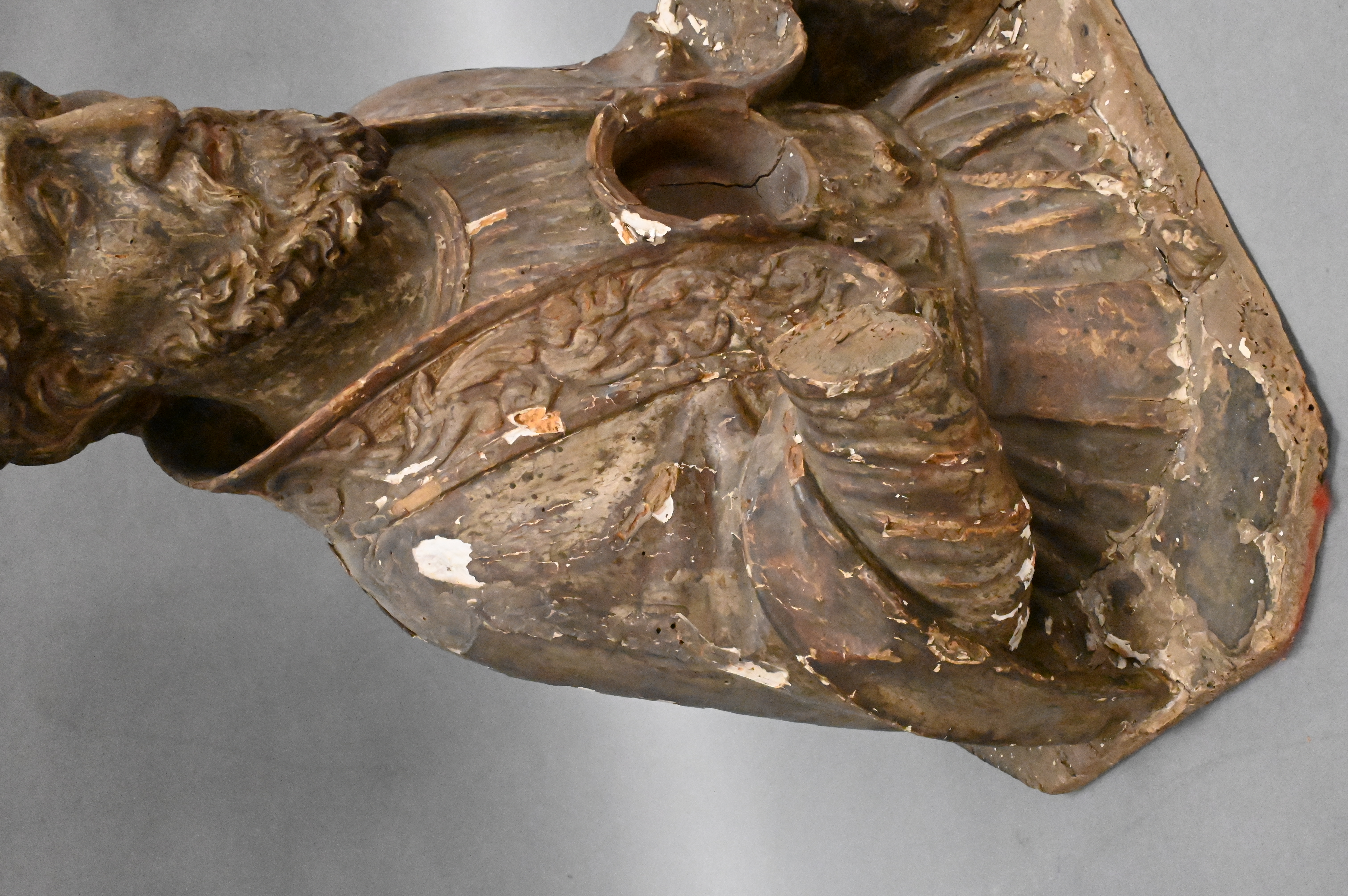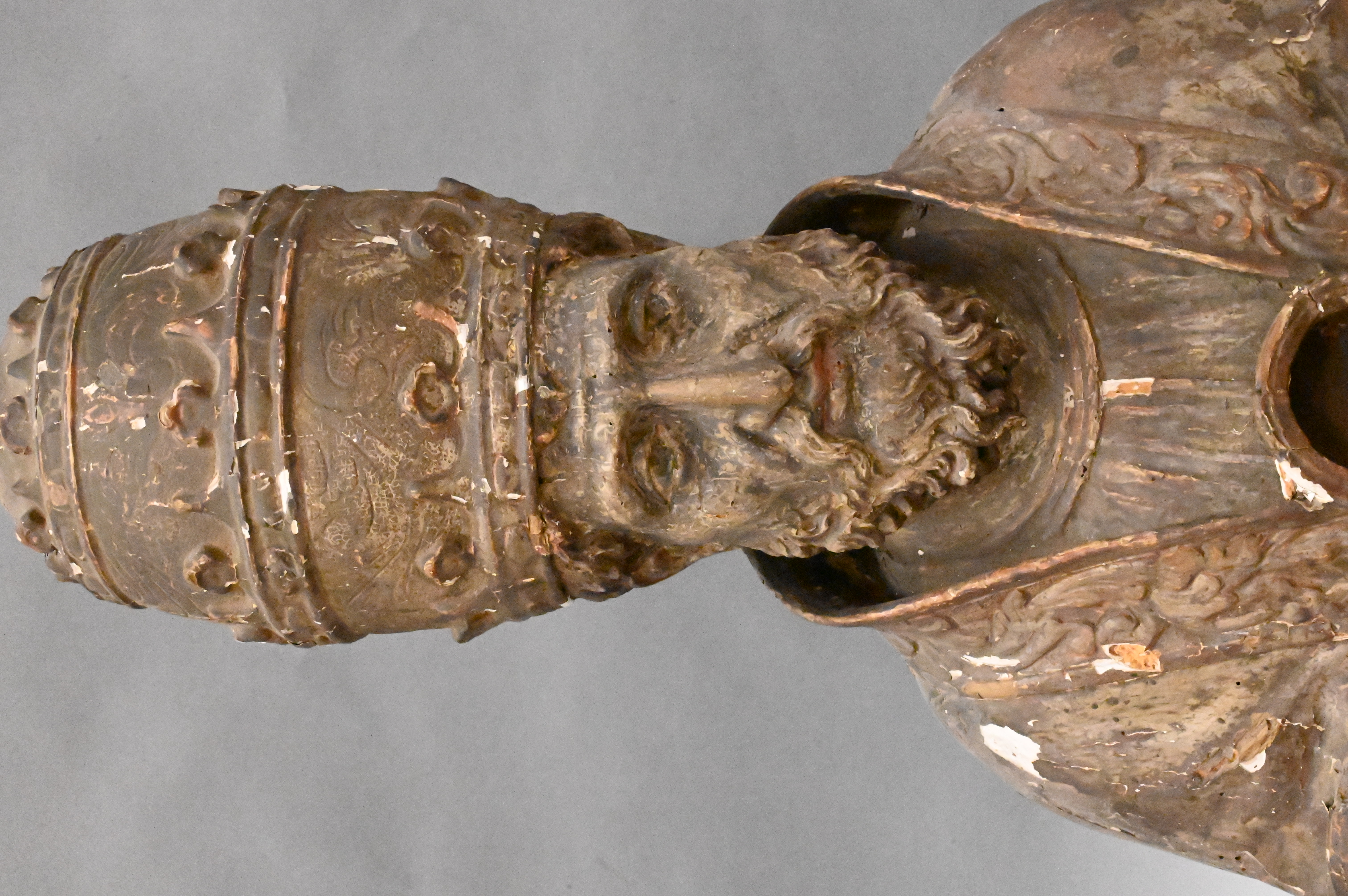 from waist up, carved wood and gesso with traces of polychrome and paint, circa 17th/18th century