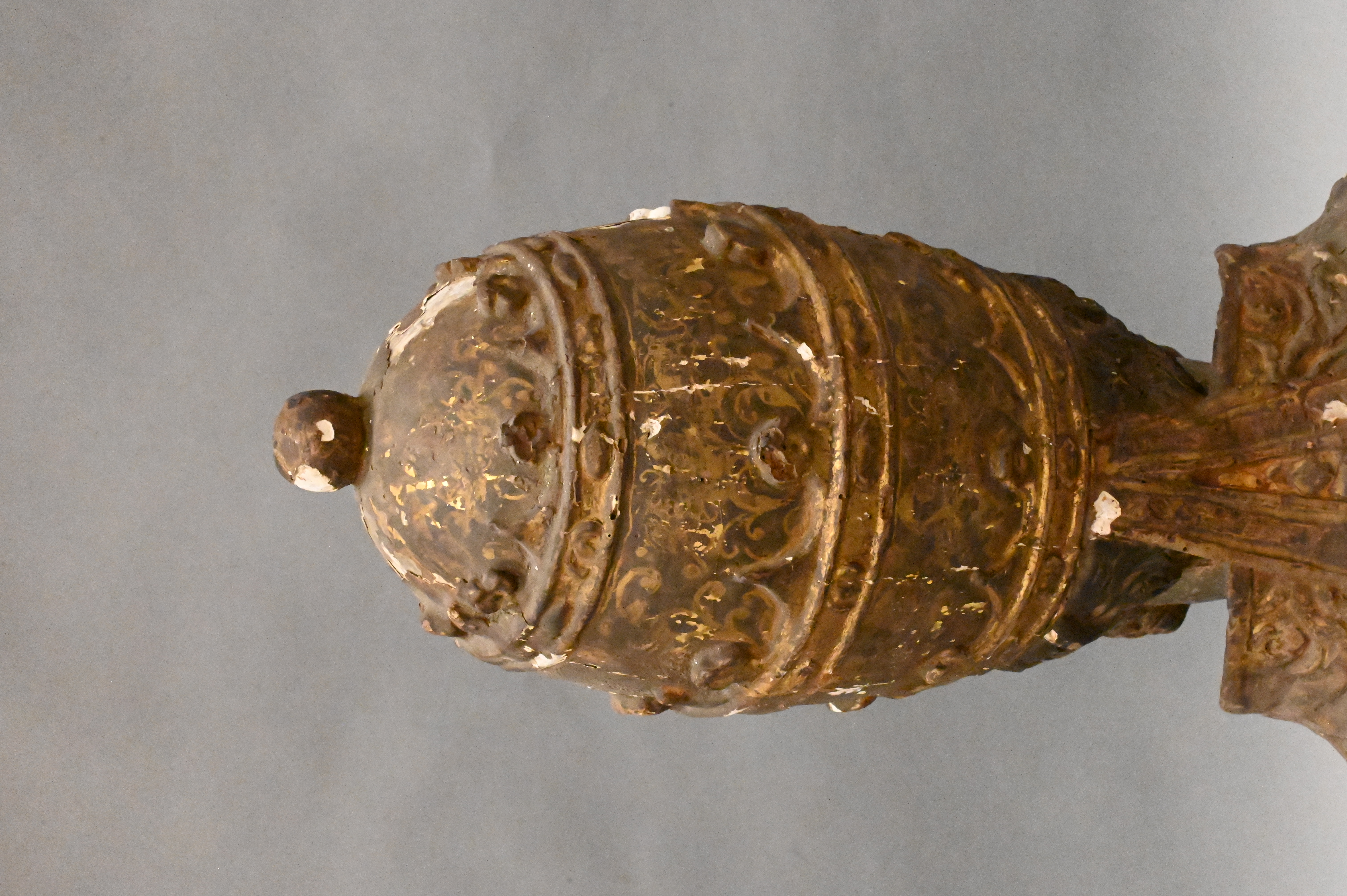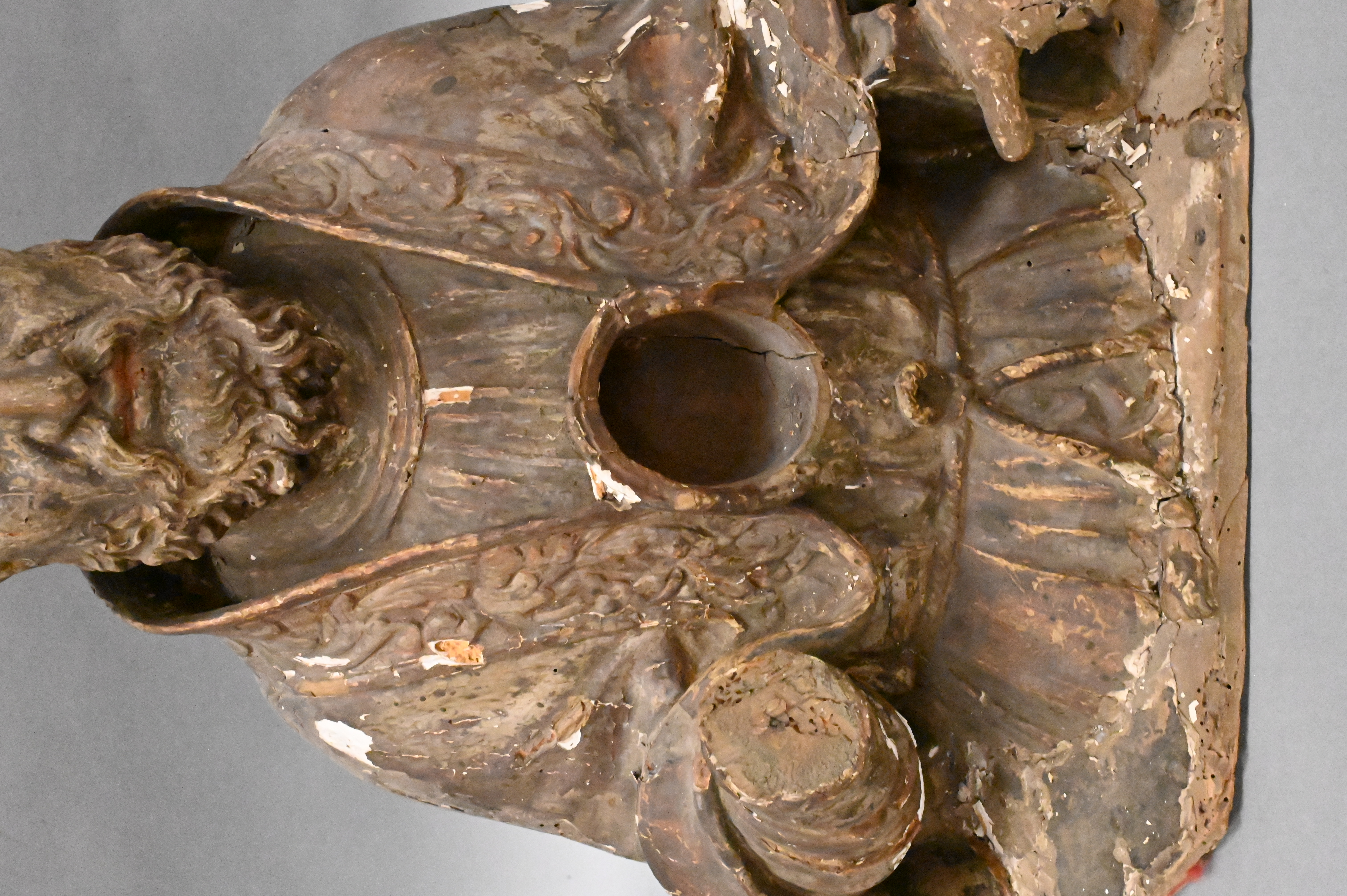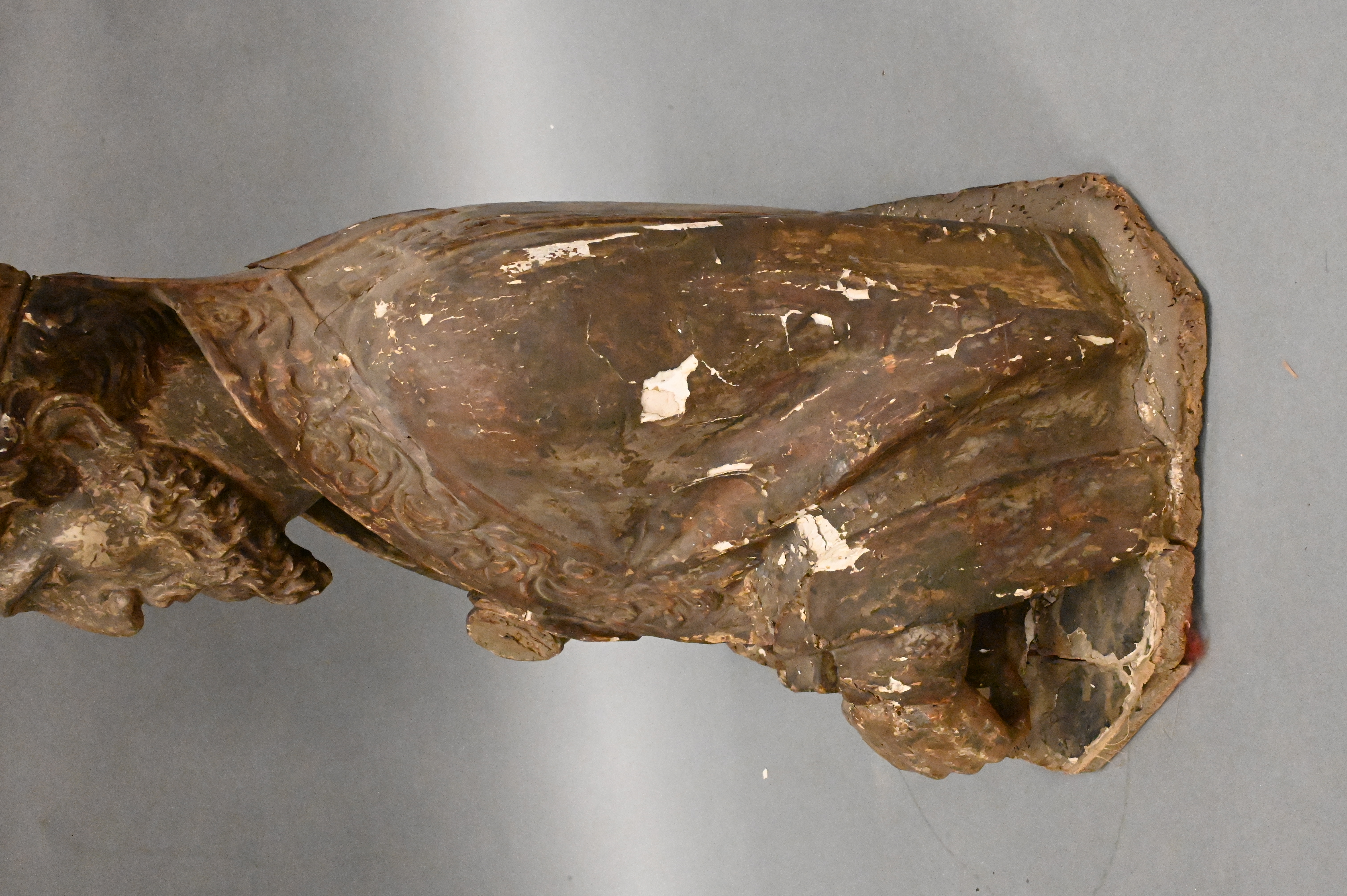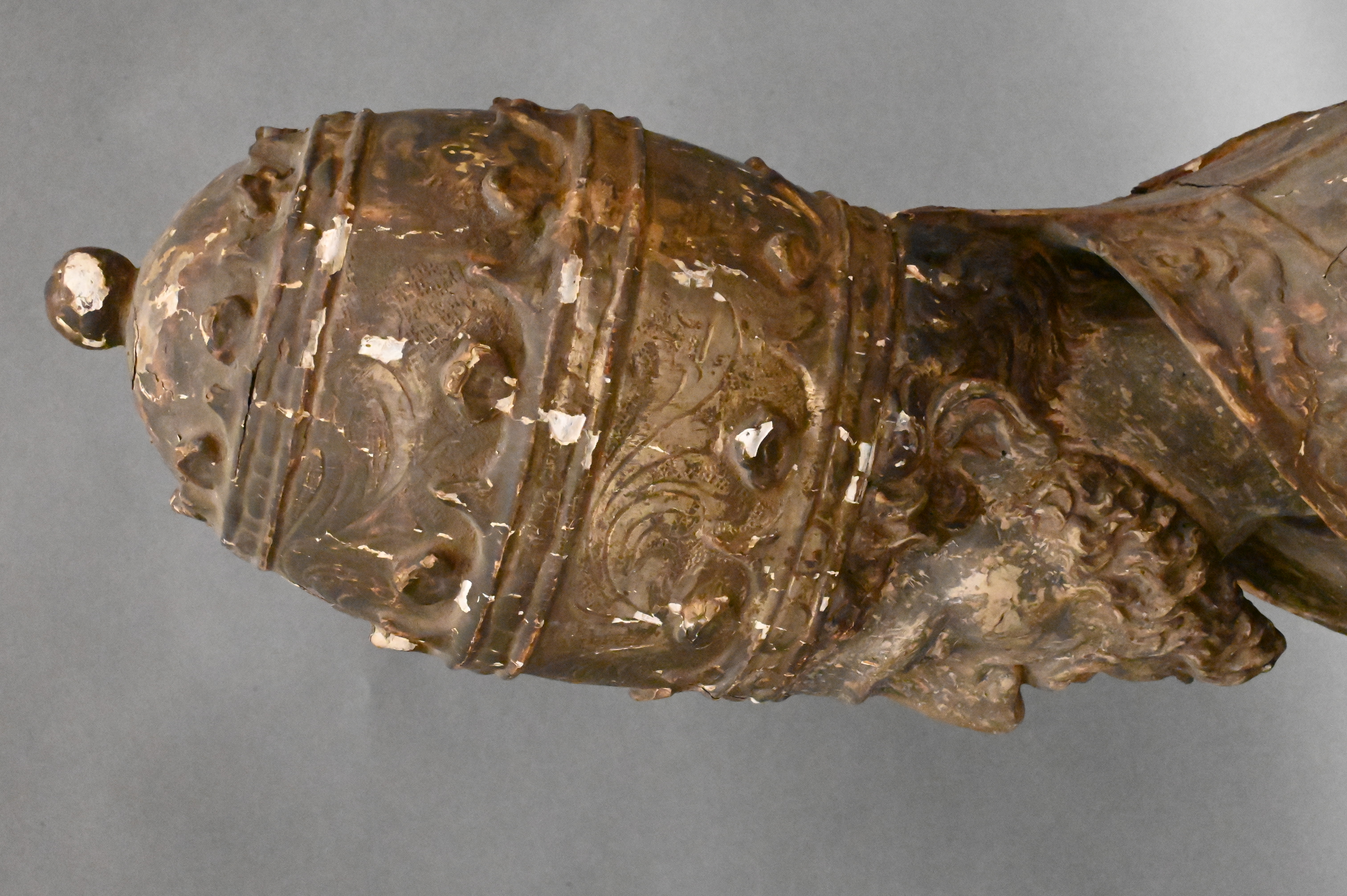 from waist up, carved wood and gesso with traces of polychrome and paint, circa 17th/18th century