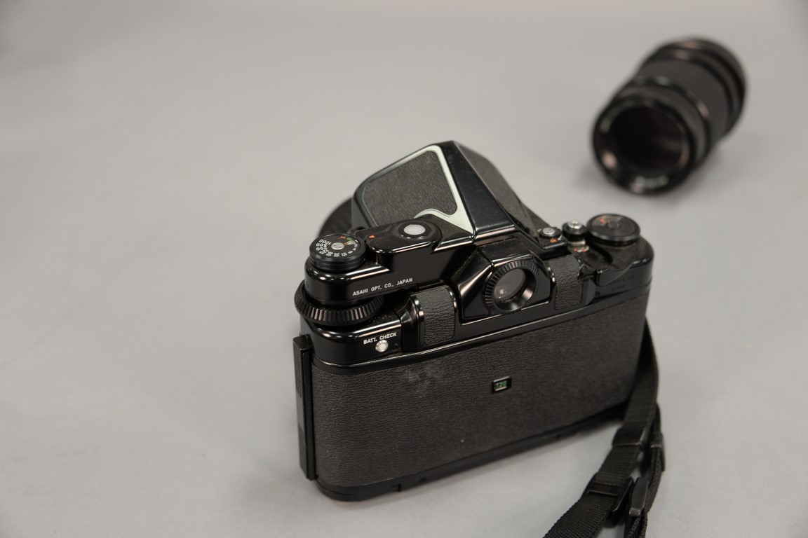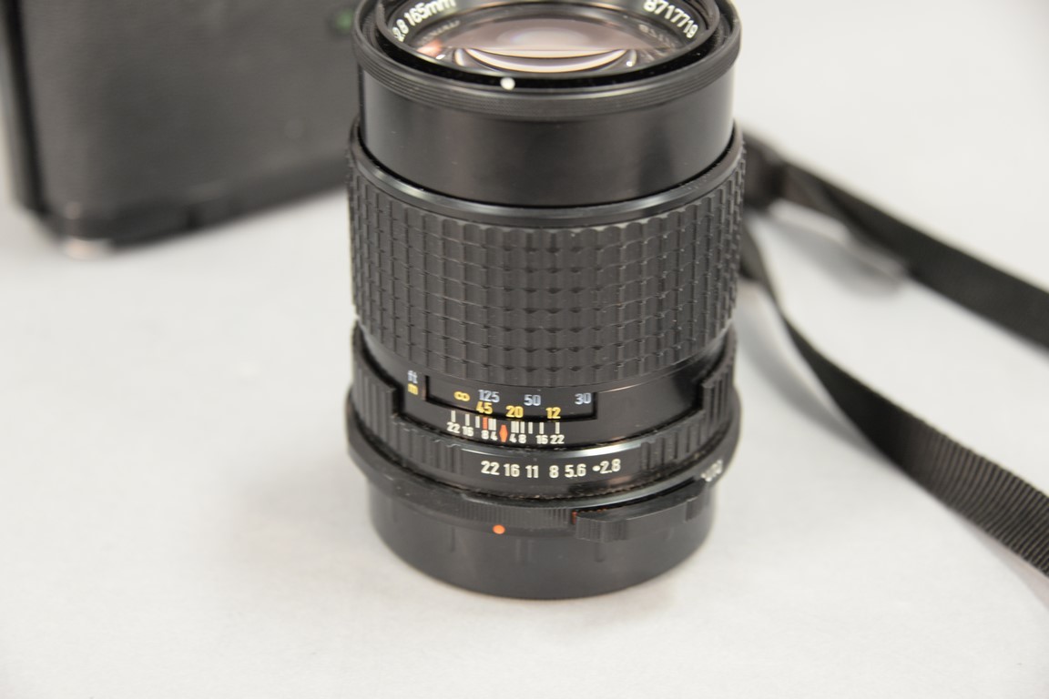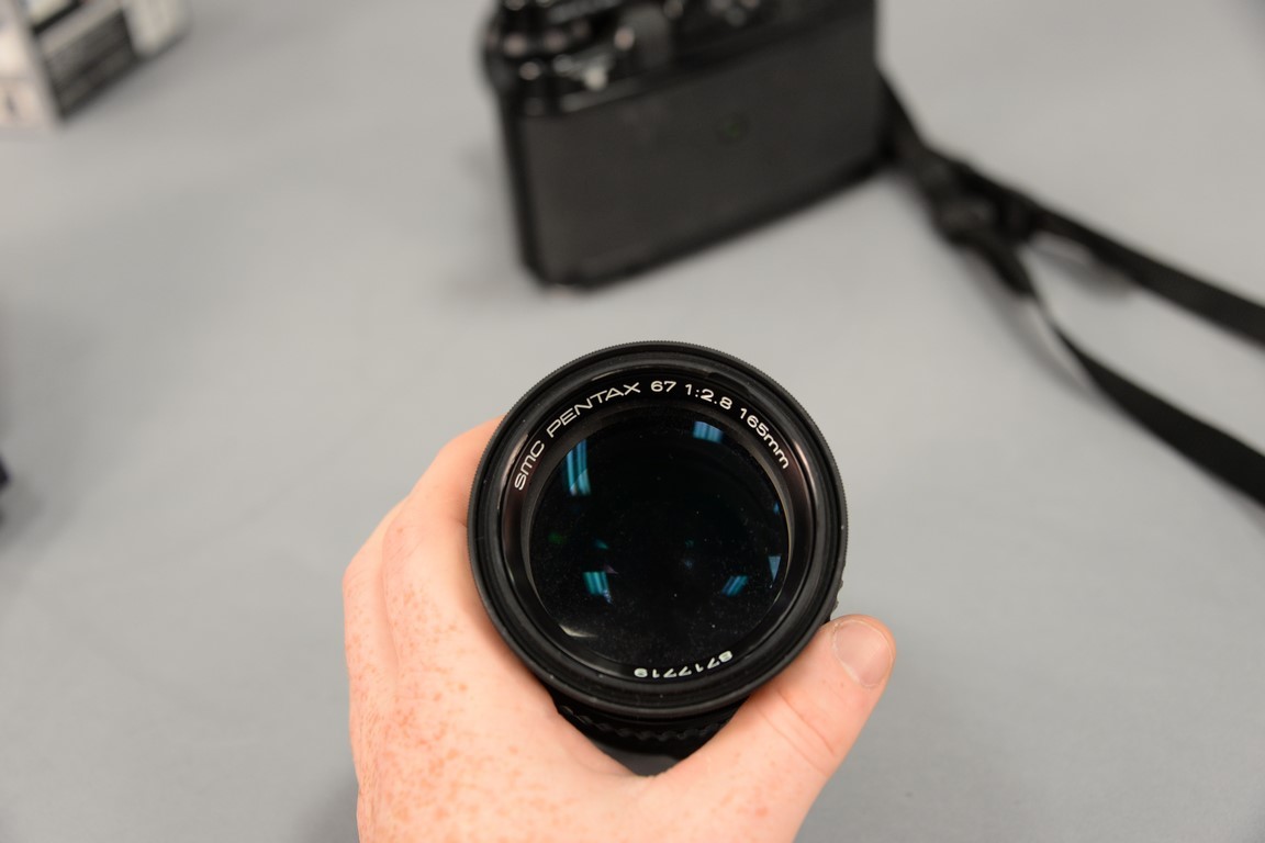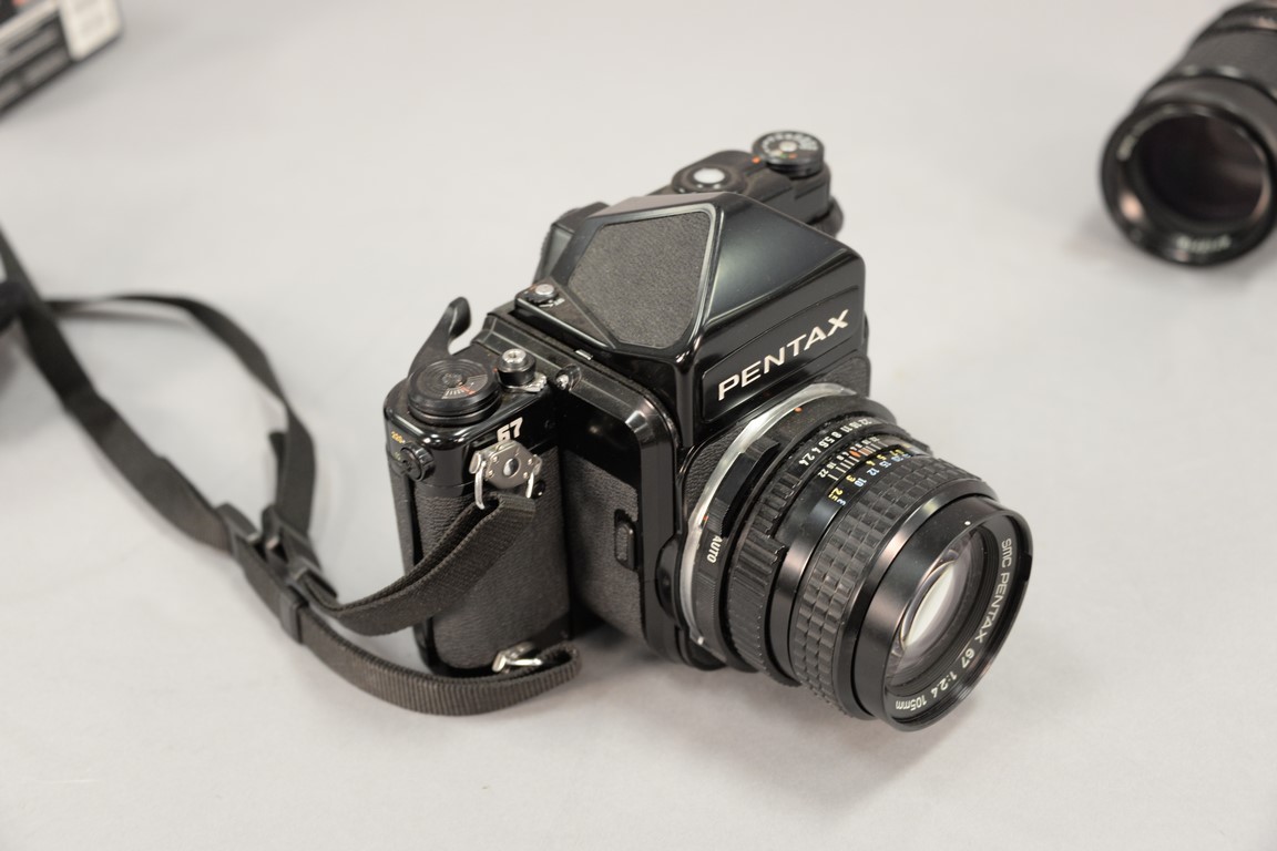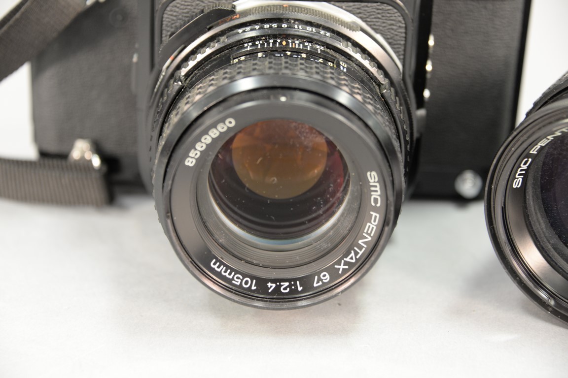 Lot 395: Two piece lot to include Pentax 67 outfit with 67 body, 105/2.4 lens, 165/2.8 lens, and metered finder.
