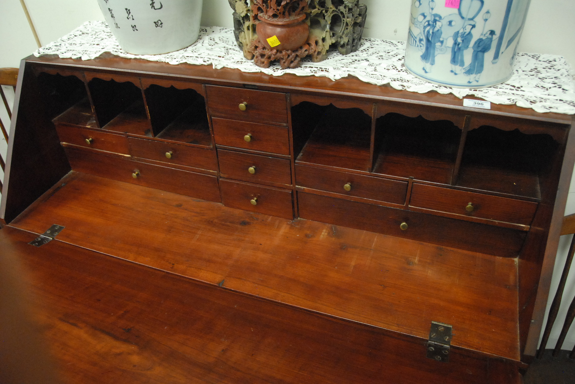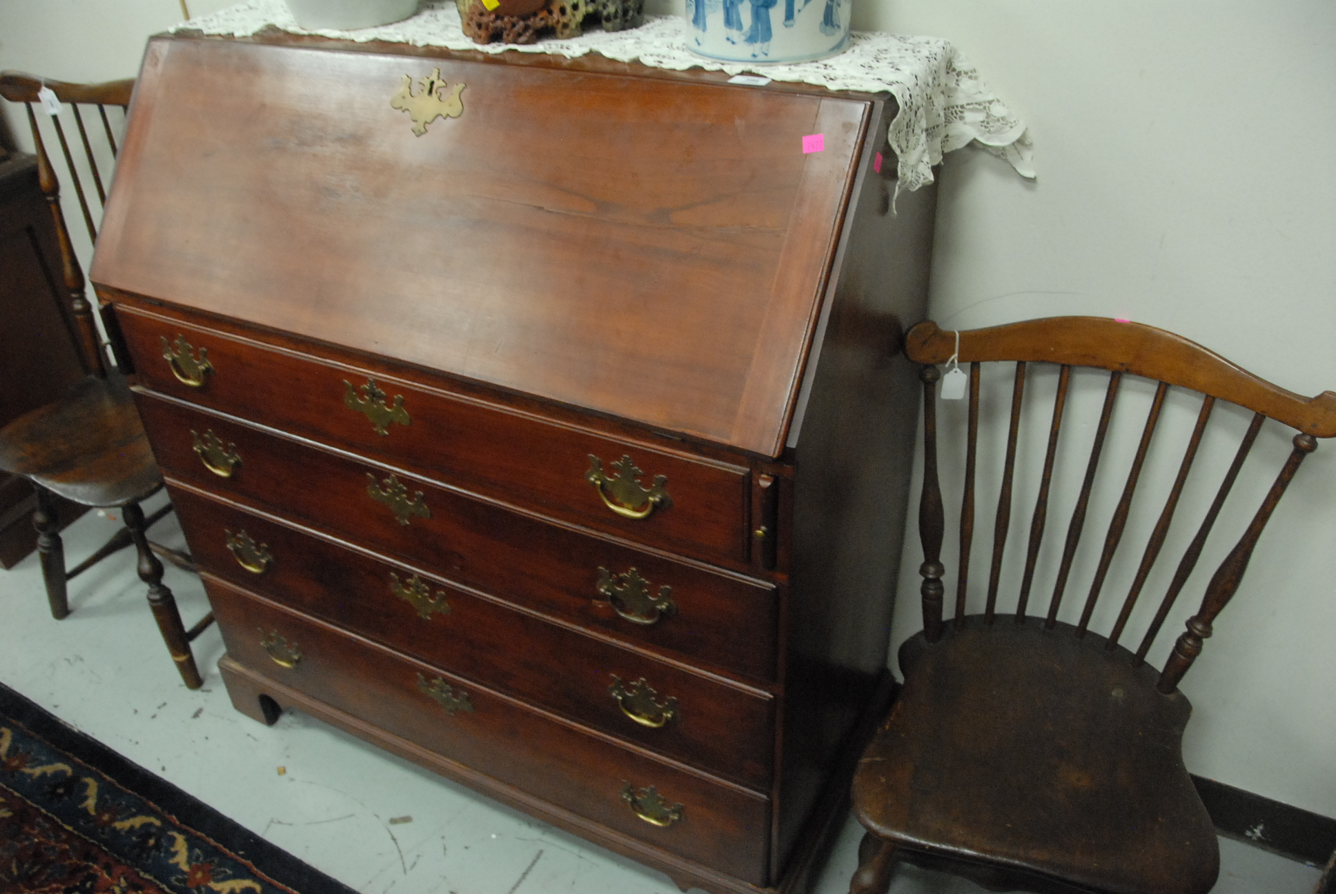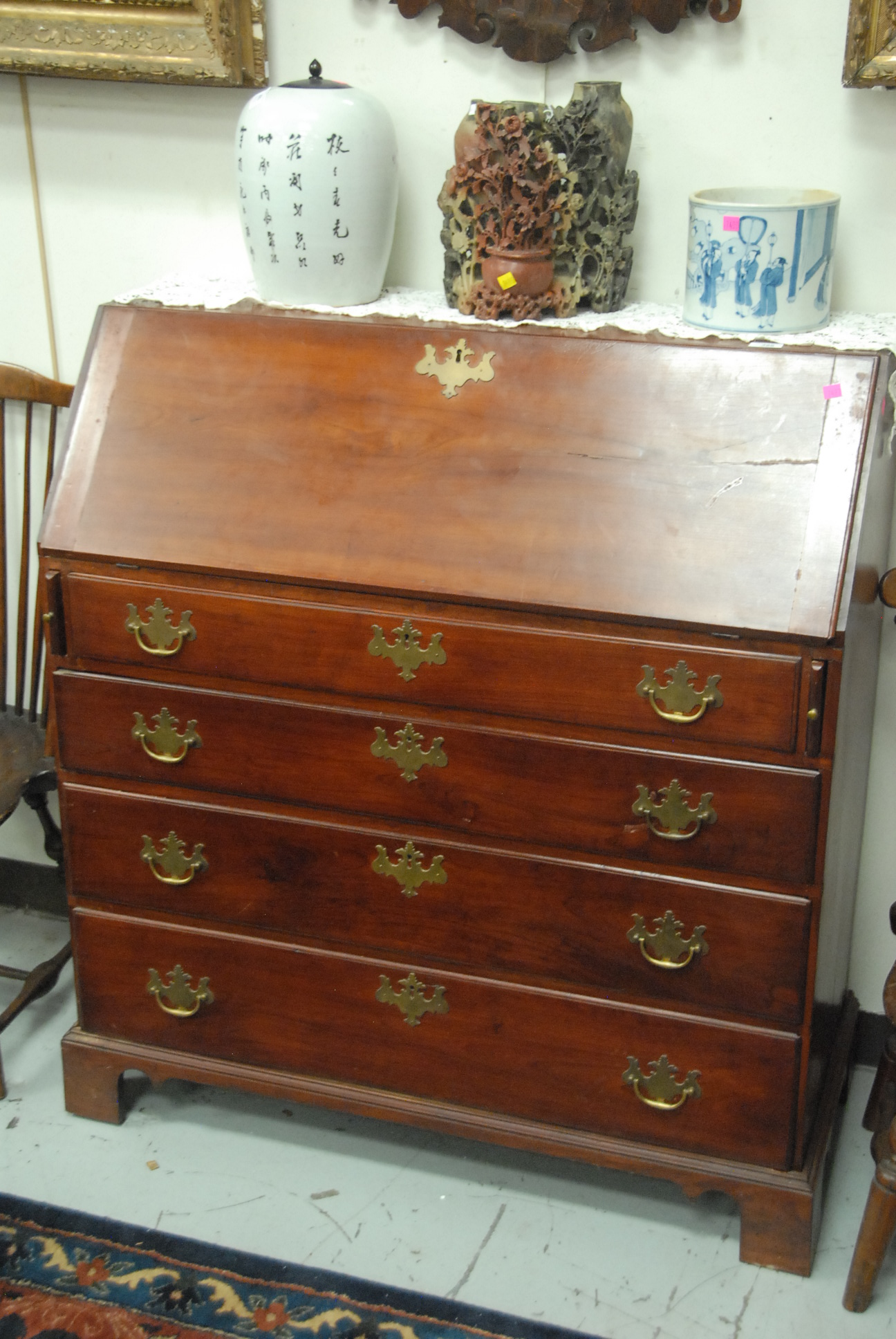 Lot 396: Chippendale desk having slant lid over four drawers set on cut out bracket feet, circa 1780. ht. 44 in. wd. 40 in. Provenance: Property from the Estate of Elizabeth and Edward Wallace of The Tracy House in Meriden, Connecticut.