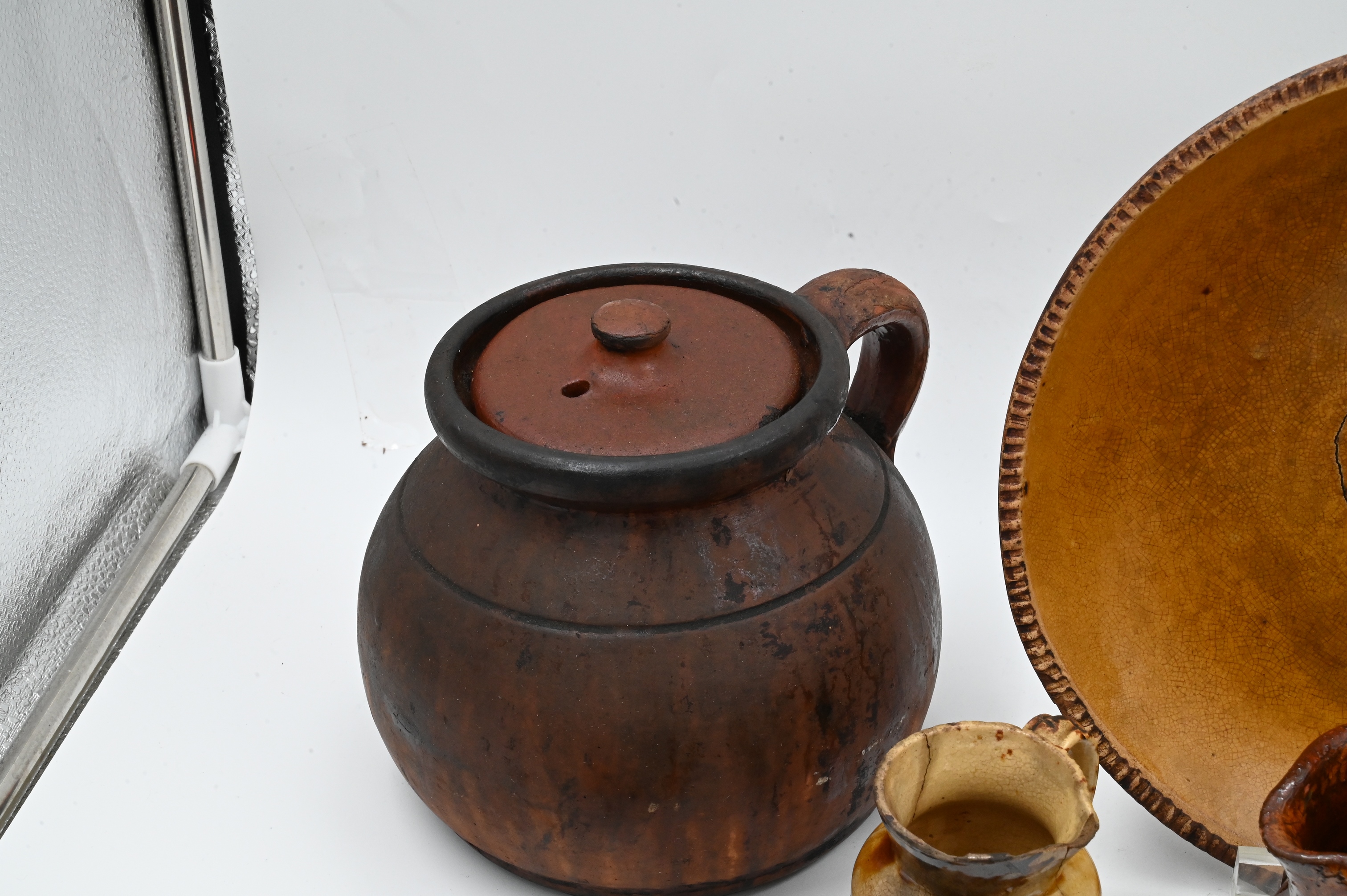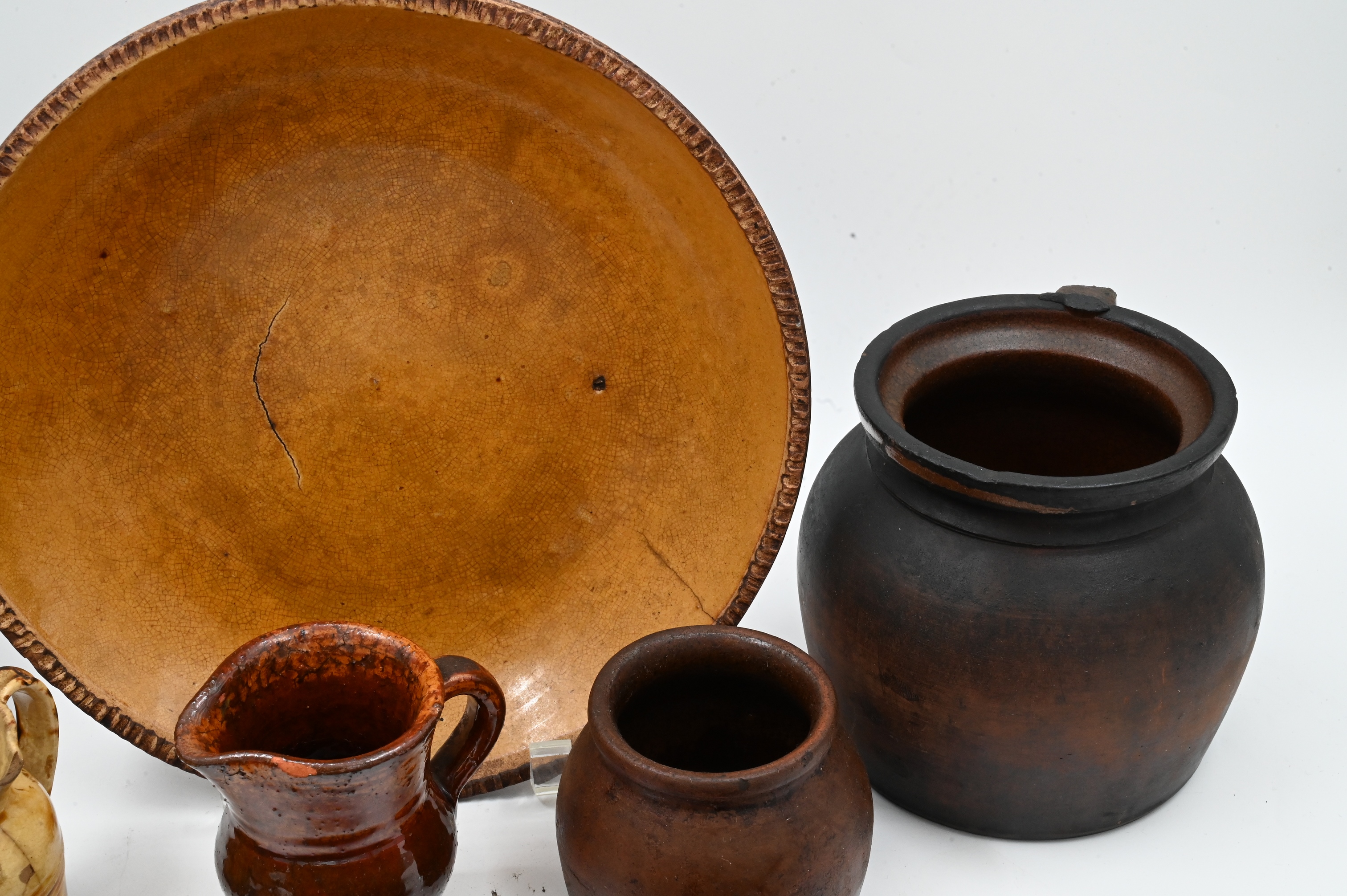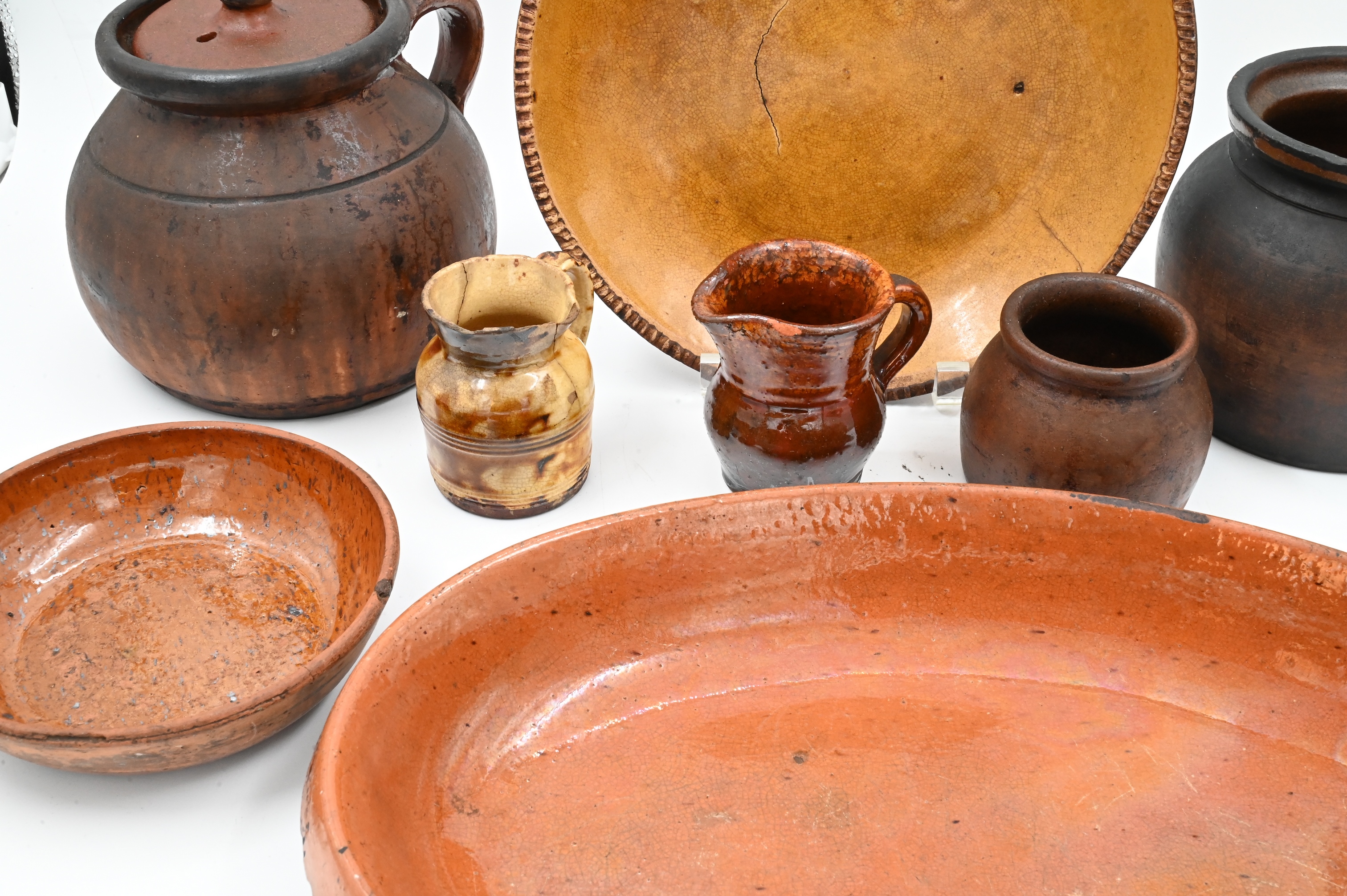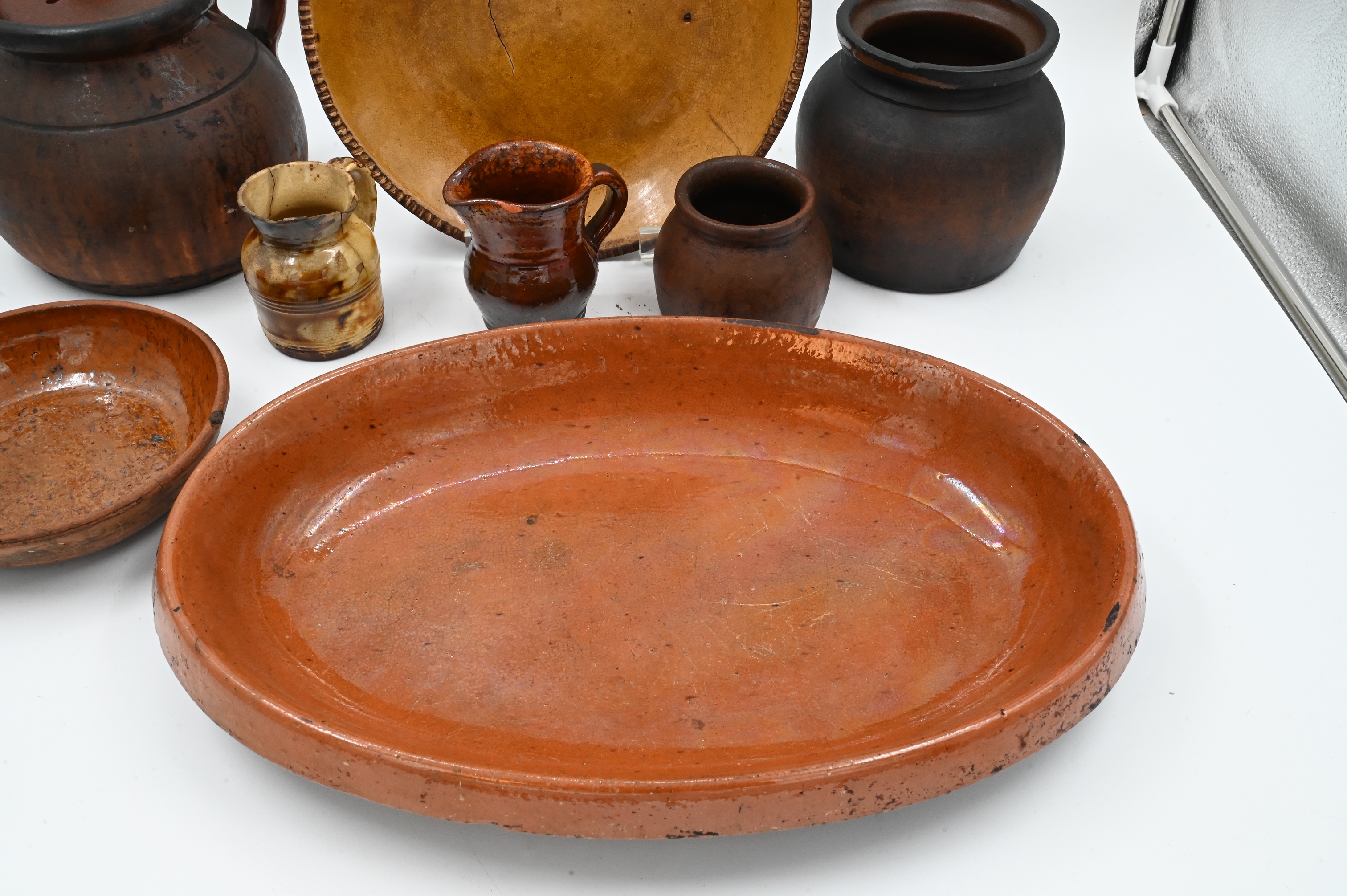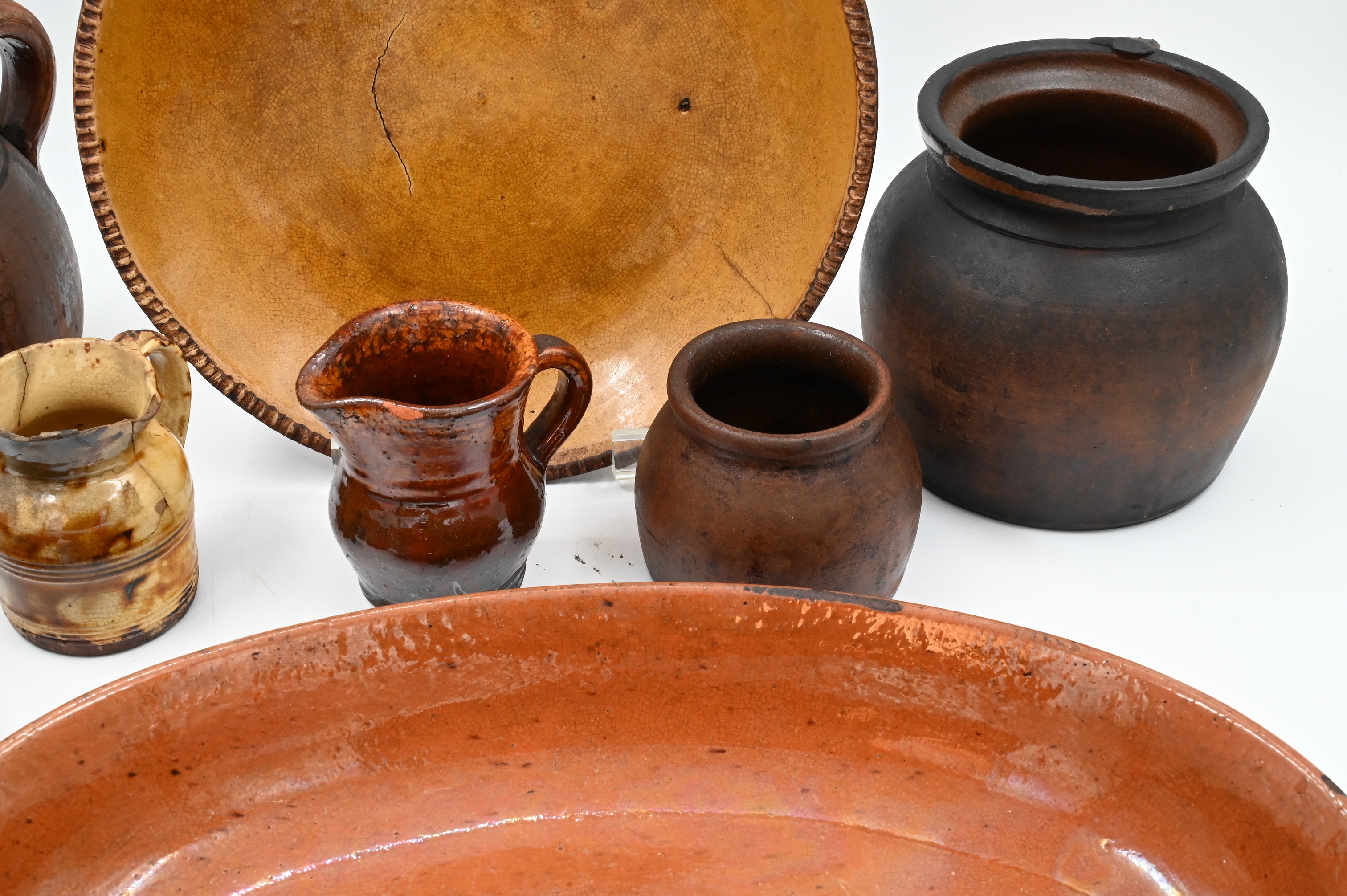 to include two small glazed pitchers, two large handled jars, oval platter, two bowls, small jar
