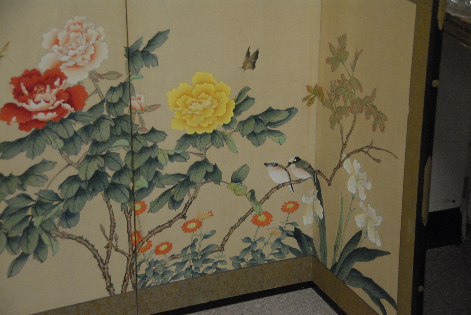 Lot 396: Four fold oriental screen of wild flowers and butterflies, watercolor on paper. lg. 72 in. ht. 36 in.