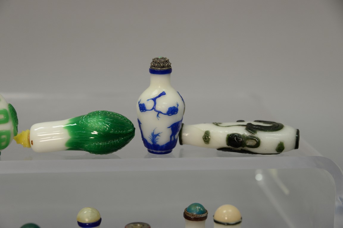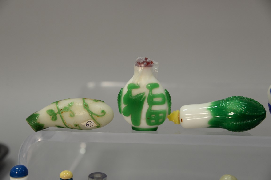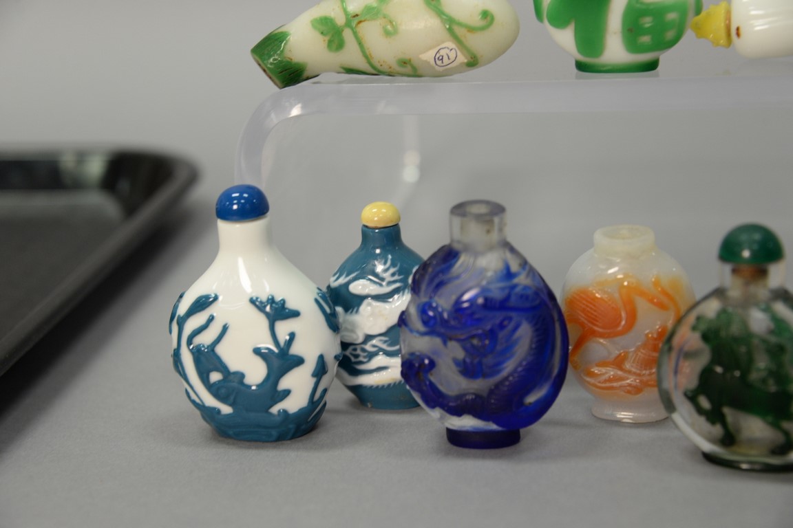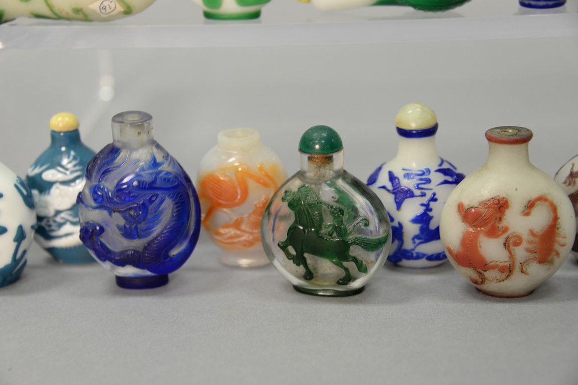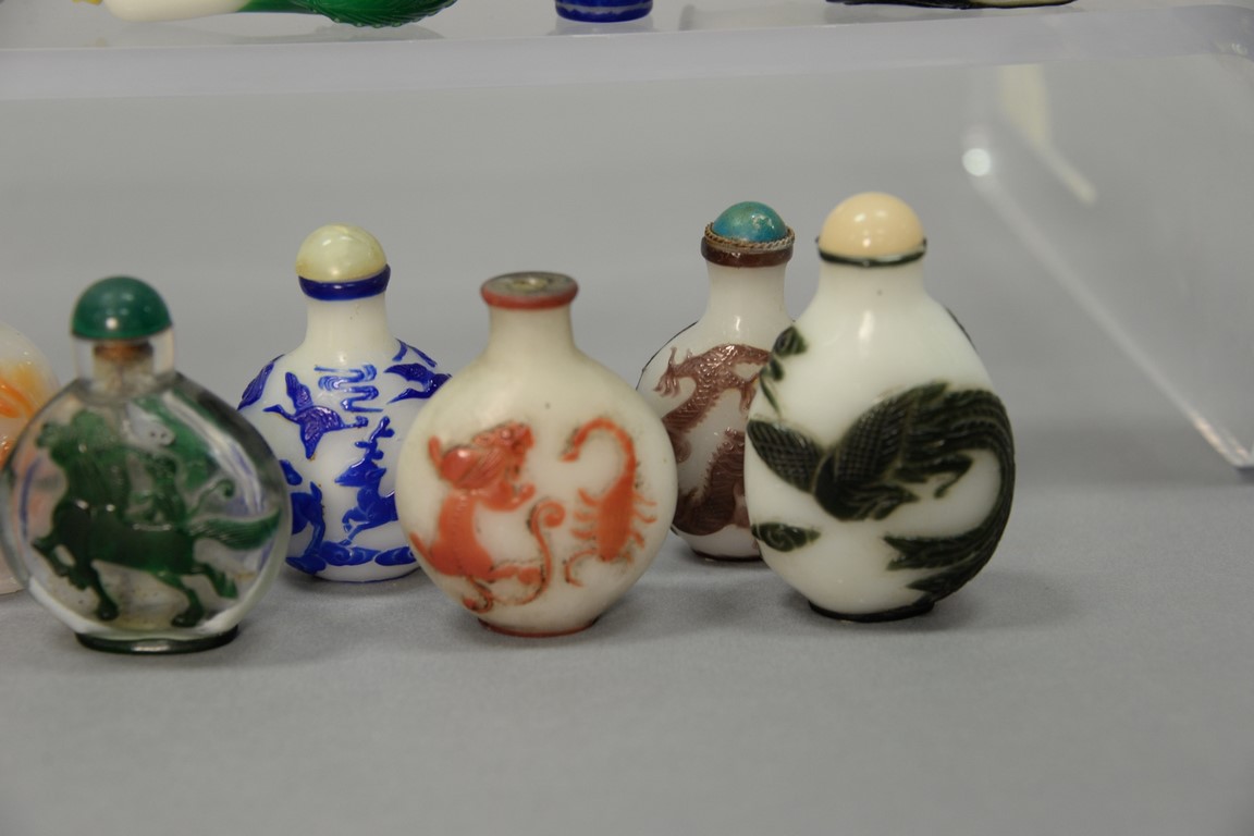 Lot 396: Fourteen overlay glass snuff bottles depicting deer, dragons, phoenix birds, goats, cranes, etc. ht. 2 1/4in. to 3in.